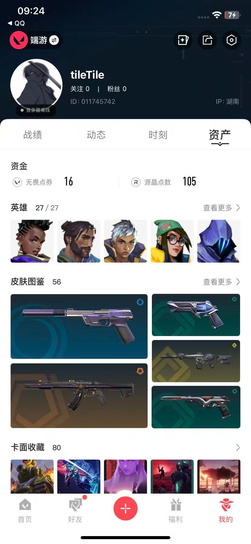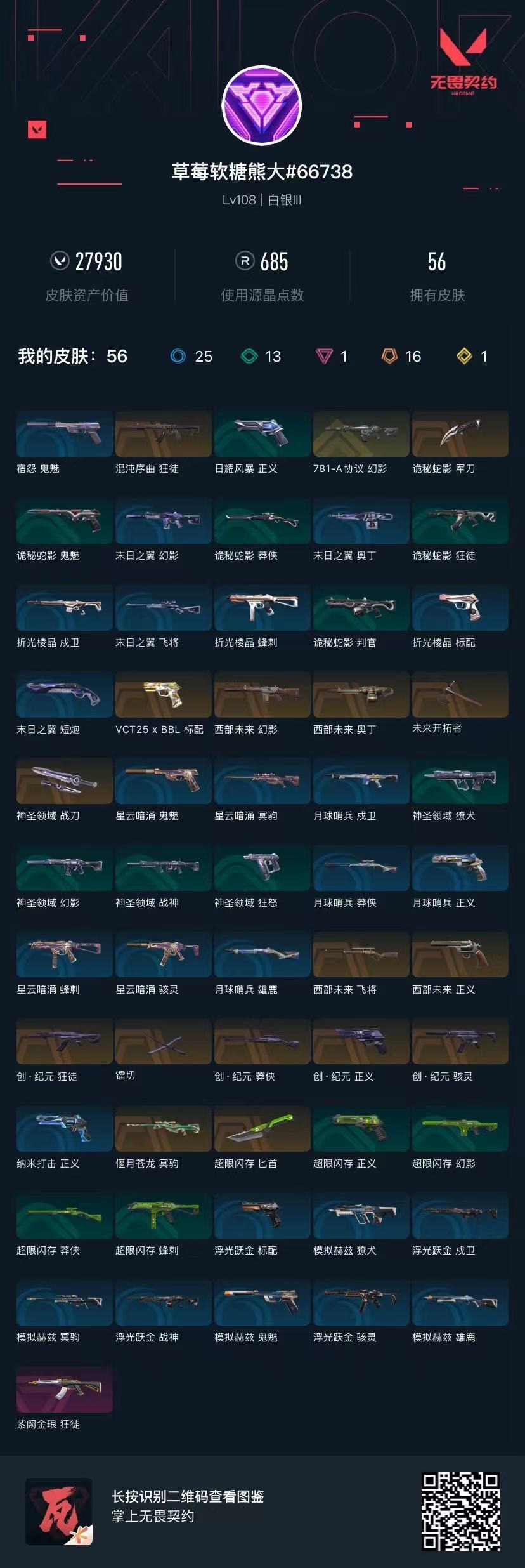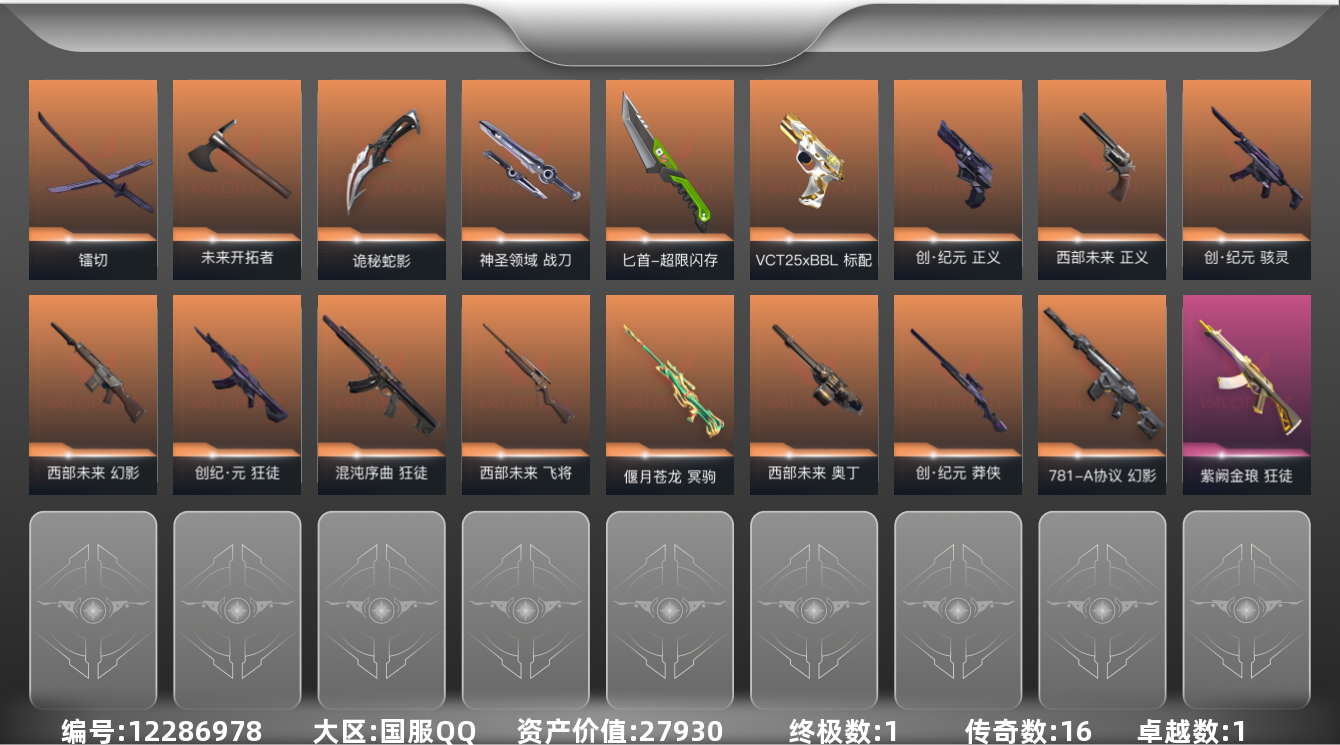 [12286978]16橙皮 1金皮 1紫皮 56皮肤 27英雄 80卡面 685已用源晶 白银 优质装备:冥驹-偃月苍龙,幻影-781-A协议,狂徒-混沌序曲,狂徒-紫阙金琅,匕首-超限闪存,镭切,神圣领域 战刀,未来开拓者,诡秘蛇影 套装:西部未来,创·纪元套装 佩枪皮肤:标配-VCT25xBBL,正义-创·纪元,正义-西部未来 冲锋枪皮肤:骇灵-创·纪元 步枪皮肤:幻影-西部未来,狂徒-创·纪元 狙击枪皮肤:莽侠-创·纪元,飞将-西部未来 机枪皮肤:奥丁-西部未来