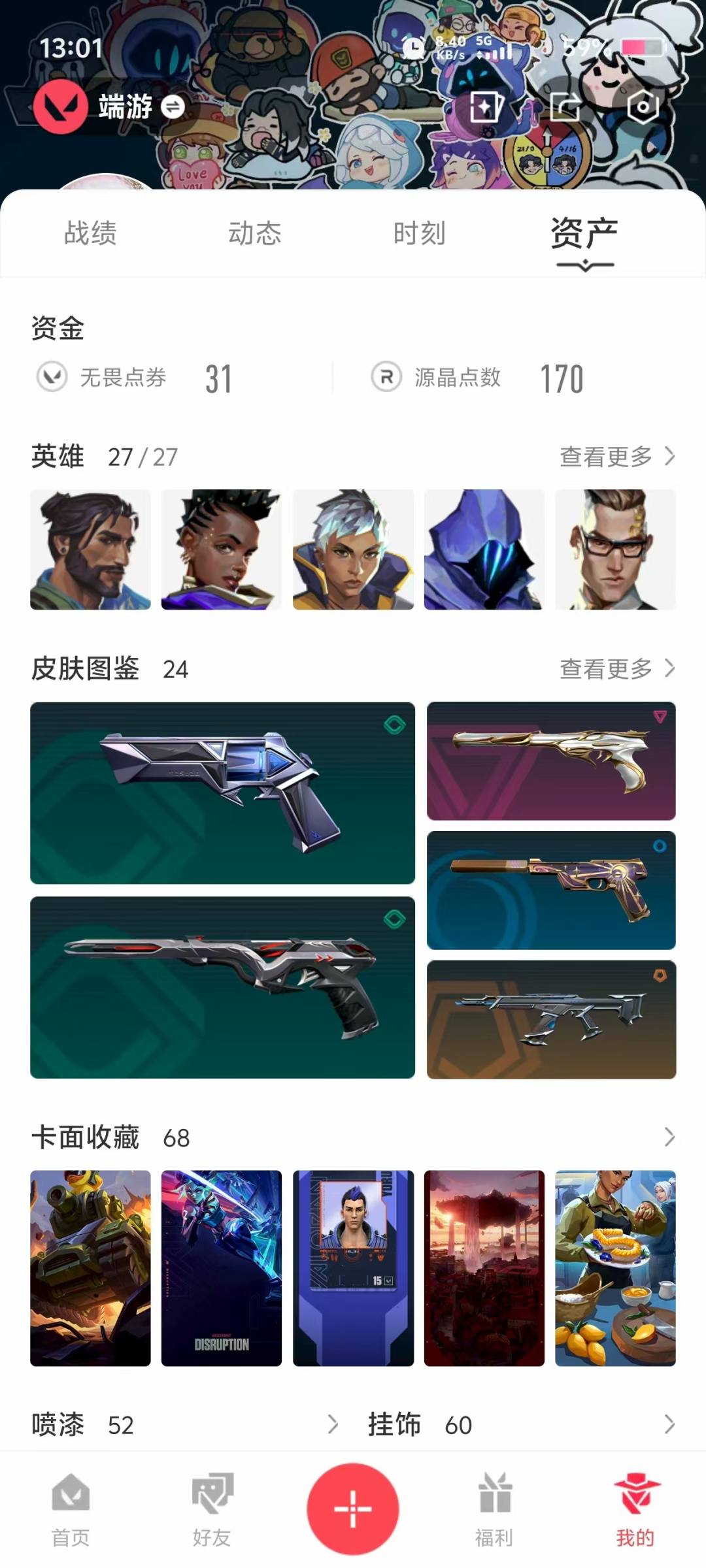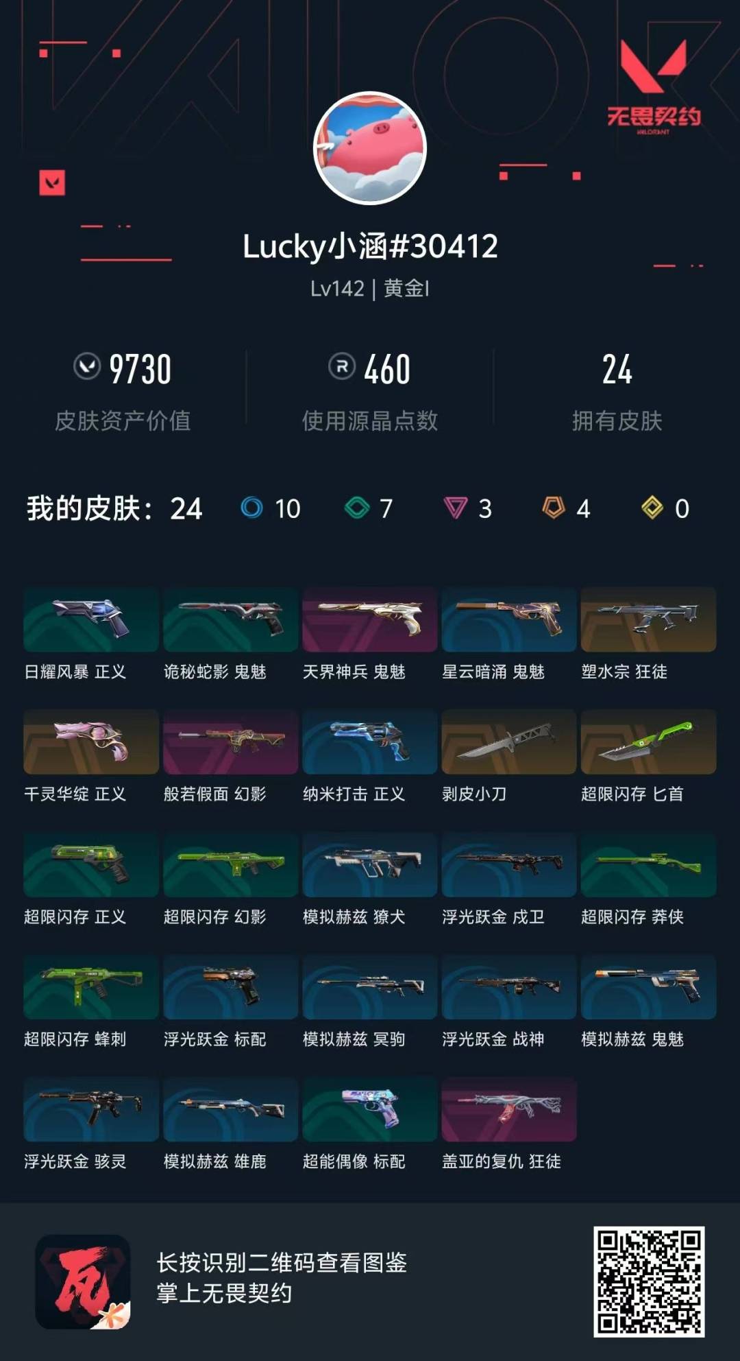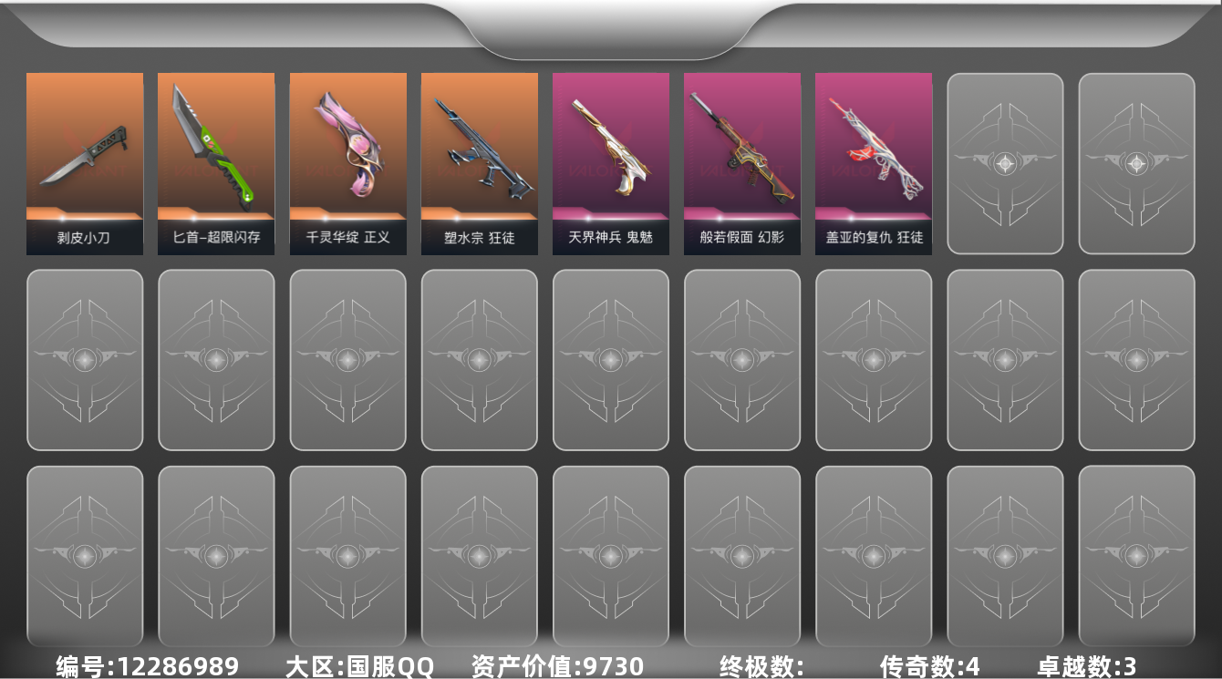 [12286989]4橙皮 3紫皮 24皮肤 27英雄 68卡面 460已用源晶 黄金 优质装备:狂徒-塑水宗,狂徒-盖亚的复仇,幻影-般若假面,正义-千灵华绽,鬼魅-天界神兵,剥皮小刀,匕首-超限闪存