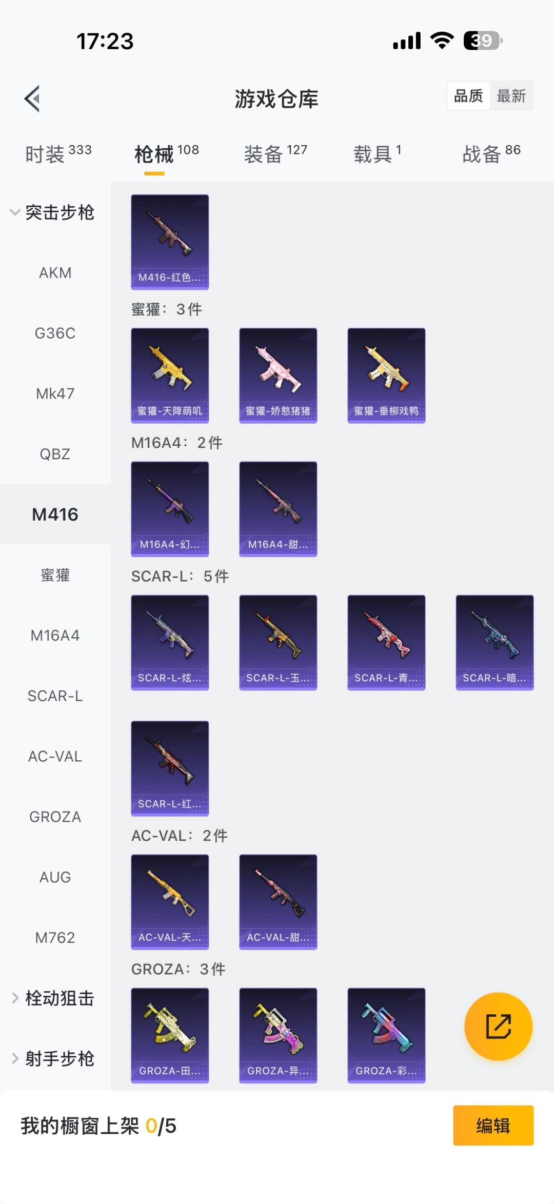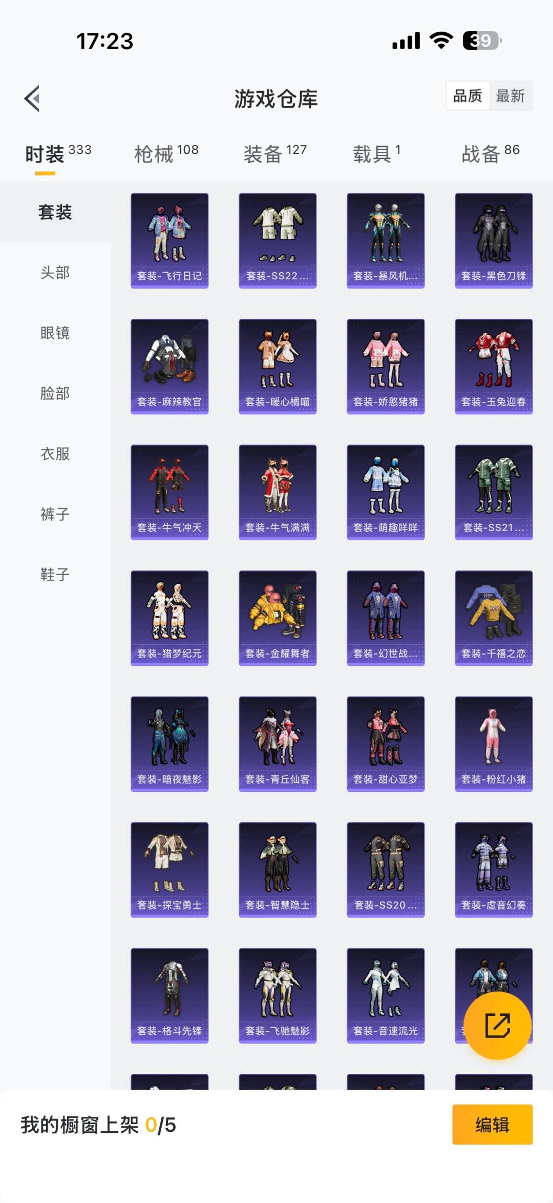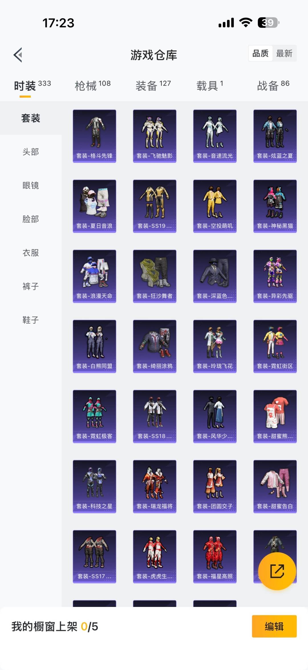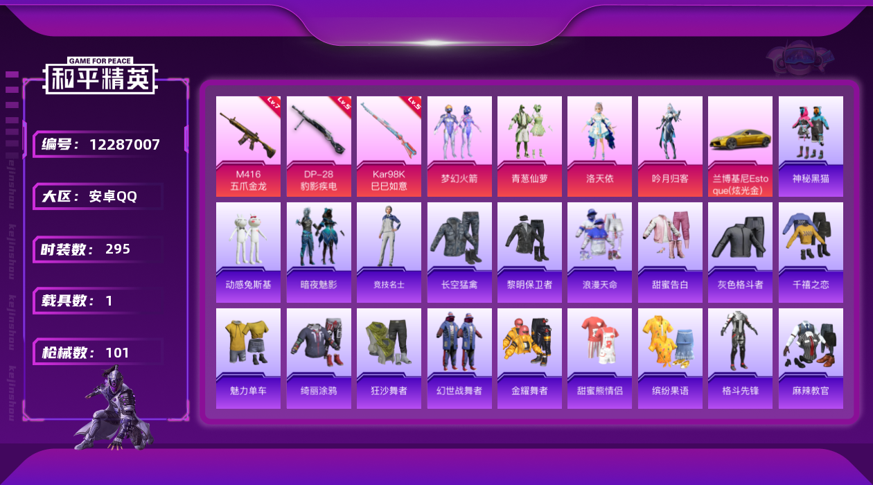 [12287007]4粉装 3特效枪 1载具 1印记 可二次 可修改实名 连体王者 优质装备:兰博基尼Estoque(炫光金),M416五爪金龙,梦幻火箭(新101)(新火箭少女101粉色套装),洛天依,七级M416-五爪金龙,Kar98K-巳巳如意 热门装扮:吟月归客,青葱仙萝,动感兔斯基,神秘黑猫,暗夜魅影 稀有枪皮:DP-28-豹影疾电 五级特效枪:五级Kar98K-巳巳如意,五级DP-28-豹影疾电 紫色装扮:SS23特训,田园牧歌,白啸长虹,轻风白浪,SS22特训,白兰地假日,夏日音浪,北国孤狼,千禧之恋,幻世战舞者,娇憨猪猪,暴风机械师,瑞龙福将,团圆交子,SS17特训,科技之星,SS15特训,暗夜傀儡,SS21特训,甜心亚梦,虚音幻奏,猎梦纪元,SS20特训,暖心橘喵,萌趣咩咩,异彩先驱,SS18特训,智慧隐士,飞驰魅影,音速流光,SS19特训,龙的传人,飞行日记,魅力单车,麻辣教官,黎明保卫者,长空猛禽,霓虹极客,霓虹街区,探宝勇士,炫蓝之夏,灰色格斗者,牛气冲天,牛气满满,深蓝色名流,格斗先锋,柠萌假日,绮丽涂鸦,缤纷果语,虎虎生威吉莉,狂沙舞者,王牌教练,甜蜜告白,甜蜜熊情侣,白熊同盟,福星高照,空投萌叽,湖畔霞光,玉兔迎春,巳巳如意,竞技名士,粉红小猪,浪漫天命,黑色刀锋,玲珑飞花,风华少年志,耀粉歌者,大橘大利,青丘仙客,金耀舞者 优质战备:千面幻镜降落伞,彩虹甜喵降落伞,歌者泠鸢飞行器,妙趣可丽降落伞,飞行器-庄周梦蝶,神秘黑猫降落伞,夏日绵绵冰降落伞,暗夜玫瑰降落伞,蓝莓炮弹降落伞