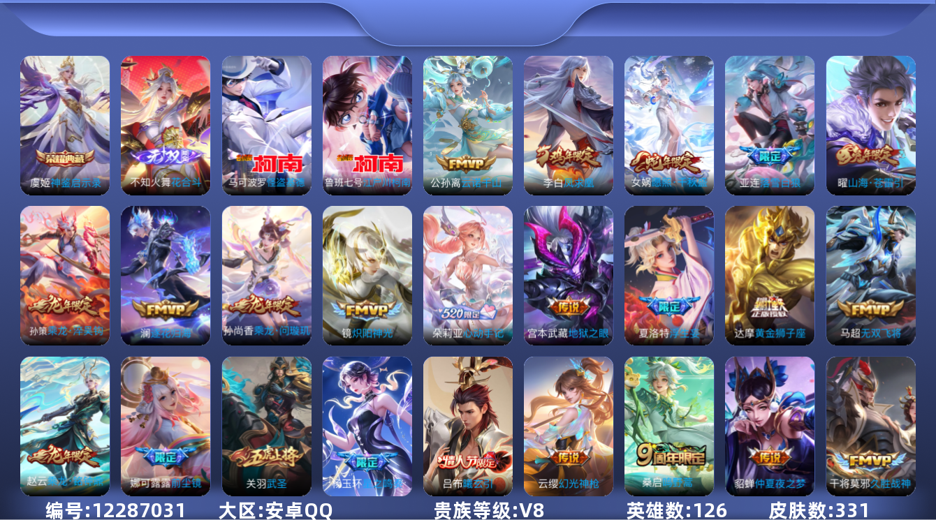 [12287031]V8 1典藏 1无双 2珍品传说 29传说 126英雄 331皮肤 典藏英雄武则天 可修改实名 优质装备:神鉴启示录,花合斗,江户川柯南,怪盗基德,黄金狮子座,久胜战神,炽阳神光,仲夏夜之梦(大飞蛾),海洋之心,地狱之眼,无双飞将,山海·苍雷引(电光曜子),浮生妄,百相守梦(张飞),妄想实况,澜逐花归海,琥珀纪元铠,朵莉亚心动手记 传说皮:乘龙·问璇玑(孙尚香年限),乘龙·铭钟鼎(赵云年限),乘龙·淬吴钩(孙策年限),吕布曦玄引,落雪白狼,云诺千山,星之鸣奏,幻光神枪 珍宝阁皮:妄想食味,胡桃夹子 限定皮:愿照·千秋盛(女娲年限),逐霄战戟,映山客,陌上桑,鸣野蒿,至尊宝,凤求凰(白切鸡),凤凰于飞,前尘镜,山海·碧波行(瑶年限),遇见飞天,高山流水,五谷丰年,武圣,游园惊梦,梁祝,逐梦之音,李小龙,逐梦之影,逐梦之光,朱雀志(守约年限),如梦令-后羿,纯白花嫁,蜜橘之夏 史诗皮:鸭鸭历险记-刘禅,绮世丹青,化蝶舞,星界战将,茶境仙,怒海争锋,撼地雄心,破空之剑,战舞者,东方月初,蒙犽顽岩魄,海诺心动手记,蔬乡物语(鲁班七号),百相守梦-百里守约,紫霞仙子,苍穹之光,电玩小子(小书包),白龙吟,黄金分割率,特工魅影,千年之狐,百解令(蒙犽),高渐离燃音魔法,蒙恬荣光圣徽,无限星赏官,冰冠公主,偶像歌手,电玩·爆裂旋风,龙骑士(小龙虾),末日机甲-吕布,猫狗日记-孙策,猫狗日记-大乔,节奏热浪,女仆咖啡,摇滚巨星,水果甜心,绅士熊喵,天才门将,星夜王子,心灵骇客,功夫厨神,德古拉伯爵,暗隐猎兽者,幽灵船长,鬼剑武藏,心灵战警,天秀·启明,舞动绿茵,纤云弄巧,缤纷独角兽,乘风破浪,逐浪之夏,月团寄思,水晶猎龙者,箭羽风息,金属风暴,原初追逐者,鹰眼统帅,魅力维加斯,黎明之约,未来纪元-赵云