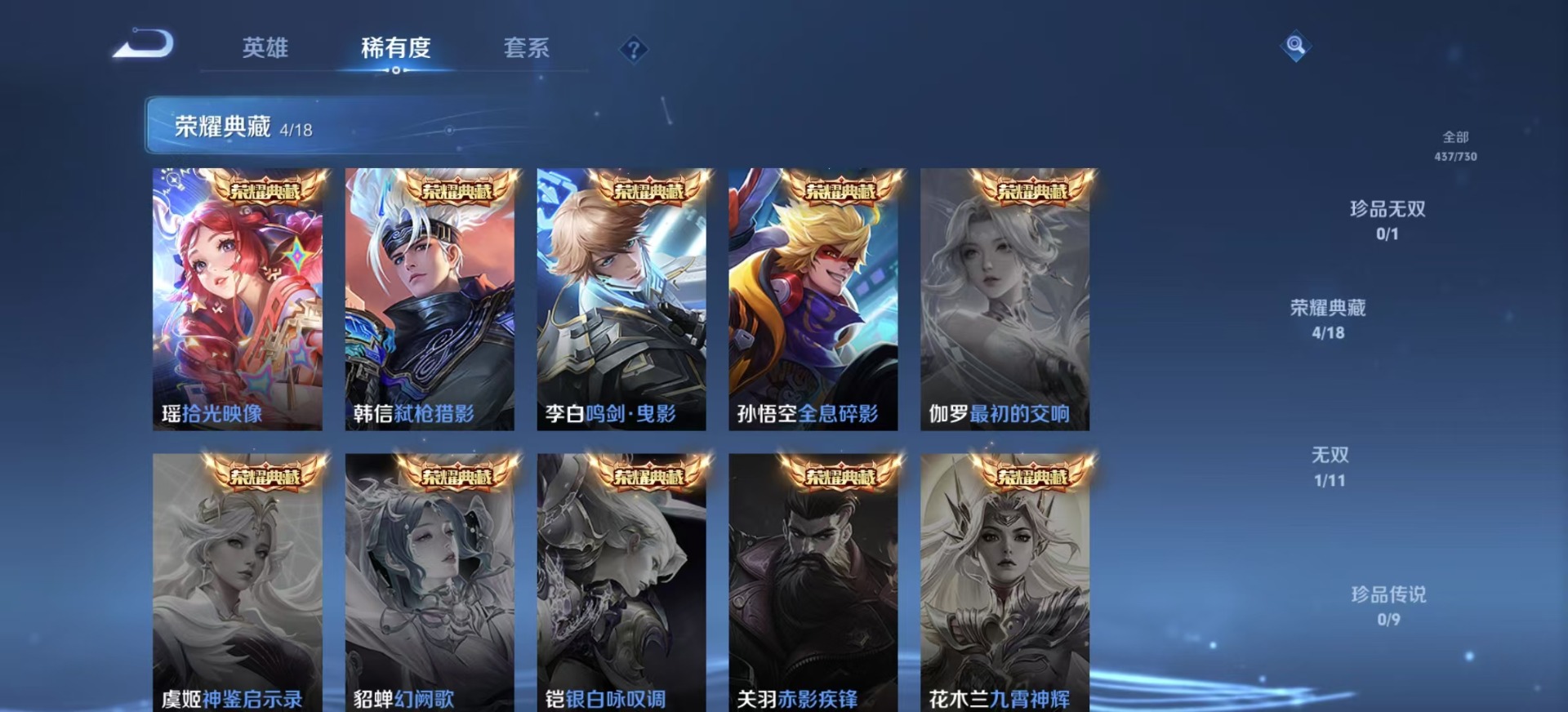 金蝉唐三藏,夏侯惇匿光决锋者,黄忠烈魂,铠青龙志,廉颇寅虎·御盾,伽罗太华,赵云百木心枪,孙尚香异界灵契,鲁班七号寅虎·瑞焰,后羿无尽星芒,吕布御风骁将,露娜启示之音,镜匿光追影者,公孙离玉兔公主,公孙离蜜橘之夏,鲁班大师匿光启智者,裴擒虎寅虎·赤拳,上官婉儿梁祝,上官婉儿神器·万象笔,上官婉儿天狼绘梦者,李白诗剑行,花木兰瑞麟志,马可波罗山海·玄木吟,马可波罗深海之息,西施至美·乘鲤谣,桑启鸣野蒿,女娲补天,女娲愿照·千秋盛,孙悟空孙行者,马超神威,韩信傲雪梅枪,韩信飞衡,韩信逐梦之影,百里守约朱雀志,墨子降魔,王昭君凤凰于飞,王昭君星穹之声