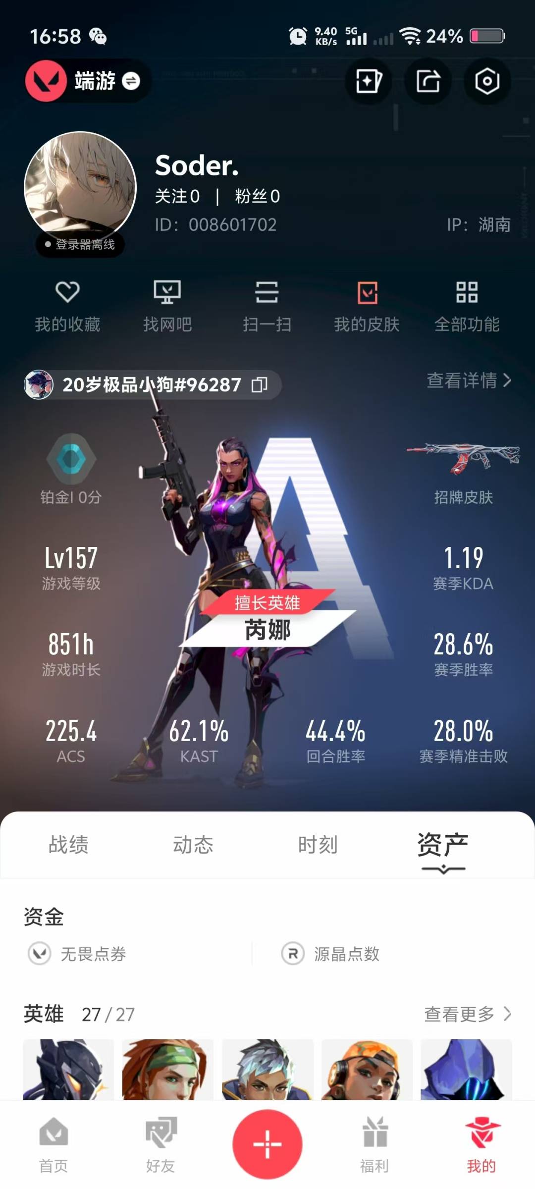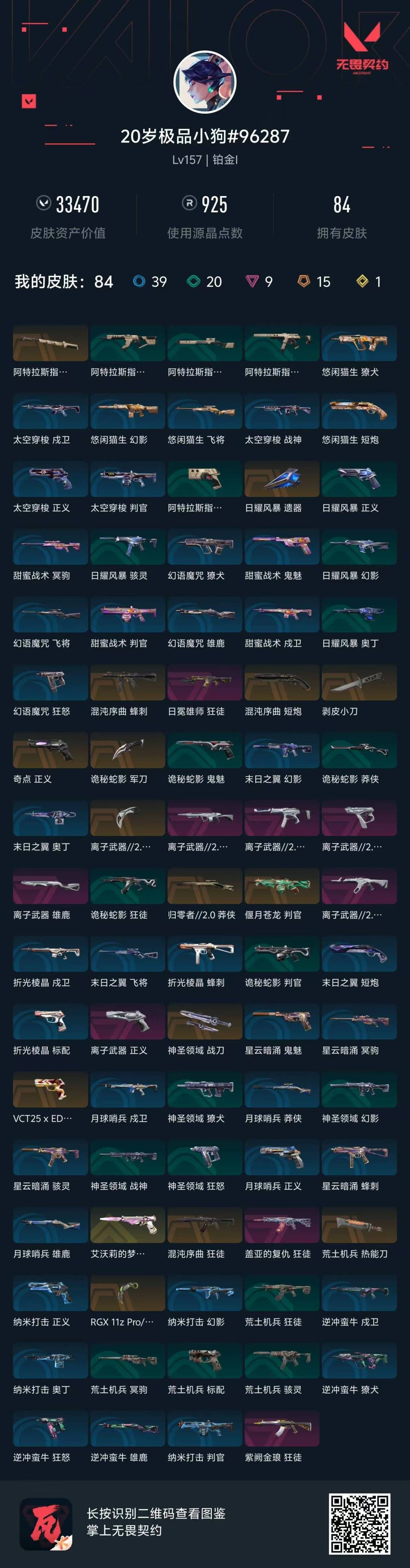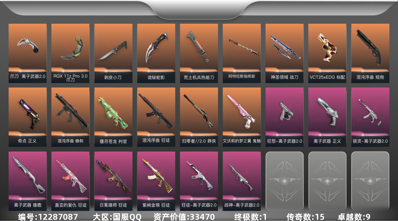 [12287087]15橙皮 1金皮 9紫皮 84皮肤 27英雄 104卡面 925已用源晶 铂金 优质装备:正义-奇点,狂徒-混沌序曲,狂徒-紫阙金琅,狂徒-盖亚的复仇,正义-离子武器,狂徒-日冕雄师,判官-偃月苍龙,剥皮小刀,鬼魅-艾沃莉的梦之翼,爪刀-RGX 11z Pro 3.0,荒土机兵热能刀,神圣领域 战刀,离子武器2.0 爪刀,诡秘蛇影,阿特拉斯指挥部,雄鹿-离子武器 套装:离子武器2.0 佩枪皮肤:标配-VCT25xEDG,狂怒-离子武器2.0,短炮-混沌序曲 冲锋枪皮肤:骇灵-离子武器2.0,蜂刺-混沌序曲 步枪皮肤:狂徒-离子武器2.0 狙击枪皮肤:莽侠-归零者//2.0 机枪皮肤:战神-离子武器2.0