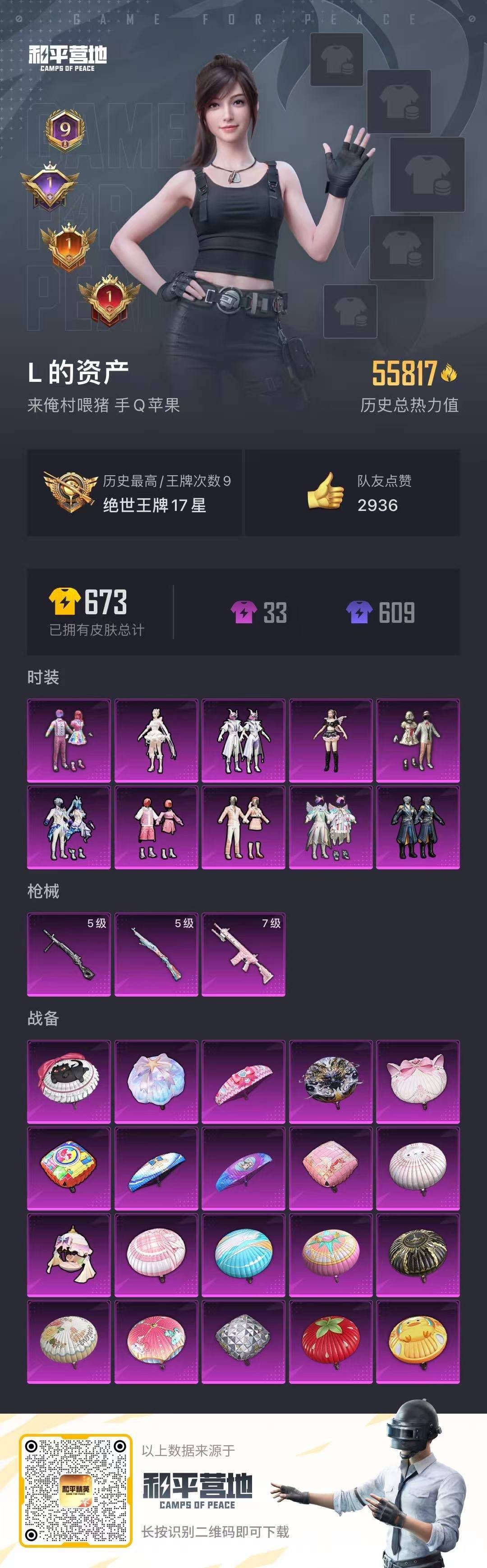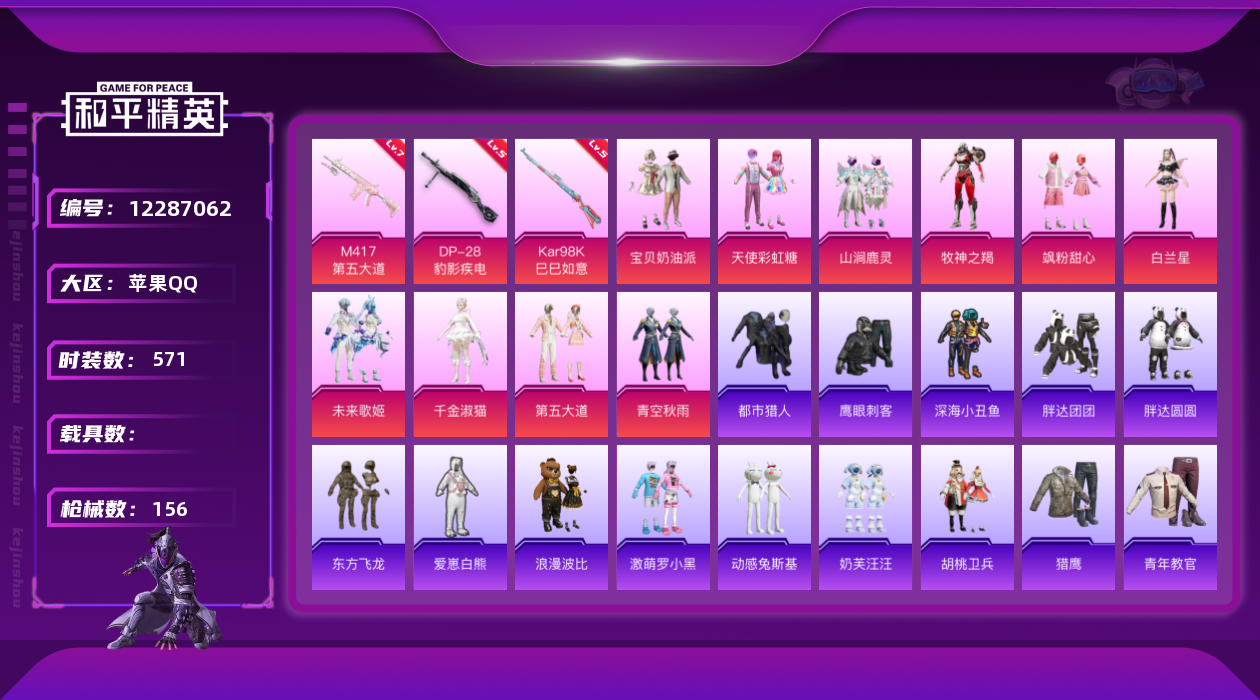 [12287062]10粉装 3特效枪 9印记 可二次 可修改实名 身法装备:都市猎人,暗影哥特(红眼罩) 优质装备:都市猎人,宝贝奶油派,天使彩虹糖,M417第五大道,七级M417-第五大道,千金淑猫,Kar98K-巳巳如意 热门装扮:山涧鹿灵,青空秋雨,第五大道,飒粉甜心,未来歌姬,白兰星,牧神之羯,动感兔斯基,胖达圆圆,胖达团团,奶芙汪汪,激萌罗小黑,鹰眼刺客,爱崽白熊,深海小丑鱼,东方飞龙,浪漫波比,都市猎人,胡桃卫兵 稀有枪皮:DP-28-豹影疾电 五级特效枪:五级Kar98K-巳巳如意,五级DP-28-豹影疾电 紫色装扮:田园牧歌,轻风白浪,和煦暖阳,SS22特训,莱茵河畔,孙悟空,飞狐塔尔斯,SS23特训,幻彩翩翩,灵蜜圈圈,妙红点点,香榭午后,活力清阳,跃动晴空,龙舌兰冰茶,白兰地假日,娇憨猪猪,梦幻奶油,夏雨游龙,萌趣咩咩,SS21特训,熠彩粉晶,SS31特训套装,人气偶像,冰川特警,冷焰舞者,SS33特训套装,青涩时光,SS20特训,诡面顽熊,猎梦纪元,飞驰魅影,音速流光,SS19特训,粉团憨憨,甜心亚梦,虚音幻奏,浓情蜜辣,瑞龙福将,团圆交子,SS17特训,沁蓝冰爽,SS18特训,都市魅力,酒红色名流,酷潮明星,野性战心,长空猛禽,霓虹街区,青年教官,风暴特警,缤纷果语,苍穹猎鹰,荣耀,荧惑魅影,蓝彩潮人,蓝色运动,街头潮人,飞行日记,魅力单车,鹤鸣,麻辣教官,黄色伏地魔,黄色名流,黄色运动,黑色伏地魔,龙的传人,龟仙人,沙漠毒蛇,极地朋克,柠萌假日,橘黑制服,沙漠兵团,涂山之恋,深蓝色名流,幻影武者,坚韧舞者,夏日倾情,完美偶像,帅气教官,幻世战舞者,战地督导,探宝勇士,湖蓝色名流,绮丽涂鸦,白色伏地魔,破蛋小黄鸡,福星高照,空投萌叽,竞技达人朋克,红色运动,甜蜜熊情侣,王牌教练,牛气冲天,炫蓝之夏,牛气满满,猛禽,特殊使命,特训学院,狂战萌兔,猎鹰,SS28特训,卖崽青蛙,玉兔迎春,都市丽猫,竞技名士,摩登魅猫,暗影哥特(红眼罩),春野茶蘼,惊鸿侠骨,甜梦熊熊,神气柴柴,懵萌河马,SS24特训(SS24特训套装),萤火魅影(套装-荧惑魅影),SS25特训,元气发射,锦衣飞扬,牛仔情诗,浪漫天命,SS26特训,春光漫游,快闪甜心,淡雅花蕊,隐空刺,耀粉歌者,SS32特训服(SS32特训套装),青玉碎影,绯格组合,糖霜甜心,漫步者,冰冻风暴,魅影蝠王,光之冒险