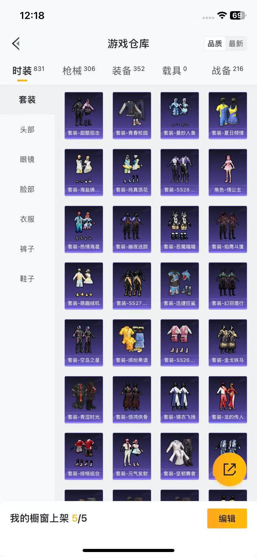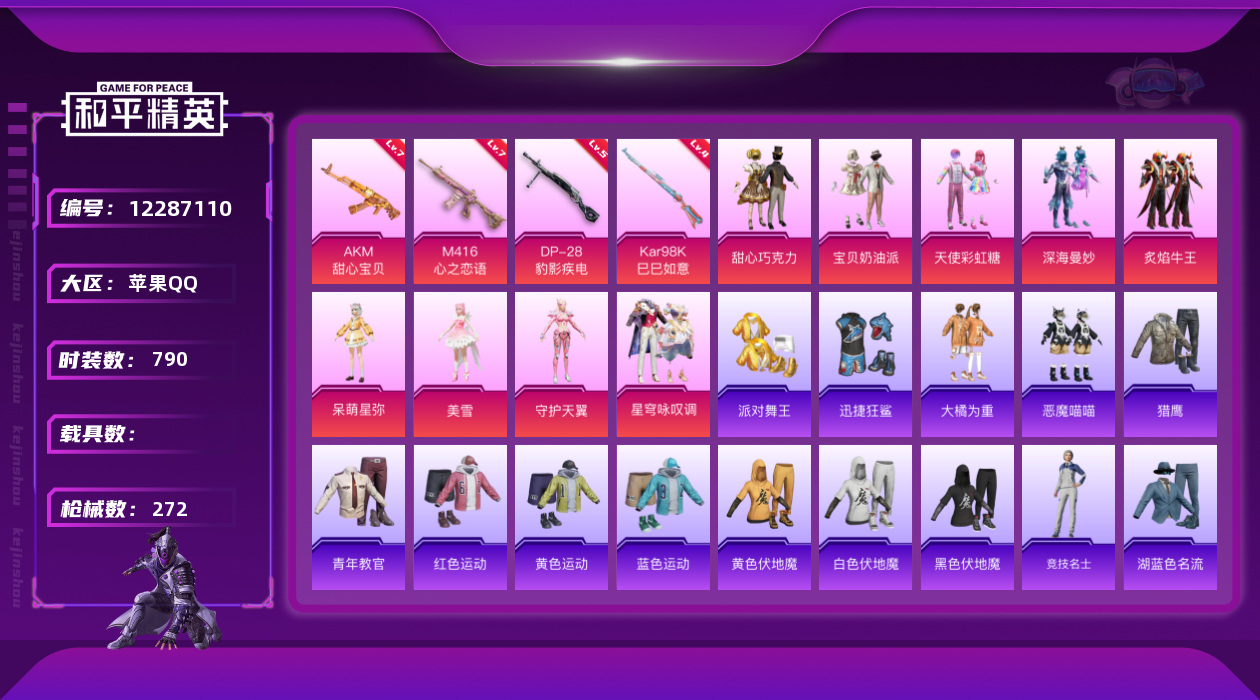 [12287110]9粉装 4特效枪 18印记 可二次 可修改实名 身法装备:舞王派对(派对舞王、小金鞋),Mark.06(新蓝螳螂),萌熊伴侣背包(粉熊背包) 优质装备:甜心巧克力,舞王派对(派对舞王、小金鞋),萌熊伴侣背包(粉熊背包),AKM甜心宝贝,M416心之恋语,深海曼妙,宝贝奶油派,天使彩虹糖,七级M416-心之恋语,七级AKM-甜心宝贝,星穹咏叹调,Kar98K-巳巳如意 热门装扮:炙焰牛王,呆萌星弥,美雪,守护天翼,恶魔喵喵,大橘为重,迅捷狂鲨,派对舞王(小金鞋) 稀有枪皮:DP-28-豹影疾电 五级特效枪:五级DP-28-豹影疾电 四级特效枪:四级Kar98K-巳巳如意 紫色装扮:田园牧歌,轻风白浪,SS22特训,SS23特训,幻彩翩翩,妙红点点,照水倚天,娇憨猪猪,萌趣咩咩,SS21特训,SS31特训套装,SS5特训,冰川特警,冰焰天使,凛冬战士,北国孤狼,旭日情侣,SS30特训套装,云朵鹅,雪绒豹,SS33特训套装,青涩时光,SS20特训,潮流游乐家,SS15特训,暗夜傀儡,蝎王蛇后,迪迦奥特曼,时空追击者,暴风机械师,SS16特训,银白舞王,SS13特训,猎梦纪元,飞驰魅影,音速流光,SS19特训,军刀雅典娜,甜心亚梦,虚音幻奏,瑞龙福将,团圆交子,醒狮腾龙,SS17特训,炫光向阳,异彩先驱,SS18特训,都市魅力,野性山猫,野性战魂,长空猛禽,雪山征服者,雪山精英,霓虹极客,霓虹街区,青年教官,青春校园,迎春赐吉,缤纷果语,耀眼新星,荣耀,蓝色守护者,蓝色运动,街头潮人,跃动心情,龙腾端午,魅力单车,黄色伏地魔,黄色运动,黑色伏地魔,龙的传人,龟仙人,冰河战士,龙魂突击队,蝶变,香桃花海,缤纷假日,沙漠毒蛇,极速红龙,柠萌假日,格斗先锋,沙漠兵团,海岛探路者,圣诞大吉,坚韧舞者,夏日倾情,夏日音浪,夜莺强袭者,幻世战舞者,战地菁英,探宝勇士,湖蓝色名流,绮丽涂鸦,疯狂小兔子,白色伏地魔,破蛋小黄鸡,神秘领域,甜蜜告白,福星高照,空岛之星,突袭者,竞技勇士朋克,竞技达人朋克,红色运动,甜蜜熊情侣,王牌教练,牛气冲天,灰色格斗者,灼焰舞者,炫蓝之夏,熔岩使者,燃烧卡路里,牛气满满,狂沙舞者,猎鹰,镭射皇者,小熊娃娃,雏菊兔兔,萝兰蝴蝶,SS29特训,拉斐尔,星途旅人,纯真浪花,热情海星,曼妙人鱼,SS28特训,甜酷狙击,Mark.06(新蓝螳螂),鱼渊荷华,玉兔