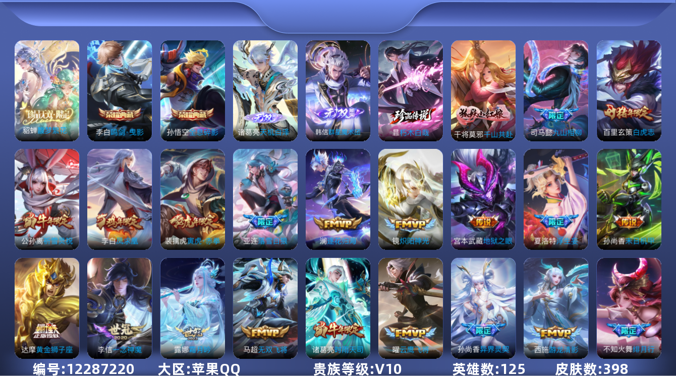 [12287220]V10 2典藏 1珍品无双 2无双 1珍品传说 37传说 125英雄 398皮肤 可修改实名 优质装备:馥梦繁花,鸣剑·曳影,全息碎影(猴子典藏),韩信群星魔术团(韩信无双),天机白泽,朽木白哉,黄金狮子座,黄金射手座,冠军飞将,云鹰飞将(小将军),黄金白羊座,猫影幻舞,久胜战神,炽阳神光,一念神魔,云霓雀翎,末日机甲-孙尚香(绿蚂蚱),仲夏夜之梦(大飞蛾),地狱之眼,胖达荣荣,时之恋人-刘备(电焊工),游龙清影(小青龙),淬星耀世,超时空战士-狄仁杰,花朝如约(花篮子),无双飞将,浮生妄,霜月吟,澜逐花归海,艾琳觅芳踪,千山共赴,涂山容容 传说皮:落雪白狼,九山相柳 珍宝阁皮:蔷薇恋人,女武神 限定皮:白虎志(电光耗子),凤求凰(白切鸡),异界灵契(白毛香),傲雪梅枪,寅虎·展翼(孙膑年限),绯月行,时之彼端,白鹤梁神女,时雨天司(水龙头),神威(电光马子),飞衡(韩信年限),遇见飞天,高山流水,怒海麟威,五谷丰年,冰锋战神,游园惊梦,梁祝,御风骁将(吕布年限),天狼狩猎者,逐梦之星,逐梦之音,天狼征服者,奔雷神使(牛魔年限),祈雪灵祝(雪兔子),李小龙,逐梦之影,玄武志(苏烈年限),朱雀志(守约年限),猪悟能,引擎之心,青春决赛季,冰霜恋舞曲,神奇女侠,美猴王,寅虎·赤拳(老虎年限),百木心枪,枫霜尽 史诗皮:赞萌露比,灵蛊蚀心,鸭鸭历险记-刘禅,龙之律动,小牛鸭,石田雨龙,百相守梦-周瑜,幻珠鲛人,守夜人,百相守梦-黄忠,织梦人,紫霞仙子,苍穹之光,电玩小子(小书包),黄金分割率,特工魅影,千年之狐,江河有灵,蒙恬荣光圣徽,晚萤,魅语,无限星赏官,冰冠公主,偶像歌手,电玩·爆裂旋风,银翎春语,末日机甲-吕布,猫狗日记-孙策,猫狗日记-大乔,时之恋人-孙尚香,乱世虎臣,节奏热浪,修罗,女仆咖啡,摇滚巨星,水果甜心,绅士熊喵,天才门将,星夜王子,心灵骇客,时之奇旅-安琪拉,功夫厨神,德古拉伯爵,暗隐猎兽者,幽灵船长,鬼剑武藏,心灵战警,乐园奇幻夜,舞动绿茵,地狱岩魂,纤云弄巧,繁星吟游(呼啦呼啦),拒霜思,缤纷独角兽,乘风破浪,逐浪之夏,水晶猎龙者,曙光守护者,热力回旋,箭羽风息,金属风暴,原初追逐者,圣诞狂欢,圣诞恋歌,鹰眼统帅,暗夜贵公子,魅力维加斯,黎明之约,赏金猎手,无心,未来纪元-赵云