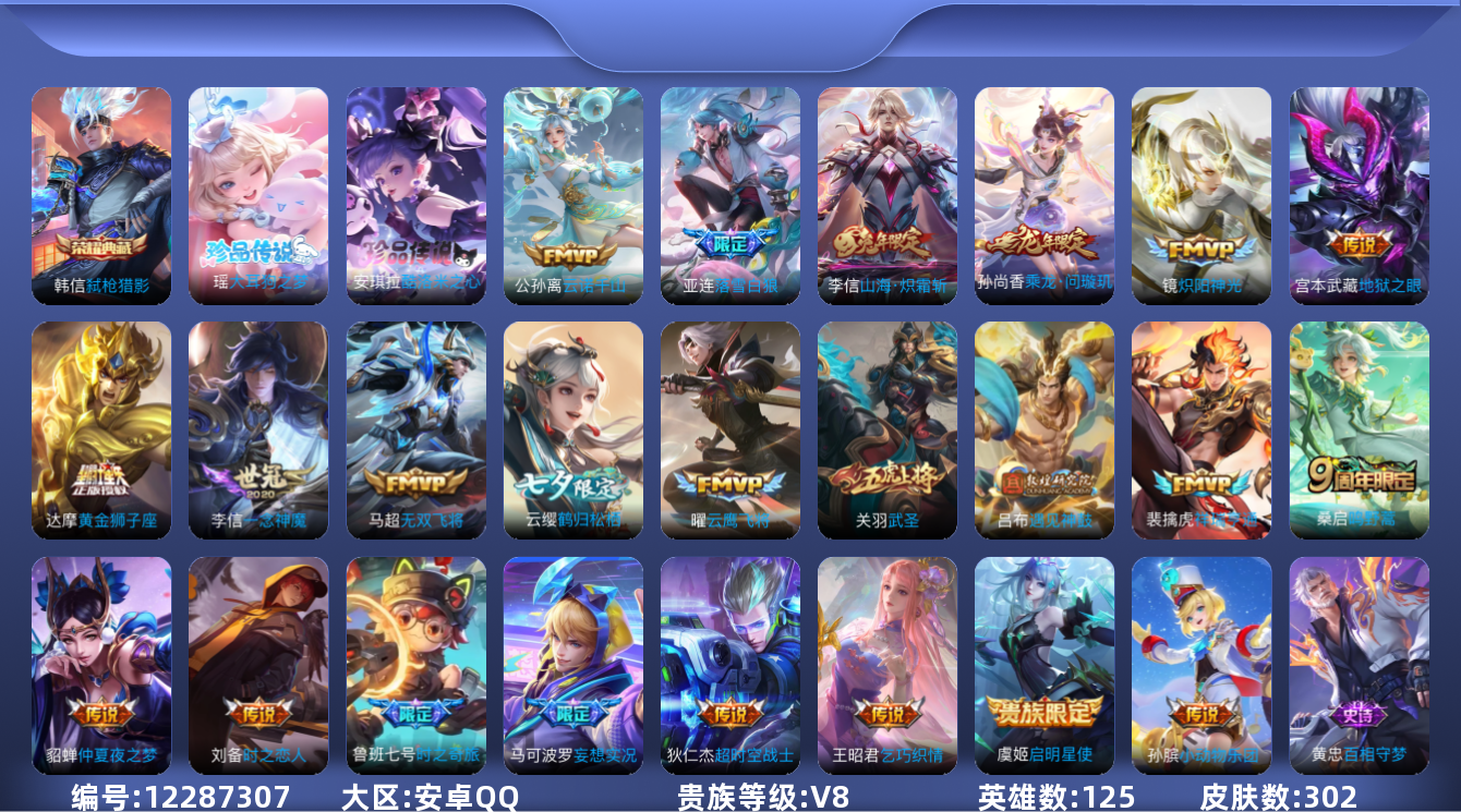 [12287307]V8 1典藏 2珍品传说 23传说 125英雄 302皮肤 可修改实名 优质装备:弑枪猎影(韩信典藏),酷洛米之心,大耳狗之梦,黄金狮子座,云鹰飞将(小将军),炽阳神光,一念神魔,仲夏夜之梦(大飞蛾),地狱之眼,乞巧织情,时之恋人-刘备(电焊工),超时空战士-狄仁杰,无双飞将,山海·炽霜斩(李信年限),妄想实况,鹤归松栖(云缨),遇见神鼓,鲁班七号-时之奇旅,小动物乐团 传说皮:乘龙·问璇玑(孙尚香年限),落雪白狼,云诺千山,祥瑞亨通 珍宝阁皮:妄想食味,胡桃夹子 限定皮:逐霄战戟,陌上桑,鸣野蒿,至尊宝,山海·碧波行(瑶年限),武圣,梁祝,李小龙,冰霜恋舞曲,匿光启智者 史诗皮:鸭鸭历险记-刘禅,龙之律动,星界战将,石田雨龙,百相守梦-周瑜,百相守梦-黄忠,埋骨钱,谪仙醉月,星界特工,炽弈燎原,撼地雄心,破空之剑,怒海争锋,蔬乡物语(鲁班七号),百相守梦-百里守约,紫霞仙子,黄金分割率,特工魅影,千年之狐,永昼,冰冠公主,浮梦罗烟,鹤归松栖(赵怀真),江河有灵,百解令(蒙犽),高渐离燃音魔法,魅语,无限星赏官,晚萤,偶像歌手,银翎春语,龙骑士(小龙虾),暗夜猫娘,末日机甲-吕布,猫狗日记-孙策,猫狗日记-大乔,乱世虎臣,节奏热浪,修罗,女仆咖啡,摇滚巨星,水果甜心,绅士熊喵,天才门将,星夜王子,心灵骇客,功夫厨神,德古拉伯爵,暗隐猎兽者,幽灵船长,鬼剑武藏,暗渊魔法,心灵战警,乐园奇幻夜,天秀·启明,舞动绿茵,地狱岩魂,诗语江南,拒霜思,缤纷独角兽,乘风破浪,逐浪之夏,水晶猎龙者,曙光守护者,热力回旋,箭羽风息,金属风暴,原初追逐者,圣诞狂欢,圣诞恋歌,鹰眼统帅,暗夜贵公子,魅力维加斯,黎明之约,赏金猎手,未来纪元-赵云