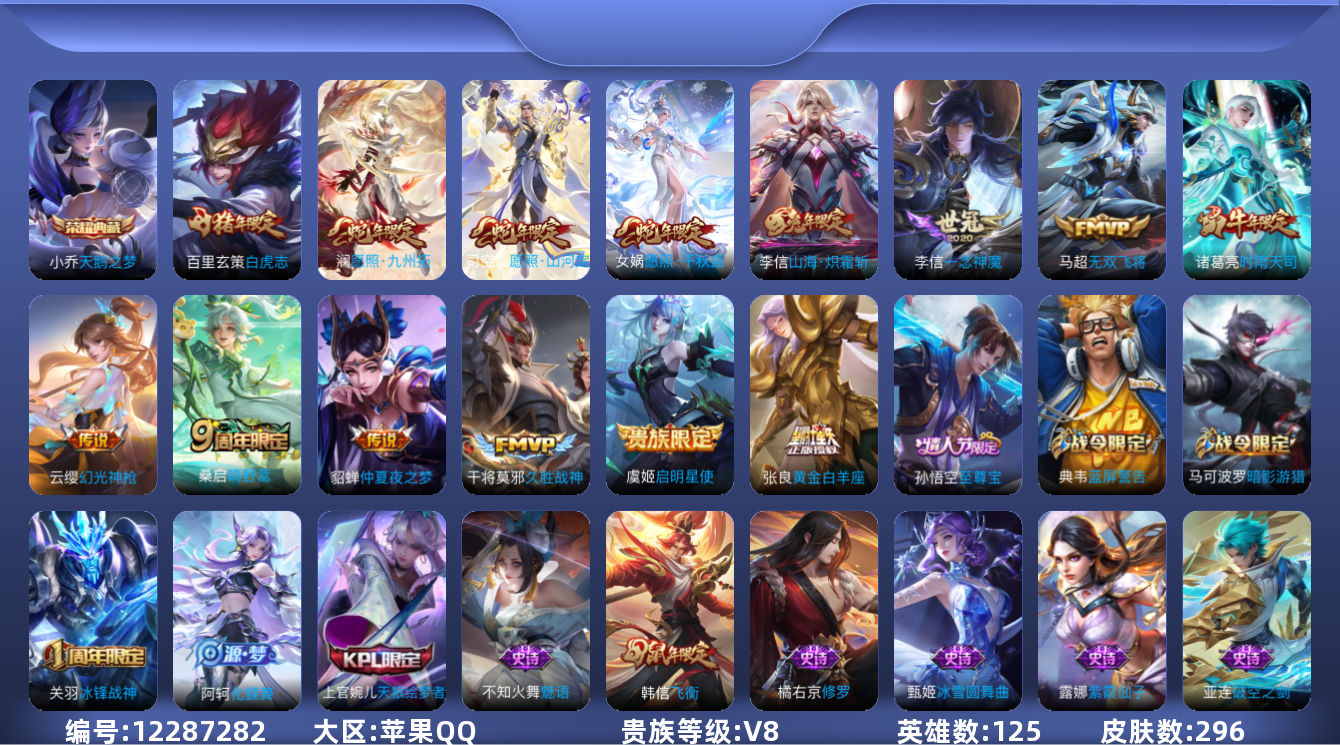 [12287282]V8 1典藏 14传说 125英雄 296皮肤 可修改实名 优质装备:天鹅之梦(小乔典藏),黄金白羊座,久胜战神,一念神魔,仲夏夜之梦(大飞蛾),无双飞将,山海·炽霜斩(李信年限) 传说皮:幻光神枪 珍宝阁皮:蔷薇恋人,玩趣恶龙 限定皮:愿照·九州拓(澜年限),愿照·山河定(司空震年限),愿照·千秋盛(女娲年限),鸣野蒿,至尊宝,白虎志(电光耗子),时雨天司(水龙头),飞衡(韩信年限),遇见飞天,高山流水,五谷丰年,冰锋战神,梁祝,天狼绘梦者,李小龙 史诗皮:化蝶舞,破空之剑,蒙犽顽岩魄,紫霞仙子,黄金分割率,特工魅影,千年之狐,江河有灵,魅语,百解令(蒙犽),蒙恬荣光圣徽,无限星赏官,冰冠公主,青蛇,偶像歌手,龙骑士(小龙虾),猫狗日记-孙策,乱世虎臣,节奏热浪,修罗,水果甜心,天才门将,星夜王子,心灵骇客,功夫厨神,德古拉伯爵,暗隐猎兽者,幽灵船长,鬼剑武藏,心灵战警,舞动绿茵,诗语江南,纤云弄巧,繁星吟游(呼啦呼啦),拒霜思,缤纷独角兽,乘风破浪,逐浪之夏,水晶猎龙者,曙光守护者,箭羽风息,金属风暴,原初追逐者,圣诞狂欢,圣诞恋歌,鹰眼统帅,暗夜贵公子,魅力维加斯,黎明之约,无心