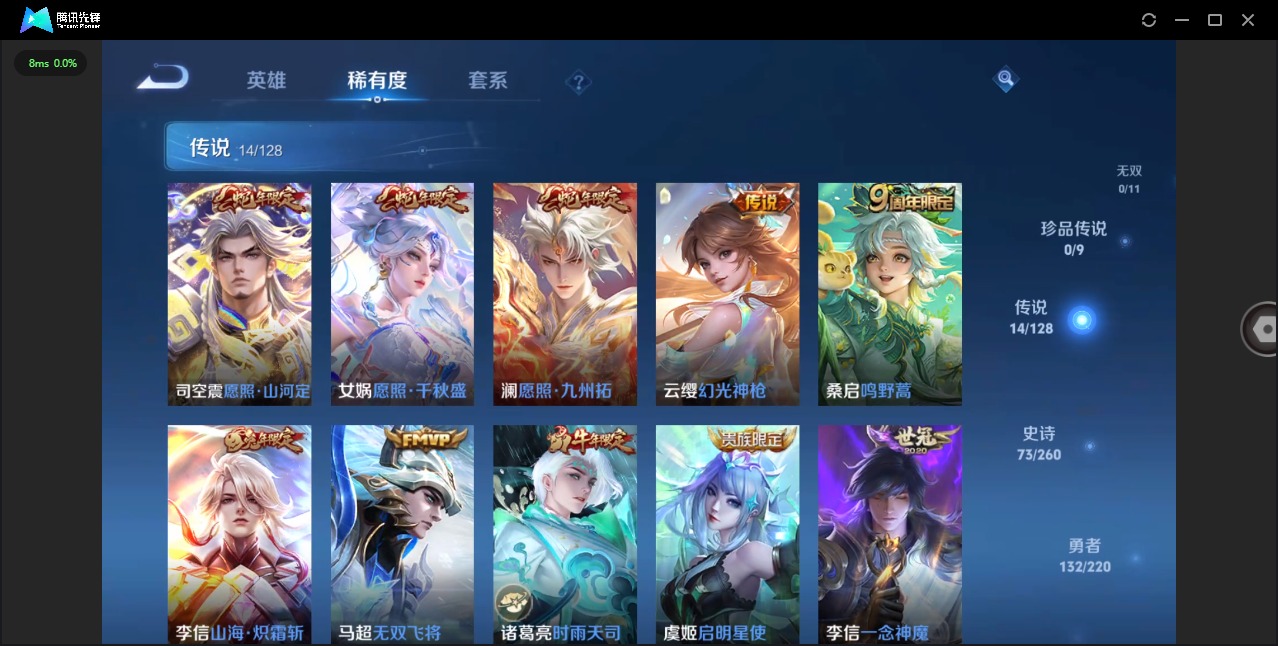 - [11684488]V8 2典藏 13传说 125英雄 273皮肤 可修改实名 优质装备:鸣剑·曳影,九霄神辉(木兰典藏),绛天战甲(鸡嘴战神),炽阳神光,末日机甲-孙尚香(绿蚂蚱),地狱火,仲夏夜之梦(大飞蛾),超时空战士-狄仁杰,澜逐花归海 传说皮:云诺千山 珍宝阁皮:优雅恋人,蔷薇恋人,女武神 限定皮:至尊宝,武陵仙君(小桃花),时雨天司(水龙头),飞衡(韩信年限),遇见飞天,高山流水,游园惊梦,梁祝,李小龙,朱雀志(守约年限),永曜之星,辉光之辰,如梦令-后羿,霸王别姬-虞姬,孙行者,猪悟能,青春决赛季,寅虎·瑞焰(虎皮蛋子) 史诗皮:灵蛊蚀心,龙之律动,石田雨龙,百相守梦-周瑜,琥珀纪元伽罗,百相守梦-黄忠,紫霞仙子,苍穹之光,白龙吟,黄金分割率,千年之狐,江河有灵,百解令(蒙犽),高渐离燃音魔法,魅语,冰冠公主,猫狗日记-孙策,乱世虎臣,节奏热浪,女仆咖啡,水果甜心,天才门将,时之奇旅-安琪拉,德古拉伯爵,暗隐猎兽者,幽灵船长,鬼剑武藏,心灵战警,舞动绿茵,地狱岩魂,纤云弄巧,拒霜思,逐浪之夏,水晶猎龙者,金属风暴,原初追逐者,圣诞狂欢,圣诞恋歌,鹰眼统帅,王者之锤,暗夜贵公子,魅力维加斯,黎明之约,奇遇舞章,未来纪元-赵云