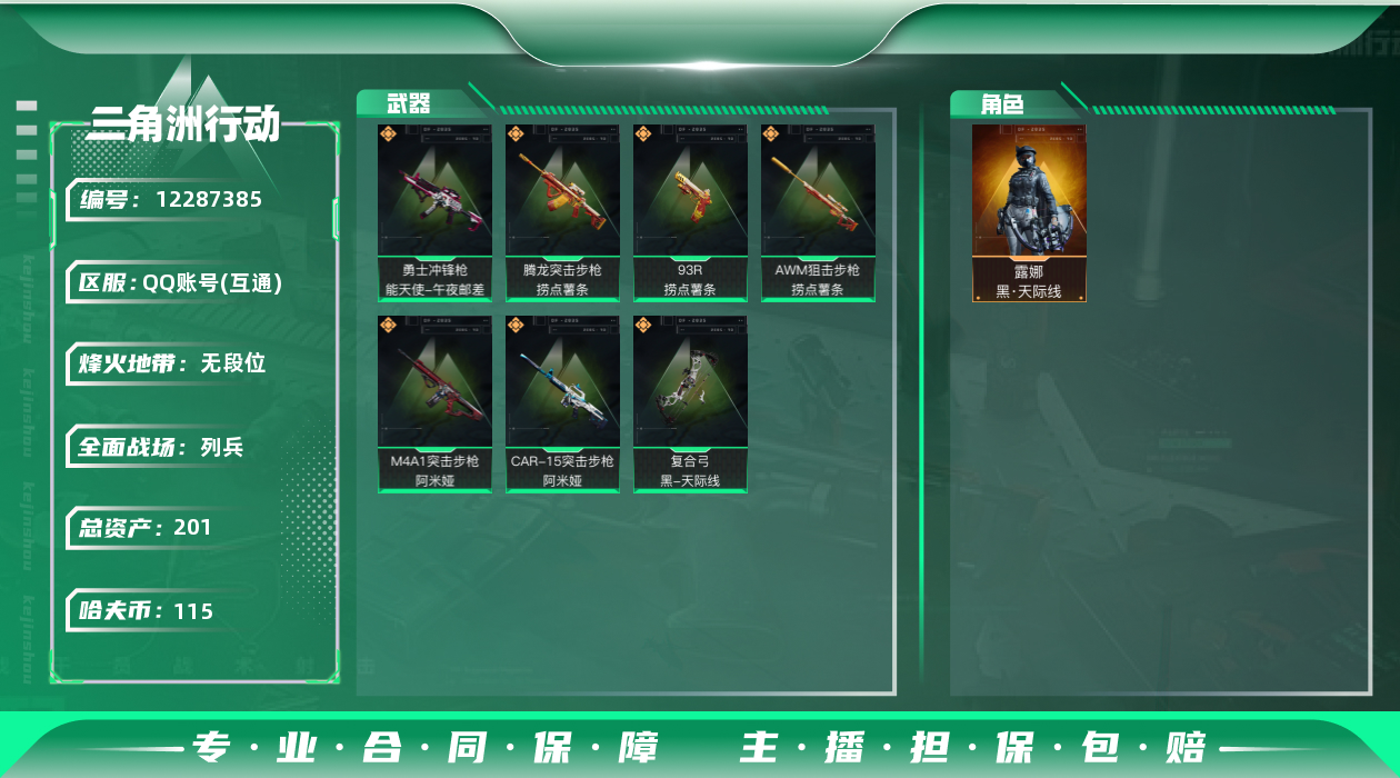 [12287385]总资产:201.5M 1干员外观 7传说枪械 哈夫币:115K 进阶安全箱(9.17到期) 可二次 可修改实名 烽火地带段位:无段位 全面战场段位:列兵 传说武器皮肤:M4A1突击步枪-阿米娅,CAR-15突击步枪-阿米娅,复合弓-黑-天际线,AWM狙击步枪-捞点薯条,腾龙突击步枪-捞点薯条,93R-捞点薯条,勇士冲锋枪-能天使-午夜邮差 干员外观:露娜-黑·天际线