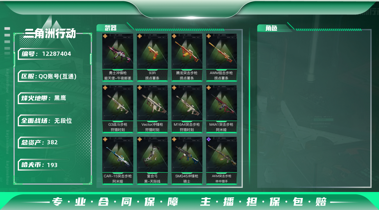 [12287404]总资产:382.2M 11传说枪械 哈夫币:193K 可二次 可修改实名 优质装备:顶级安全箱(3x3) 烽火地带段位:黑鹰 全面战场段位:无段位 传说武器皮肤:SMG45冲锋枪-骑士,M16A4突击步枪-狩猎时刻,M4A1突击步枪-阿米娅,CAR-15突击步枪-阿米娅,复合弓-黑-天际线,Vector冲锋枪-狩猎时刻,G3战斗步枪-狩猎时刻,AWM狙击步枪-捞点薯条,腾龙突击步枪-捞点薯条,93R-捞点薯条,勇士冲锋枪-能天使-午夜邮差 史诗武器皮肤:SVD狙击步枪-暗夜猎手,M16A4突击步枪-竞赛选手,MP5冲锋枪-深海恐惧,AKM突击步枪-林中猎手,SV-98狙击步枪-林中猎手,PTR-32突击步枪-英雄,M250通用机枪-囚徒,沙漠之鹰-曙光,M700狙击步枪-竞技风