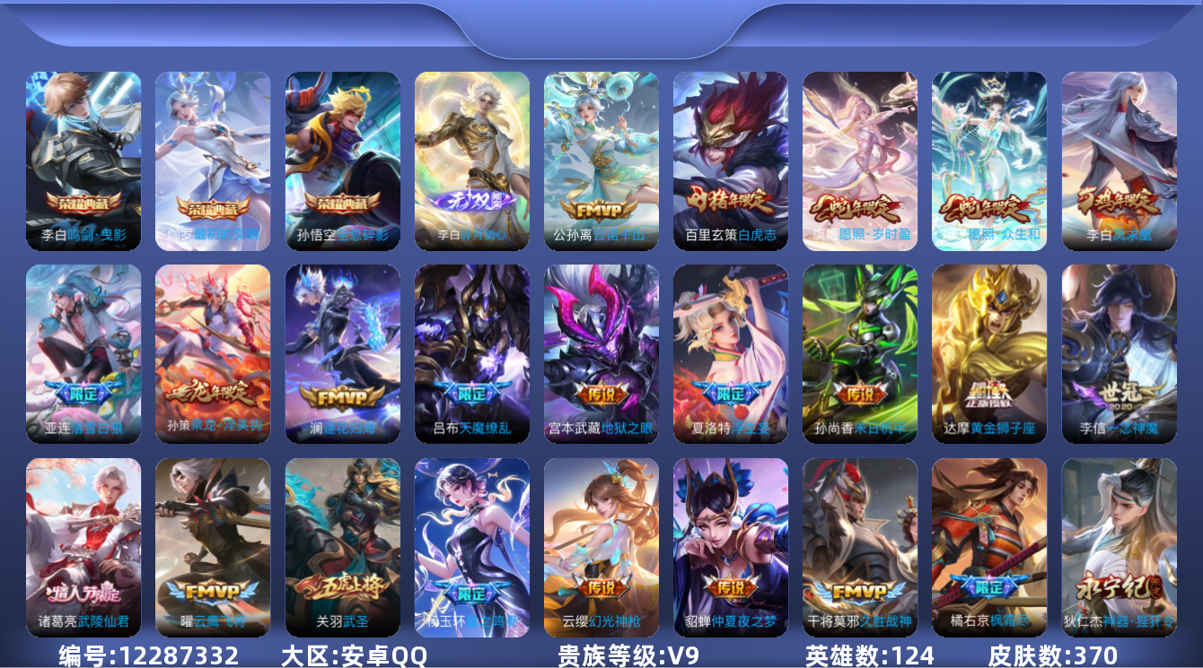 [12287332]V9 3典藏 1无双 29传说 124英雄 370皮肤 可修改实名 优质装备:鸣剑·曳影,全息碎影(猴子典藏),碎月剑心(李白无双),最初的交响(伽罗典藏),黄金狮子座,黄金射手座,云鹰飞将(小将军),绛天战甲(鸡嘴战神),久胜战神,一念神魔,末日机甲-孙尚香(绿蚂蚱),地狱火,仲夏夜之梦(大飞蛾),零号·赤焰,地狱之眼,超时空战士-狄仁杰,神器·狴犴令,浮生妄,澜逐花归海 传说皮:乘龙·淬吴钩(孙策年限),落雪白狼,云诺千山,星之鸣奏,幻光神枪 珍宝阁皮:妄想食味,优雅恋人,女武神 限定皮:愿照·岁时盈(虞姬年限),愿照·众生和(妲己年限),至尊宝,白虎志(电光耗子),凤求凰(白切鸡),武陵仙君(小桃花),神威(电光马子),瑞麟志(木兰年限),遇见飞天,高山流水,匿光决锋者,五谷丰年,青龙志(铠年限),冰锋战神,武圣,梁祝,御风骁将(吕布年限),逐梦之星,奔雷神使(牛魔年限),天狼绘梦者,李小龙,朱雀志(守约年限),辉光之辰,霸王别姬-项羽,默契交锋-花木兰,孙行者,猪悟能,一生所爱,大圣娶亲,引擎之心,天魔缭乱,冰霜恋舞曲,神奇女侠,匿光追影者,枫霜尽 史诗皮:龙之律动,奇遇星旅,蔬乡物语(鲁班七号),乘龙·聚宝船(安琪拉年限),紫霞仙子,苍穹之光,电玩小子(小书包),白龙吟,黄金分割率,特工魅影,千年之狐,永昼,高渐离燃音魔法,蒙恬荣光圣徽,偶像歌手,龙骑士(小龙虾),魅语,无限星赏官,晚萤,冰冠公主,青蛇,末日机甲-吕布,猫狗日记-孙策,乱世虎臣,节奏热浪,修罗,女仆咖啡,摇滚巨星,水果甜心,天才门将,星夜王子,心灵骇客,功夫厨神,德古拉伯爵,暗隐猎兽者,幽灵船长,鬼剑武藏,暗渊魔法,心灵战警,舞动绿茵,地狱岩魂,纤云弄巧,繁星吟游(呼啦呼啦),拒霜思,缤纷独角兽,乘风破浪,逐浪之夏,水晶猎龙者,曙光守护者,箭羽风息,金属风暴,原初追逐者,圣诞狂欢,圣诞恋歌,鹰眼统帅,王者之锤,暗夜贵公子,魅力维加斯,黎明之约,无心,未来纪元-赵云