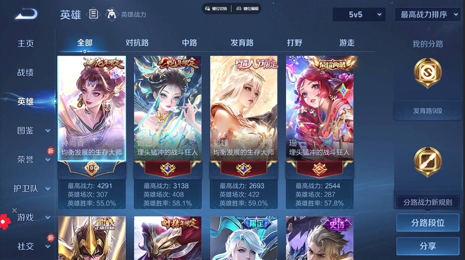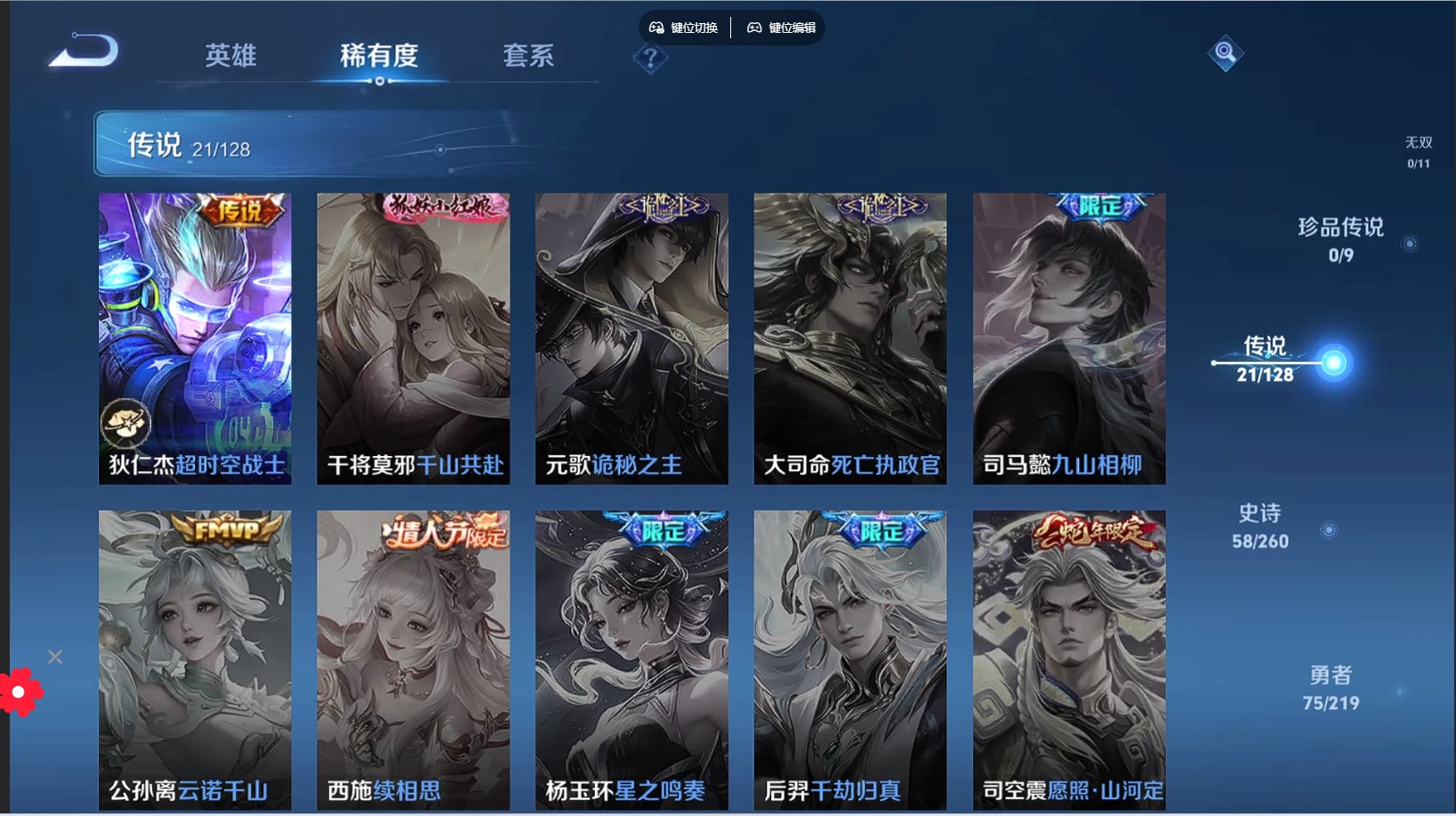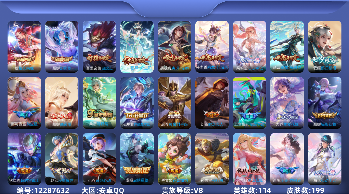 - [11853682]V8 2典藏 8传说 119英雄 215皮肤 可修改实名 荣耀水晶:银白咏叹调(倪克斯侍卫),杀手不太冷 传说皮:黄金狮子座,猫影幻舞,炽阳神光,无双飞将,超时空战士-狄仁杰,山海·苍雷引(电光曜子) 珍宝阁皮:玩趣恶龙 限定皮:鸣野蒿,神威(电光马子),飞衡(韩信年限),五谷丰年,冰锋战神,梁祝,逐梦之影,霸王别姬-虞姬,奇迹圣诞,神奇女侠,山海·玄木吟(马可年限) 史诗皮:紫霞仙子,苍穹之光,电玩小子(小书包),黄金分割率,特工魅影,永昼,蒙恬荣光圣徽,冰冠公主,偶像歌手,晚萤,无限星赏官,龙骑士(小龙虾),末日机甲-吕布,猫狗日记-孙策,乱世虎臣,节奏热浪,修罗,女仆咖啡,水果甜心,天才门将,星夜王子,心灵骇客,功夫厨神,德古拉伯爵,暗隐猎兽者,幽灵船长,鬼剑武藏,地狱岩魂,纤云弄巧,繁星吟游(呼啦呼啦),缤纷独角兽,乘风破浪,逐浪之夏,水晶猎龙者,热力回旋,金属风暴,原初追逐者,圣诞狂欢,鹰眼统帅,王者之锤,魅力维加斯,黎明之约,赏金猎手