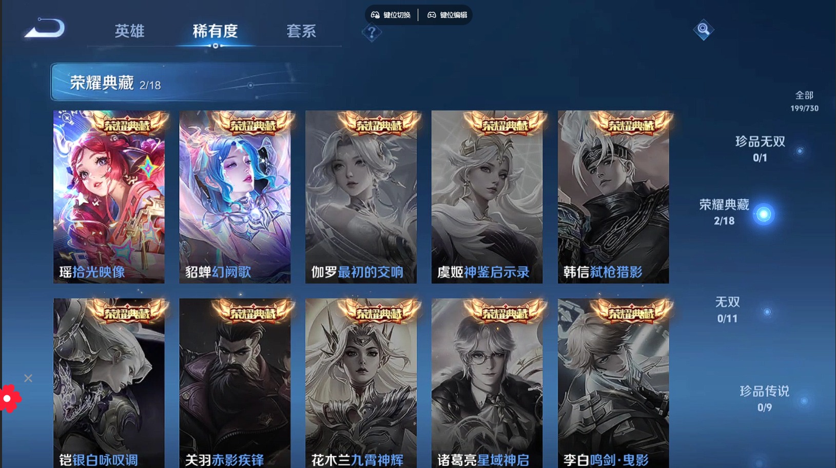 - PX_2108121-??信/尊贵铂金/539皮肤/124英雄/18典藏/0珍品无双/6无双/2珍品传说/96传说/189史诗/10稀有英雄 【2 珍品传说】怪盗基德 马可波罗,江户川柯南 鲁班七号, 【18 典藏皮肤】鸣剑·曳影 李白,全息碎影 孙悟空,杀手不太冷 孙尚香,天鹅之梦 小乔,活力突击 程咬金,倪克斯神谕 武则天,银白咏叹调 铠,幻阙歌 貂蝉,星空梦想 鲁班七号,神鉴启示录 虞姬,弑
