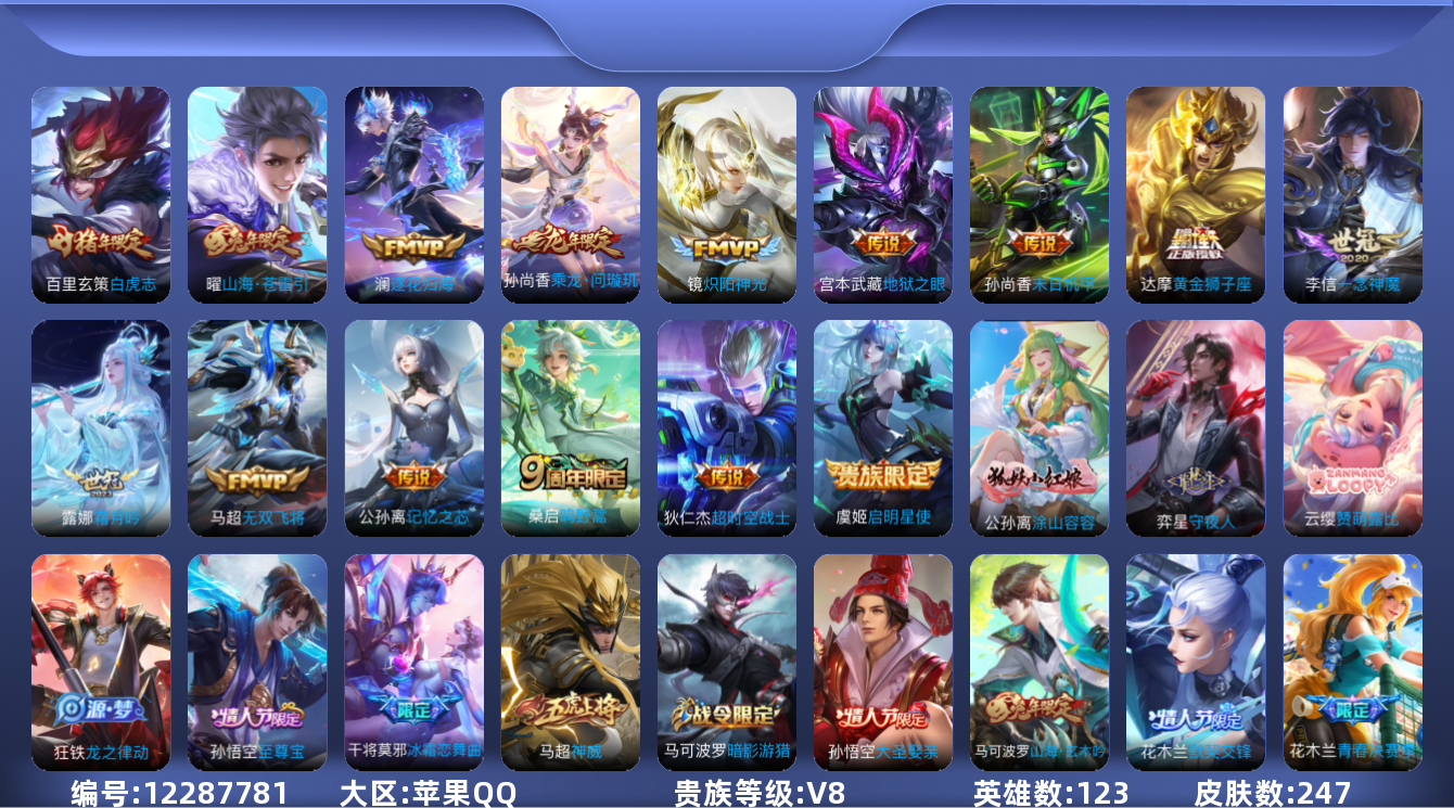 [12287781]V8 15传说 123英雄 247皮肤 可修改实名 优质装备:黄金狮子座,炽阳神光,一念神魔,末日机甲-孙尚香(绿蚂蚱),地狱之眼,超时空战士-狄仁杰,无双飞将,山海·苍雷引(电光曜子),记忆之芯(机甲兔),霜月吟,澜逐花归海,涂山容容 传说皮:乘龙·问璇玑(孙尚香年限) 珍宝阁皮:妄想食味,蔷薇恋人 限定皮:鸣野蒿,至尊宝,白虎志(电光耗子),神威(电光马子),飞衡(韩信年限),高山流水,五谷丰年,游园惊梦,梁祝,天狼溯光者,李小龙,逐梦之影,朱雀志(守约年限),如梦令-后羿,默契交锋-花木兰,大圣娶亲,青春决赛季,冰霜恋舞曲,蜜橘之夏,百木心枪,山海·玄木吟(马可年限) 史诗皮:赞萌露比,龙之律动,琥珀纪元伽罗,守夜人,紫霞仙子,电玩小子(小书包),白龙吟,黄金分割率,特工魅影,千年之狐,永昼,冰冠公主,高渐离燃音魔法,魅语,晚萤,修罗,女仆咖啡,摇滚巨星,水果甜心,天才门将,功夫厨神,德古拉伯爵,暗隐猎兽者,幽灵船长,纤云弄巧,拒霜思,缤纷独角兽,逐浪之夏,水晶猎龙者,曙光守护者,金属风暴,原初追逐者,圣诞狂欢,圣诞恋歌,鹰眼统帅,魅力维加斯,黎明之约,赏金猎手,无心,未来纪元-赵云