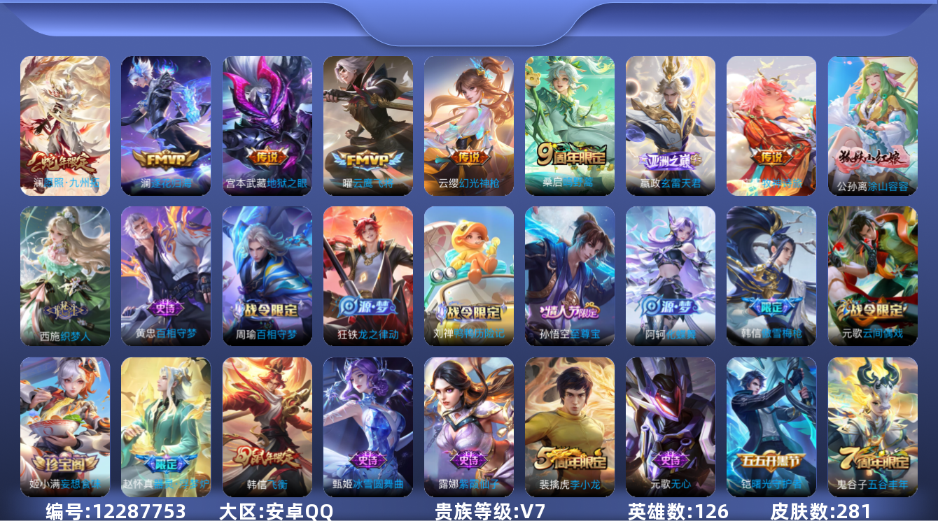 [12287753]【商品标题】:安卓Q-V7-最强王者段位-125英雄-280皮肤-0典藏-0珍品无双-0无双-0珍品传说-8传说-65史诗
