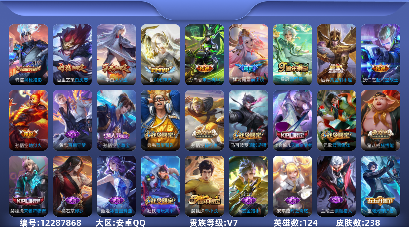 [12287868]V7 1典藏 9传说 124英雄 238皮肤 可修改实名 优质装备:弑枪猎影(韩信典藏),黄金射手座,炽阳神光,末日机甲-孙尚香(绿蚂蚱),地狱火,超时空战士-狄仁杰 珍宝阁皮:蔷薇恋人 限定皮:鸣野蒿,至尊宝,白虎志(电光耗子),凤求凰(白切鸡),前尘镜,遇见飞天,高山流水,游园惊梦,梁祝,天狼狩猎者,天狼绘梦者,李小龙,孙行者,猪悟能 史诗皮:百相守梦-黄忠,特工魅影,千年之狐,冰冠公主,偶像歌手,末日机甲-吕布,猫狗日记-孙策,猫狗日记-大乔,乱世虎臣,修罗,女仆咖啡,摇滚巨星,水果甜心,时之奇旅-安琪拉,德古拉伯爵,暗隐猎兽者,鬼剑武藏,心灵战警,舞动绿茵,地狱岩魂,纤云弄巧,繁星吟游(呼啦呼啦),逐浪之夏,水晶猎龙者,曙光守护者,箭羽风息,金属风暴,原初追逐者,圣诞恋歌,鹰眼统帅,魅力维加斯,黎明之约,赏金猎手,奇遇舞章