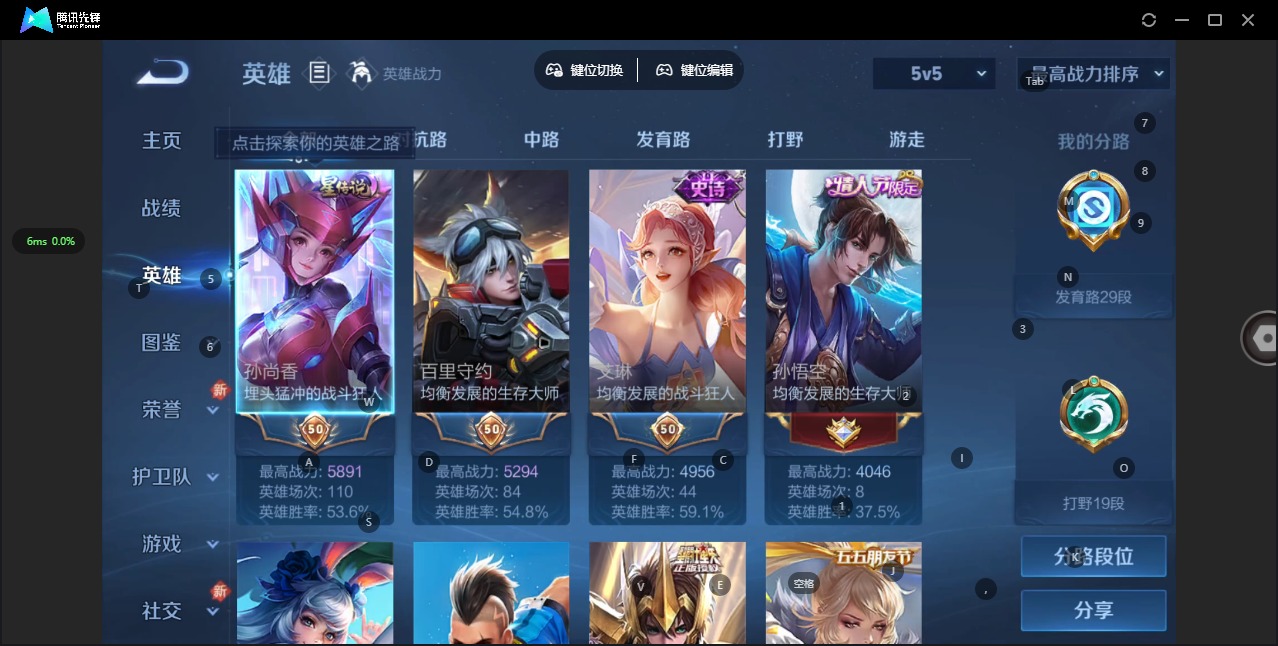 - [12052660]V6 1典藏 2珍品传说 4传说 123英雄 126皮肤 可修改实名 优质装备:全息碎影(猴子典藏),朽木白哉,黑崎一护,涂山容容 传说皮:幻光神枪 珍宝阁皮:胡桃夹子 限定皮:愿照·岁时盈(虞姬年限),愿照·千秋盛(女娲年限),鸣野蒿,神威(电光马子),高山流水,梁祝,默契交锋-花木兰 史诗皮:鸭鸭历险记-刘禅,器灵·浮梦炉,化蝶舞,龙之律动,石田雨龙,茶境仙,谪仙醉月,破空之剑,紫霞仙子,黄金分割率,特工魅影,冰冠公主,青蛇,蒙恬荣光圣徽,魅语,无限星赏官,水果甜心,德古拉伯爵,暗隐猎兽者,鬼剑武藏,天秀·启明,拒霜思,乘风破浪,水晶猎龙者,曙光守护者,圣诞狂欢,鹰眼统帅,魅力维加斯