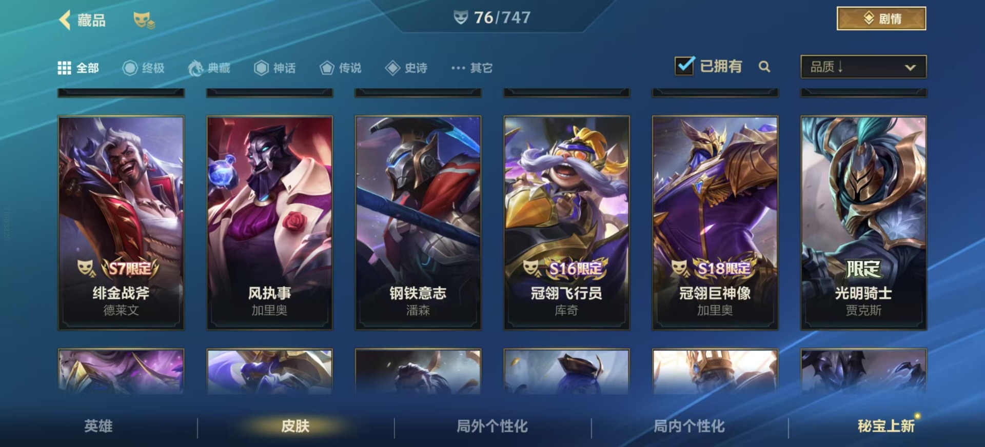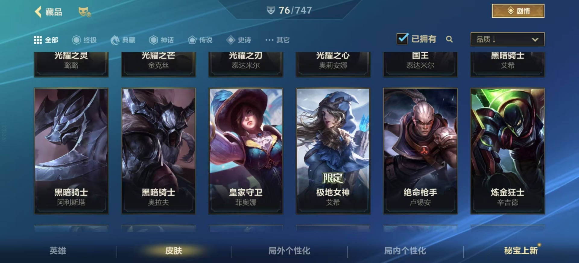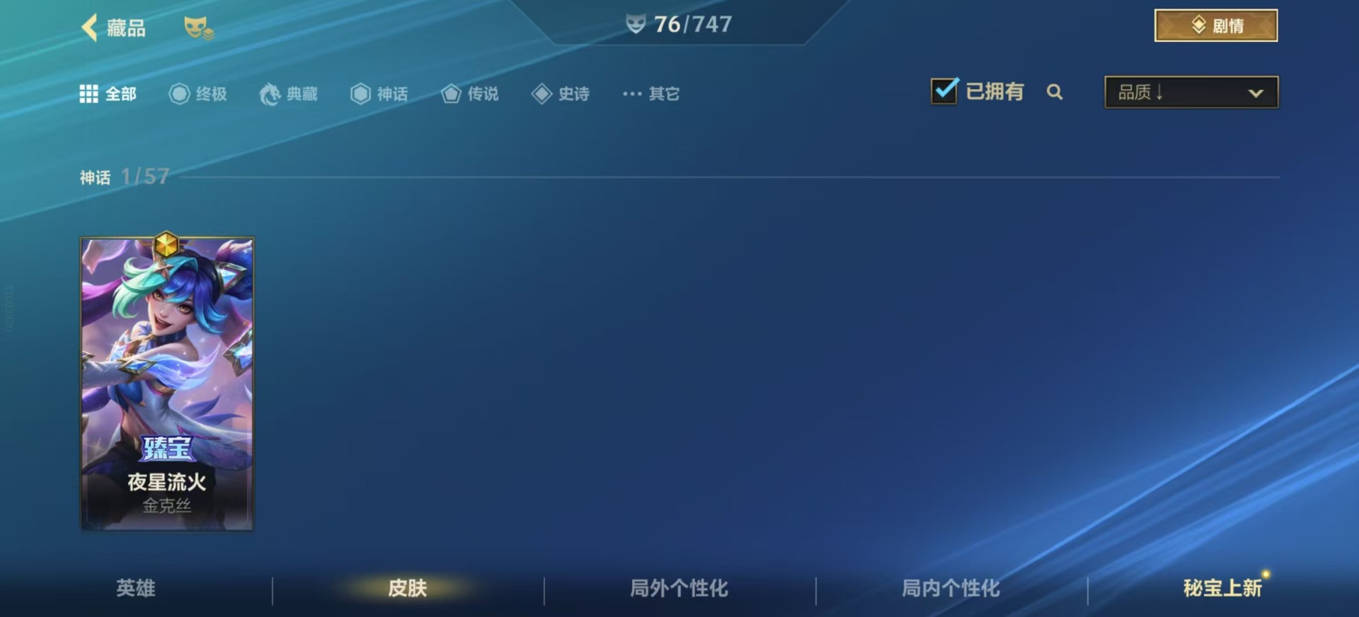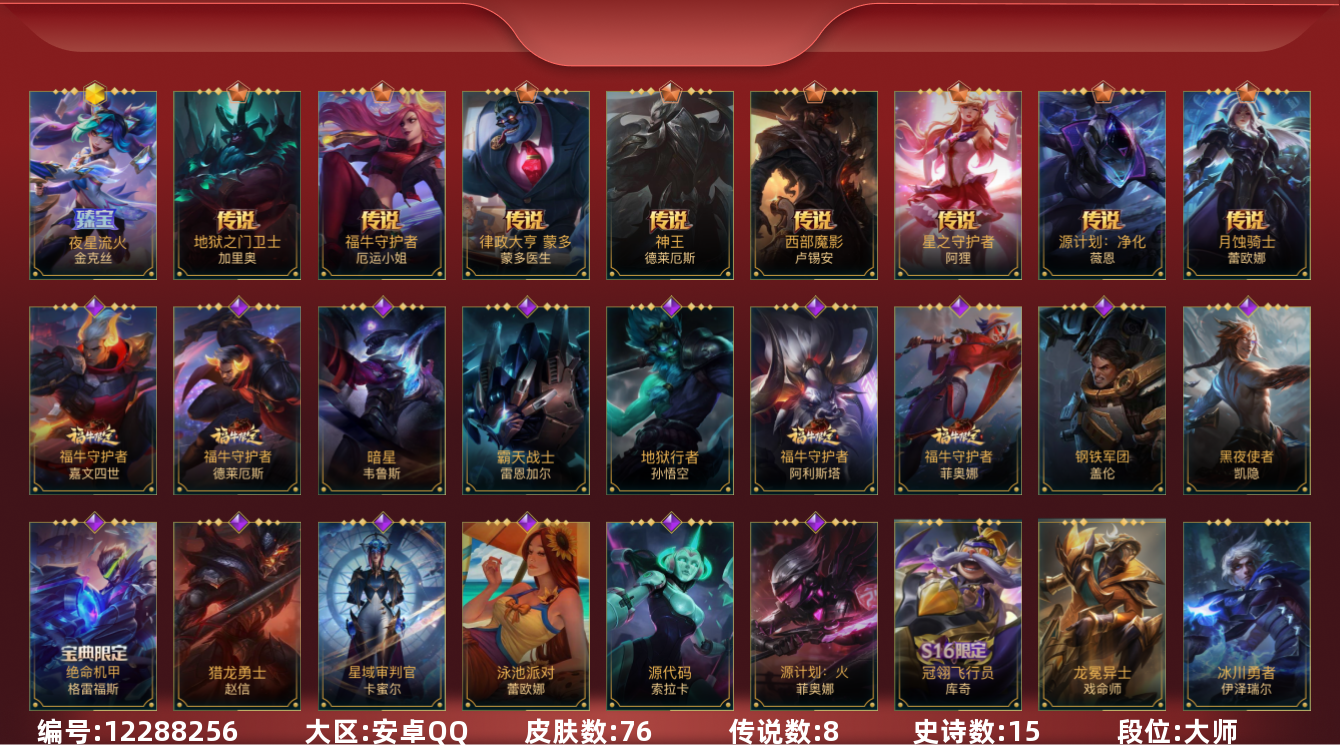 [12288256]1神话 8传说 15史诗 76皮肤 可二次 可修改实名 优质装备:福牛守护者女枪,律政大亨,神王诺手,西部魔影卢锡安,星之守护者阿狸,源计划:净化,月蚀骑士蕾欧娜 段位:大师 神话皮:夜星流火 金克丝 传说皮:地狱之门卫士 亮点:福牛守护者女枪,律政大亨,神王诺手,西部魔影卢锡安,星之守护者阿狸,源计划:净化,月蚀骑士蕾欧娜