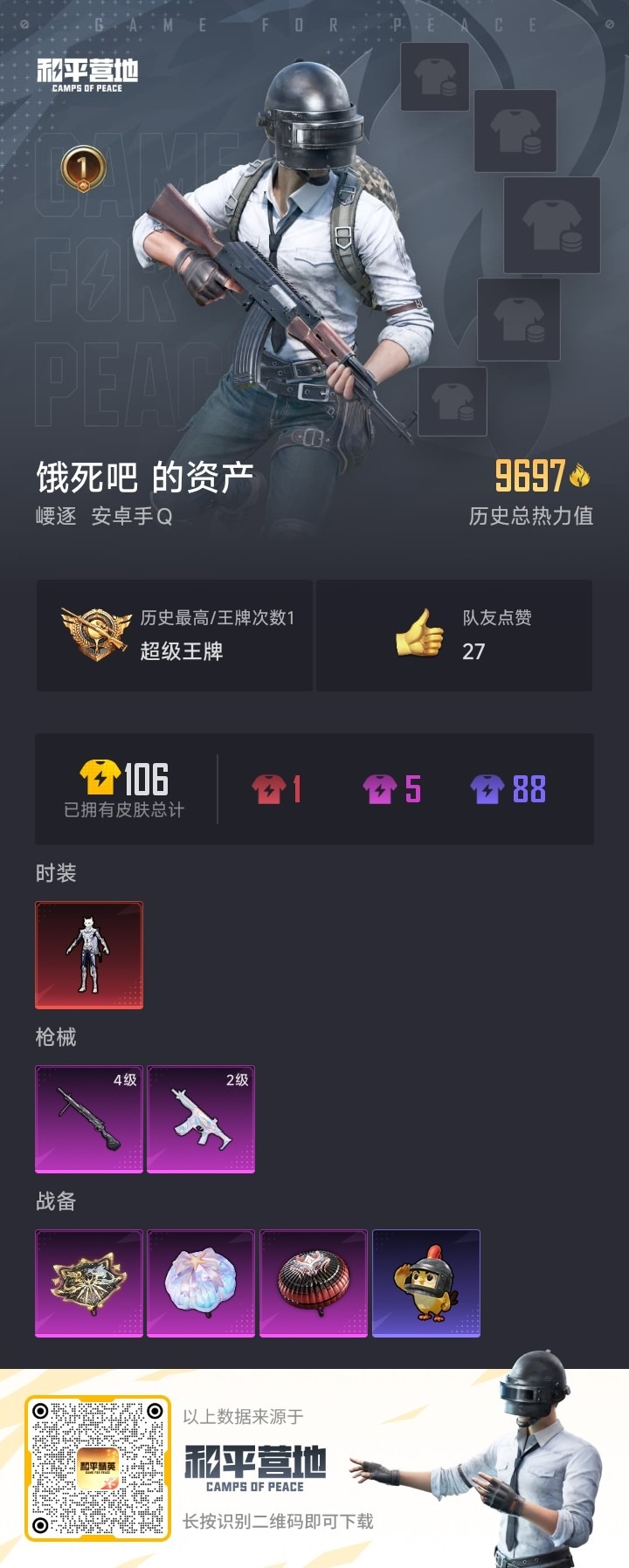 - PX_2083714- 安卓手Q-9王牌印记-8粉装-6特效枪-0载具-55128热力值-110套装-170枪皮-0卓越印记-0传奇印记 【8粉装】,梦幻火箭,第五大道,星穹咏叹调,拂晓神骑,复仇流浪者,圣堂之誓,炙焰红王,数码大师 【6特效枪】AKM-梦之光华-6级 SCAR-L-梦幻火箭-5级 M416-五爪金龙-7级 GROZA-镜光银凌-5级 AUG-暖羊咩咩-5级 Kar98K-巳巳如意