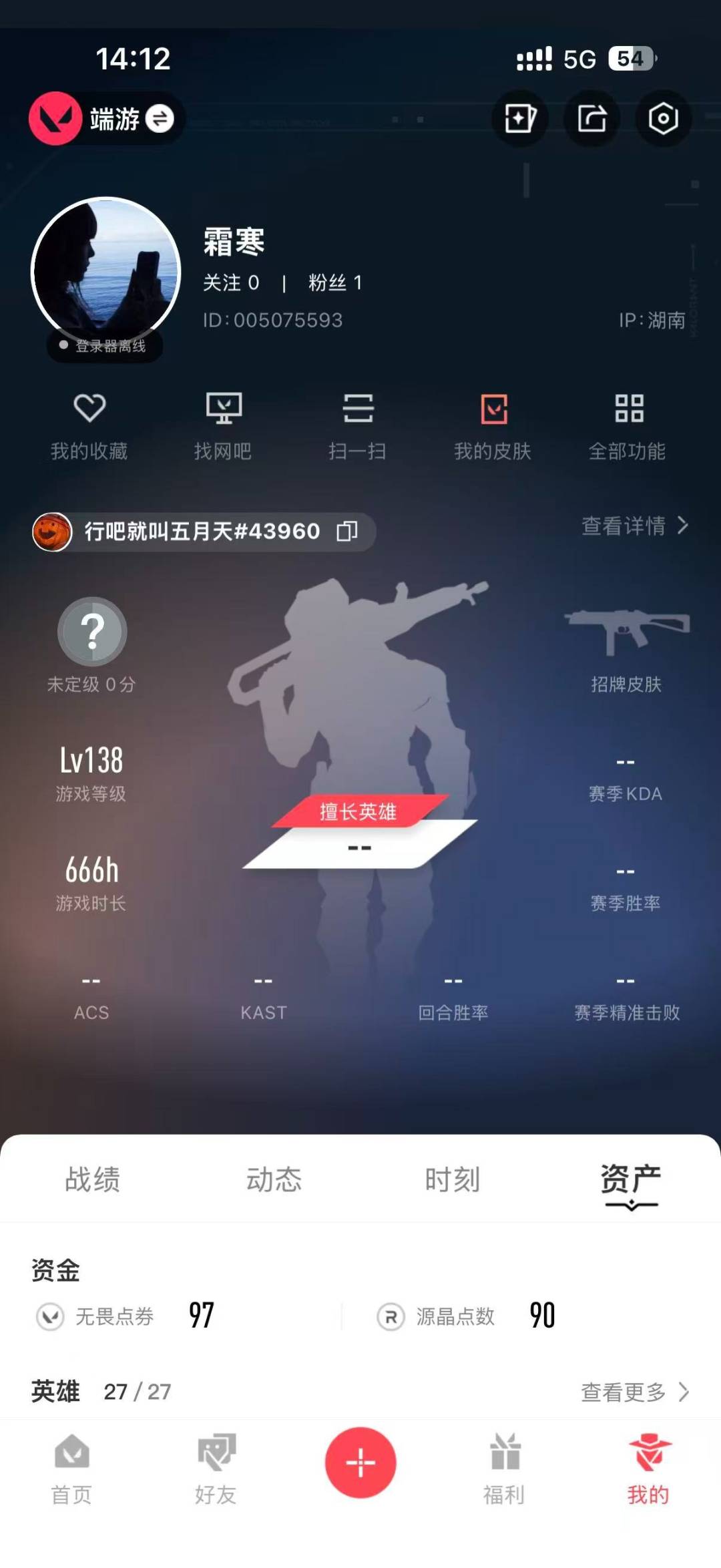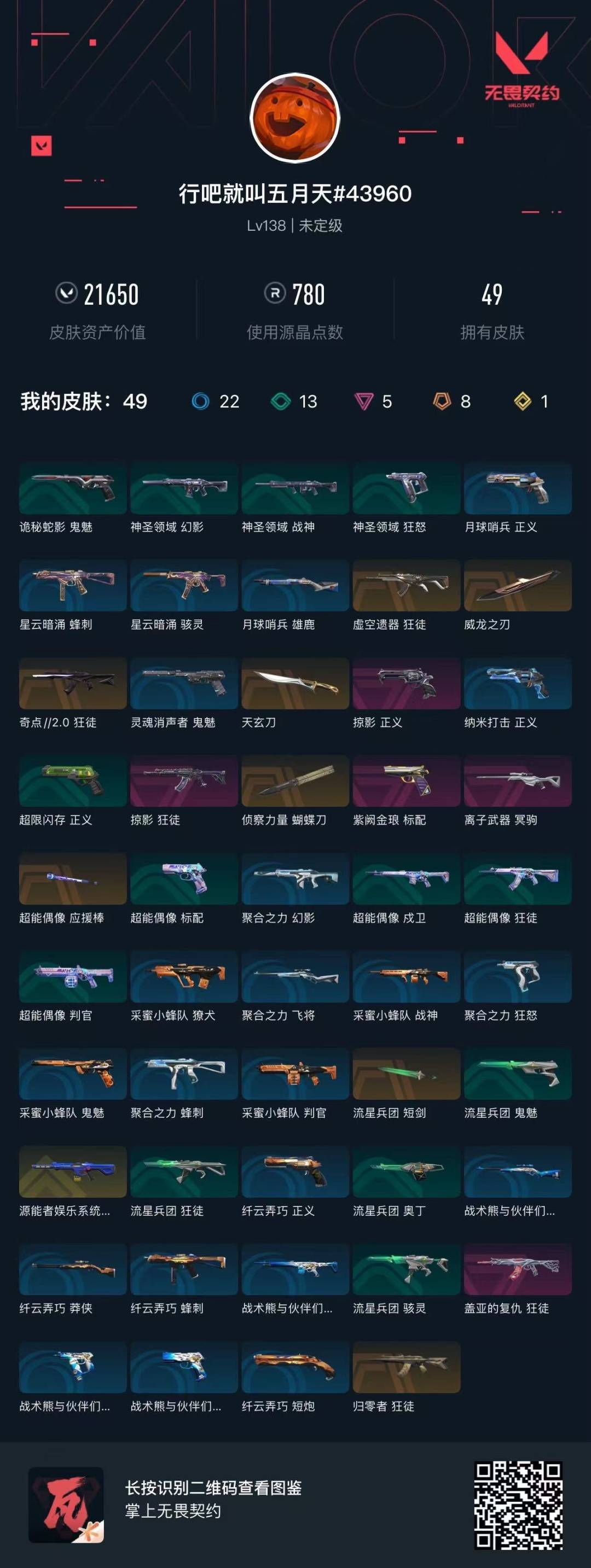 [12288586]8橙皮 1金皮 5紫皮 49皮肤 27英雄 93卡面 780已用源晶 未定级 优质装备:狂徒-归零者,幻影-源能者娱乐系统,狂徒-掠影,狂徒-盖亚的复仇,冥驹-离子武器,狂徒-奇点//2.0,正义-掠影,标配-紫阙金琅,蝴蝶刀-侦察力量,天玄刀,威龙之刃 步枪皮肤:狂徒-虚空遗器 近战武器皮肤:短剑-流星兵团,超能偶像 应援棒