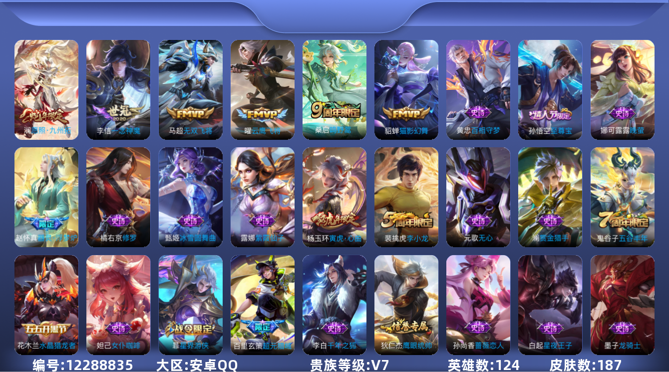 [12288835]V7 6传说 124英雄 187皮肤 可修改实名 女号 优质装备:云鹰飞将(小将军),猫影幻舞,一念神魔,无双飞将 珍宝阁皮:蔷薇恋人,女武神 限定皮:愿照·九州拓(澜年限),逐霄战戟,鸣野蒿,至尊宝,高山流水,五谷丰年,李小龙,寅虎·心曲(虎婆) 史诗皮:器灵·浮梦炉,星界战将,茶境仙,超元猎域,百相守梦-黄忠,紫霞仙子,特工魅影,千年之狐,江河有灵,浮梦罗烟,蒙恬荣光圣徽,偶像歌手,晚萤,龙骑士(小龙虾),猫狗日记-孙策,节奏热浪,修罗,女仆咖啡,摇滚巨星,水果甜心,绅士熊喵,星夜王子,暗隐猎兽者,鬼剑武藏,心灵战警,缤纷独角兽,逐浪之夏,水晶猎龙者,金属风暴,原初追逐者,圣诞狂欢,鹰眼统帅,暗夜贵公子,魅力维加斯,赏金猎手,无心