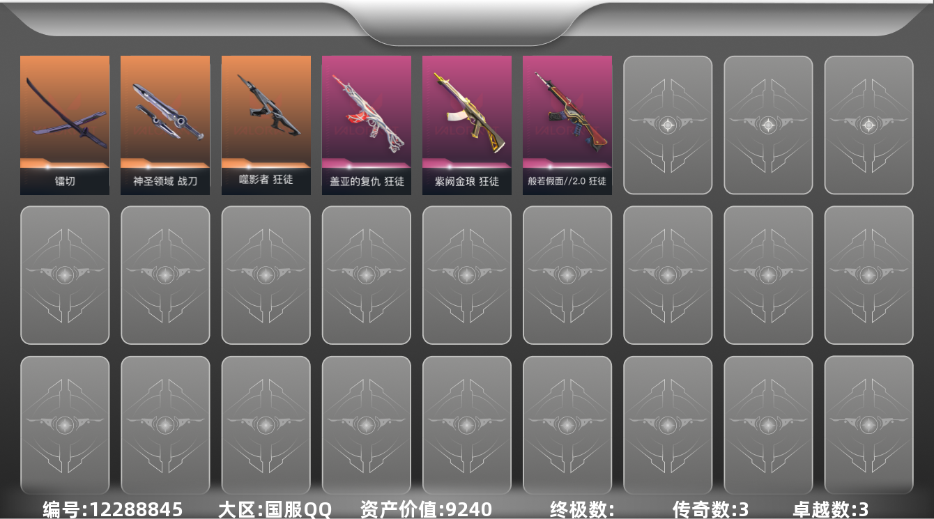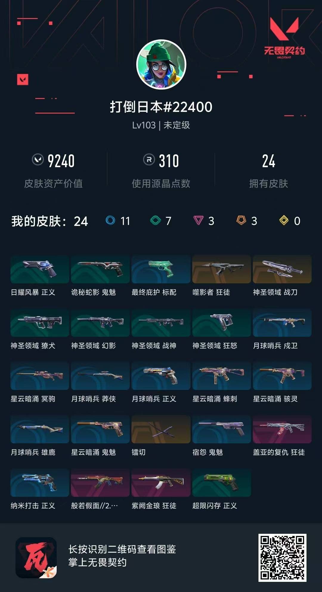 [12288845]3橙皮 3紫皮 24皮肤 15英雄 63卡面 310已用源晶 未定级 优质装备:狂徒-紫阙金琅,狂徒-盖亚的复仇,镭切,神圣领域 战刀 步枪皮肤:狂徒-般若假面//2.0,狂徒-噬影者