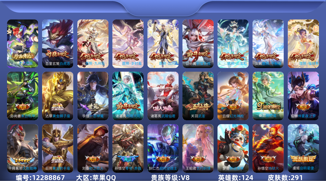 [12288867]V8 1珍品传说 26传说 124英雄 291皮肤 可修改实名 优质装备:黄金狮子座,黄金射手座,久胜战神,一念神魔,末日机甲-孙尚香(绿蚂蚱),地狱火,仲夏夜之梦(大飞蛾),零号·赤焰,胖达荣荣,乞巧织情,时之恋人-刘备(电焊工),超时空战士-狄仁杰 珍品传说:时之奇旅-孙策 传说皮:幻光神枪 珍宝阁皮:优雅恋人,玩趣恶龙 限定皮:愿照·九州拓(澜年限),愿照·福禄聚(蔡文姬年限),愿照·岁时盈(虞姬年限),愿照·山河定(司空震年限),愿照·众生和(妲己年限),愿照·千秋盛(女娲年限),逐霄战戟,鸣野蒿,至尊宝,白虎志(电光耗子),武陵仙君(小桃花),时雨天司(水龙头),神威(电光马子),飞衡(韩信年限),高山流水,青龙志(铠年限),武圣,天狼运算者,梁祝,御风骁将(吕布年限),烈魂,岱宗(典韦年限),天狼溯光者,虎魄,天狼征服者,奔雷神使(牛魔年限),祈雪灵祝(雪兔子),天狼绘梦者,李小龙,默契交锋-花木兰,冰霜恋舞曲,神奇女侠,山海·玄木吟(马可年限) 史诗皮:苍鳞隐世,器灵·浮梦炉,茶境仙,紫霞仙子,苍穹之光,白龙吟,黄金分割率,特工魅影,千年之狐,江河有灵,真我赫兹(百里守约),魅语,蒙恬荣光圣徽,青蛇,偶像歌手,电玩·爆裂旋风,末日机甲-吕布,猫狗日记-孙策,时之恋人-孙尚香,乱世虎臣,节奏热浪,修罗,女仆咖啡,摇滚巨星,水果甜心,天才门将,星夜王子,心灵骇客,功夫厨神,德古拉伯爵,暗隐猎兽者,幽灵船长,鬼剑武藏,心灵战警,天秀·启明,舞动绿茵,地狱岩魂,纤云弄巧,繁星吟游(呼啦呼啦),拒霜思,缤纷独角兽,乘风破浪,逐浪之夏,水晶猎龙者,曙光守护者,箭羽风息,金属风暴,原初追逐者,圣诞狂欢,圣诞恋歌,鹰眼统帅,暗夜贵公子,黎明之约,未来纪元-赵云
