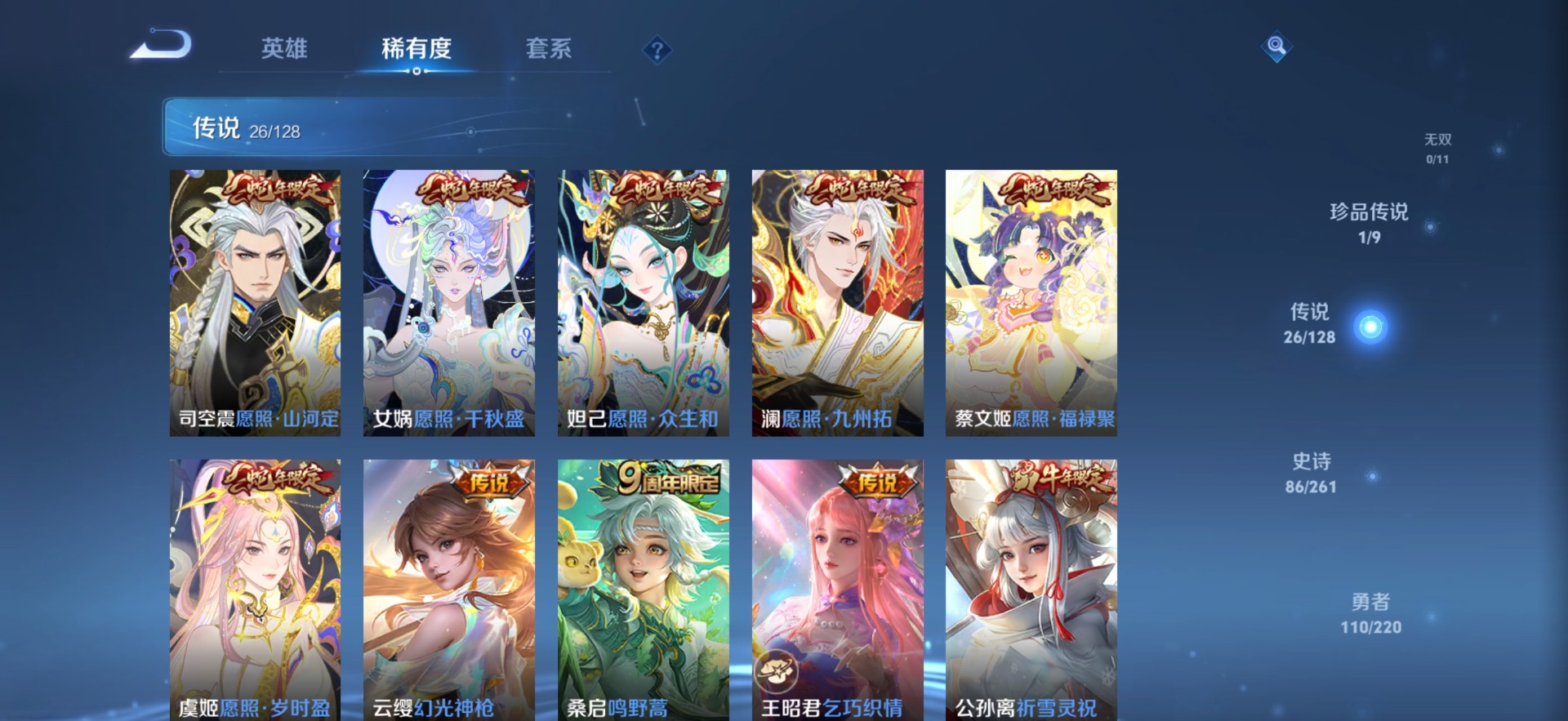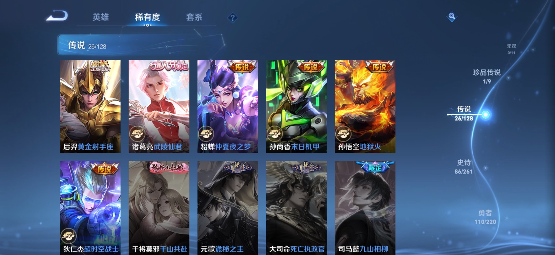 黄忠烈魂,铠青龙志,曹操天狼征服者,伽罗天狼溯光者,张飞虎魄,孙膑天狼运算者,干将莫邪冰霜恋舞曲,典韦岱宗,牛魔奔雷神使,吕布御风骁将,诸葛亮时雨天司,公孙离祈雪灵祝,司空震愿照·山河定,裴擒虎李小龙,上官婉儿梁祝,上官婉儿天狼绘梦者,花木兰默契交锋,马可波罗山海·玄木吟,桑启鸣野蒿,女娲愿照·千秋盛,孙悟空至尊宝,百里玄策白虎志,马超神威,雅典娜神奇女侠,妲己愿照·众生和,韩信飞衡,蔡文姬愿照·福禄聚,澜愿照·九州拓,虞姬愿照·岁时盈,关羽武圣