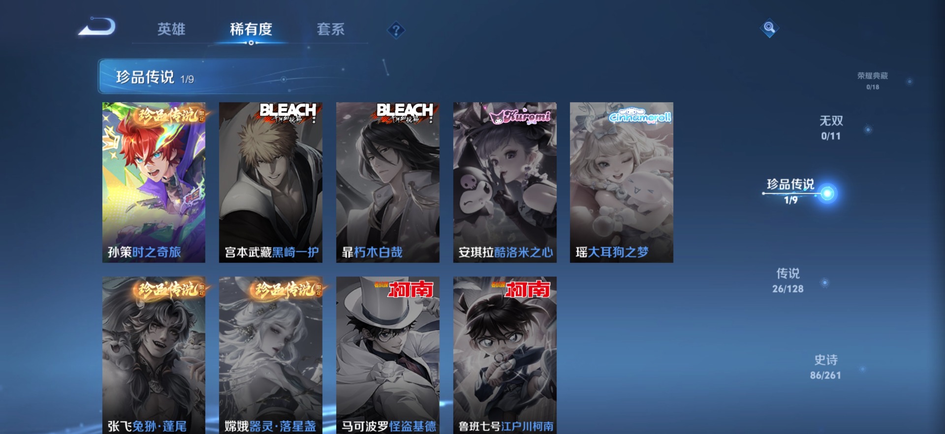 - PX_2111807-Q/永恒钻石/141皮肤/117英雄/1典藏/0珍品无双/0无双/4珍品传说/11传说/37史诗/5稀有英雄 【4 珍品传说】大耳狗之梦 瑶,怪盗基德 马可波罗,器灵·落星盏 嫦娥,江户川柯南 鲁班七号, 【1 典藏皮肤】拾光映像 瑶, 【11 传说皮肤】花朝如约 蔡文姬,时之祈愿 瑶,游龙清影 西施,仲夏夜之梦 貂蝉,淬星耀世 赵云,挚爱花嫁 大乔,心动手记 朵莉亚,愿照·