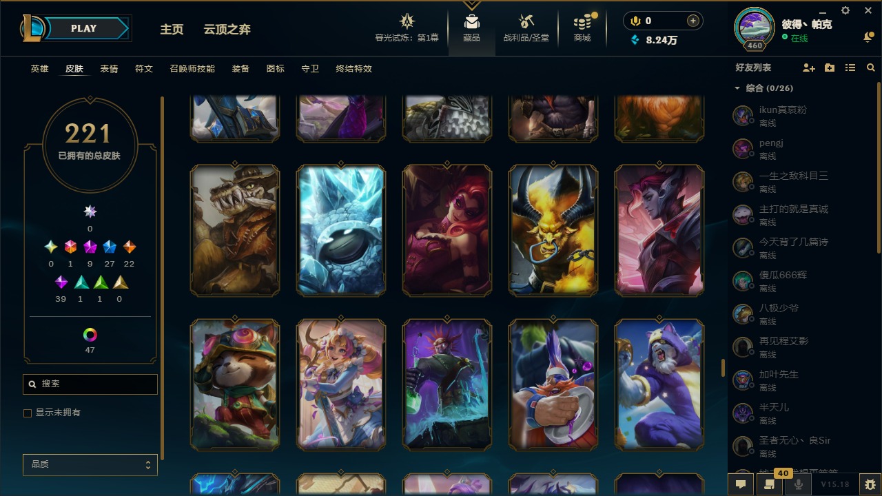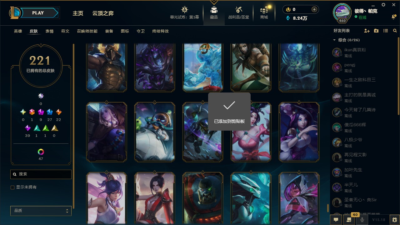 [12288962]1终极 9神话 27限定 22传说 39史诗 221皮肤 62炫彩 171英雄 可二次 可修改实名 优质装备:至臻 神龙尊者均衡之龙 沃利贝尔,源代码 乐芙兰,防爆天使 凯尔,暗影 沃里克,都铎王朝 图奇,红桃杰克 崔斯特,未来战士,至臻 花仙使者 卡特琳娜,弹幕天使 卡莎 炽天使·勇敢,无畏骑士 瑟庄妮 赤子初心,至臻 天龙之子 伊泽瑞尔,可爱可爱粉红红 布里茨,净雪之月 莫甘娜 冬虹,殿堂传奇 乐芙兰 登神,魔女 阿狸 饕餮,殿堂传奇 乐芙兰,水晶掠夺者 卡兹克,魔女 阿卡丽 虚荣 至臻:殿堂传奇 乐芙兰,水晶掠夺者 卡兹克 海克斯:海克斯 雷克顿,海克斯 克格莫 情人节限定:甜心宝贝 安妮 赛季限定皮:胜利凤凰 艾尼维亚,胜利剑圣 易,胜利女神 娑娜,胜利巨口 克格莫,胜利之王 泰达米尔 冠军限定系列:S3 SKT T1 劫,S3 SKT T1 婕拉,S5 SKT T1 阿利斯塔,S5 SKT T1 瑞兹,S6 SKT T1 球女,S8 IG 卡莎,S9 FPX 普朗克,S11 EDG 佛耶戈 冰雪节限定:魄罗骑士 瑟庄妮,圣诞精灵 崔丝塔娜,邪恶圣诞老人 维迦,雪默丁格,雪装 奈德丽 泳池派对:泳池派对 吉格斯,泳池派对 菲奥娜 年限:点心宝贝 阿木木,天龙之子 斯莫德,猴年 莫甘娜 周年:10周年 安妮