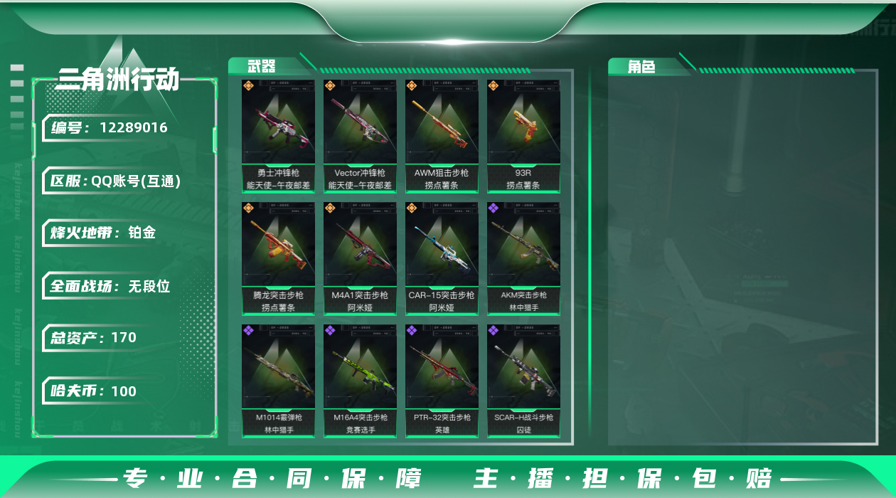 [12289016]总资产:170.6M 7传说枪械 哈夫币:100K 顶级安全箱(9.17到期) 可二次 可修改实名 优质装备:顶级安全箱(3x3) 烽火地带段位:铂金 全面战场段位:无段位 传说武器皮肤:M4A1突击步枪-阿米娅,CAR-15突击步枪-阿米娅,AWM狙击步枪-捞点薯条,腾龙突击步枪-捞点薯条,93R-捞点薯条,勇士冲锋枪-能天使-午夜邮差,Vector冲锋枪-能天使-午夜邮差 史诗武器皮肤:勇士冲锋枪-深海恐惧,AKM突击步枪-林中猎手,M16A4突击步枪-竞赛选手,M1014霰弹枪-林中猎手,SV-98狙击步枪-林中猎手,PTR-32突击步枪-英雄,SCAR-H战斗步枪-囚徒,Vector冲锋枪-阿萨拉文明
