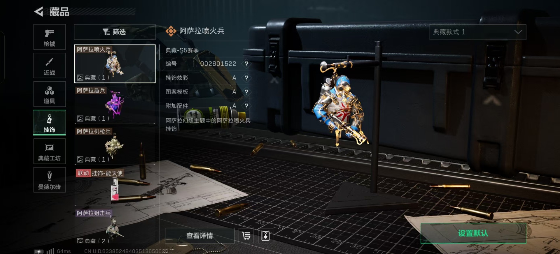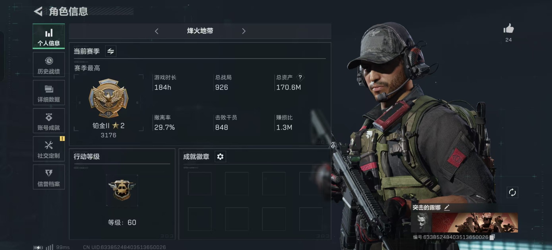 - [12090853]总资产:175.9M 1干员外观 1近战传说 14传说枪械 哈夫币:12.335K 高级安全箱(9.17到期) 可二次 可修改实名 优质装备:近战-北极星 烽火地带段位:黄金 全面战场段位:无段位 传说武器皮肤:M4A1突击步枪-阿米娅,CAR-15突击步枪-阿米娅,复合弓-黑-天际线,AWM狙击步枪-捞点薯条,QCQ171冲锋枪-北极星,腾龙突击步枪-捞点薯条,93R-捞点薯条,AK-12突击步枪-特斯拉线圈,SR-3M紧凑突击步枪-特斯拉线圈,UZI冲锋枪-特斯拉线圈,勇士冲锋枪-能天使-午夜邮差,725双管霰弹枪-送葬人-无题密令,K437突击步枪-北极星 史诗武器皮肤:PKM通用机枪-蝮蛇,PKM通用机枪-荒野求生,SR-3M紧凑突击步枪-荒野求生,SV-98狙击步枪-林中猎手,SVD狙击步枪-荒野求生,AS Val突击步枪-典狱官,SCAR-H战斗步枪-囚徒,腾龙突击步枪-无垢,PSG-1射手步枪-无垢 干员外观:蜂医-送葬人·无题密令(S5)