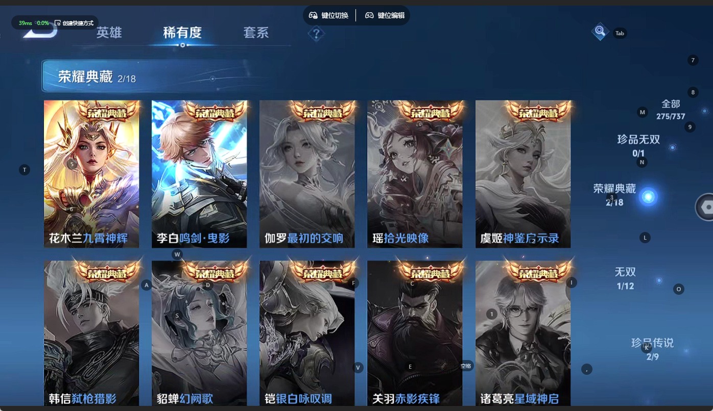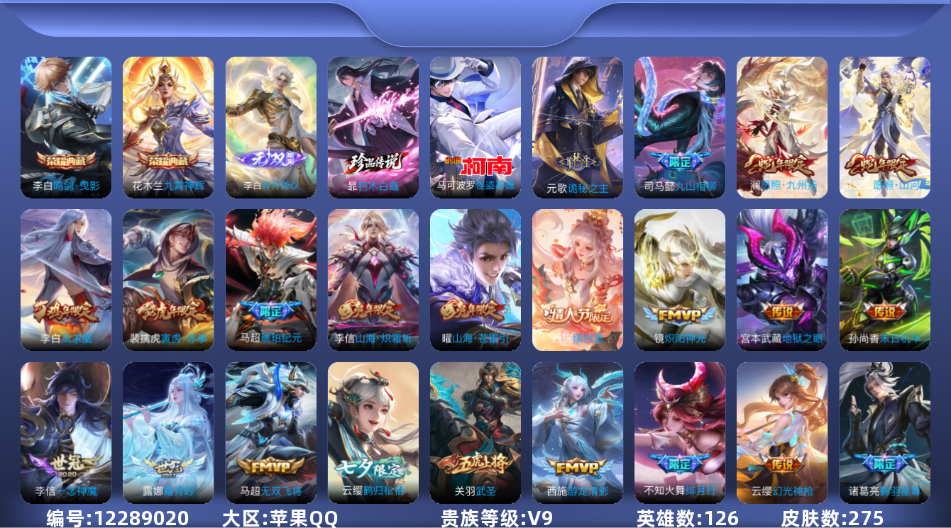 [12289020]V9 2典藏 1无双 2珍品传说 32传说 126英雄 275皮肤 可修改实名 优质装备:鸣剑·曳影,九霄神辉(木兰典藏),碎月剑心(李白无双),怪盗基德,朽木白哉,炽阳神光,一念神魔,末日机甲-孙尚香(绿蚂蚱),仲夏夜之梦(大飞蛾),地狱之眼,乞巧织情,游龙清影(小青龙),无双飞将,山海·炽霜斩(李信年限),山海·苍雷引(电光曜子),燃星之曲,记忆之芯(机甲兔),鹤羽星尊,鹤归松栖(云缨),霜月吟,琥珀纪元马超,诡秘之主,涂山容容 传说皮:幻光神枪,续相思,九山相柳 珍宝阁皮:妄想食味,优雅恋人 限定皮:愿照·九州拓(澜年限),愿照·山河定(司空震年限),逐霄战戟,鸣野蒿,至尊宝,凤求凰(白切鸡),傲雪梅枪,绯月行,飞衡(韩信年限),山海·碧波行(瑶年限),瑞麟志(木兰年限),遇见飞天,诗剑行,齐天大圣,怒海麟威,五谷丰年,武圣,寅虎·赤拳(老虎年限),玉兔公主,枫霜尽,山海·玄木吟(马可年限) 史诗皮:赞萌露比,化蝶舞,雪豹·霜爪,龙之律动,琥珀纪元伽罗,石田雨龙,飞车小橘子,百相守梦-百里守约,谪仙醉月,破空之剑,涂山红红,百相守梦-黄忠,星界战将,紫霞仙子,苍穹之光,电玩小子(小书包),黄金分割率,特工魅影,千年之狐,永昼,鹤归松栖(赵怀真),江河有灵,龙骑士(小龙虾),百解令(蒙犽),高渐离燃音魔法,蒙恬荣光圣徽,晚萤,无限星赏官,偶像歌手,电玩·爆裂旋风,百相守梦(刘备),银翎春语,暗夜猫娘,末日机甲-吕布,猫狗日记-大乔,乱世虎臣,节奏热浪,女仆咖啡,摇滚巨星,水果甜心,绅士熊喵,天才门将,心灵骇客,德古拉伯爵,暗隐猎兽者,幽灵船长,鬼剑武藏,心灵战警,天秀·启明,纤云弄巧,拒霜思,缤纷独角兽,乘风破浪,逐浪之夏,月团寄思,水晶猎龙者,曙光守护者,箭羽风息,金属风暴,原初追逐者,圣诞狂欢,圣诞恋歌,鹰眼统帅,暗夜贵公子,魅力维加斯,黎明之约,赏金猎手,无心,未来纪元-赵云