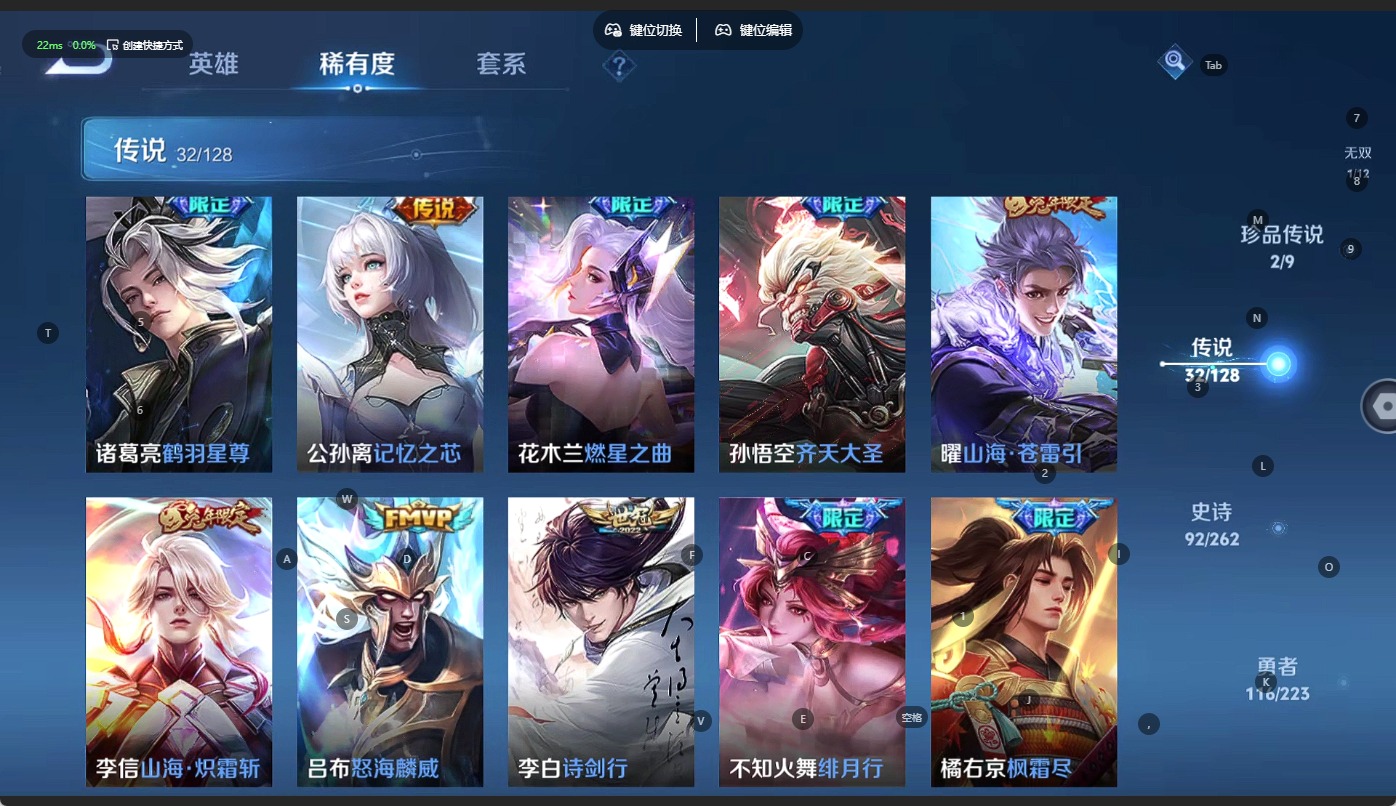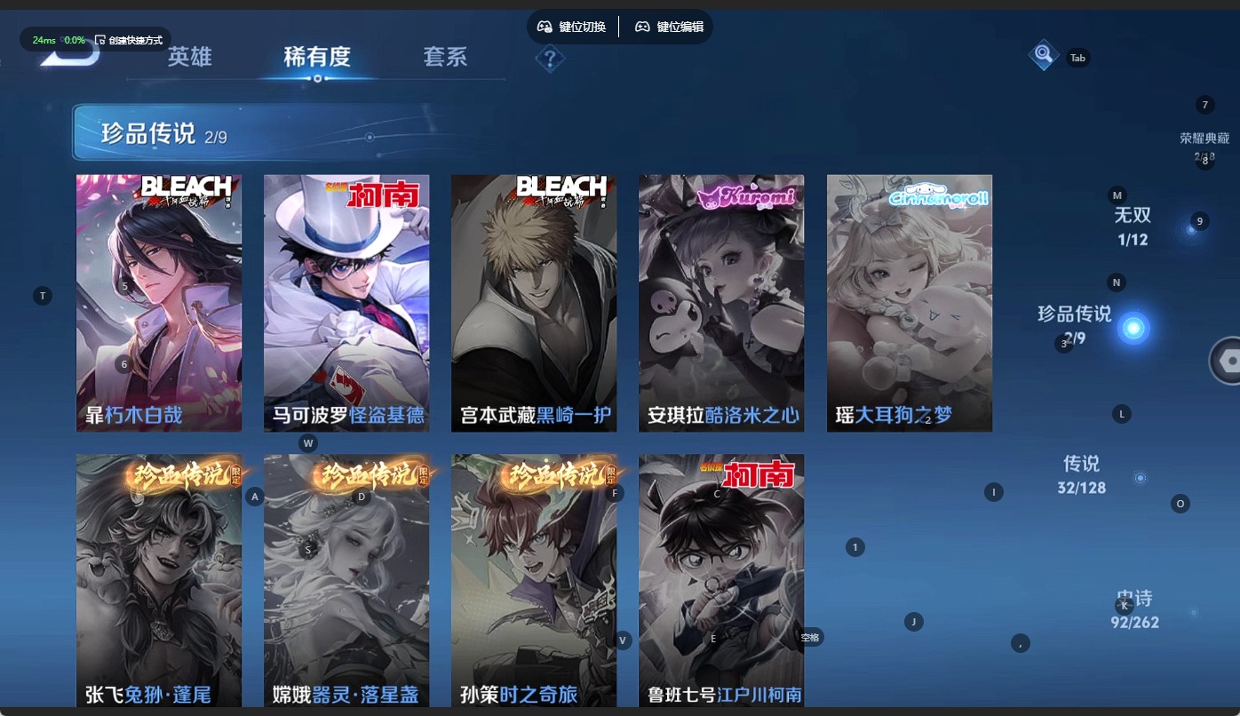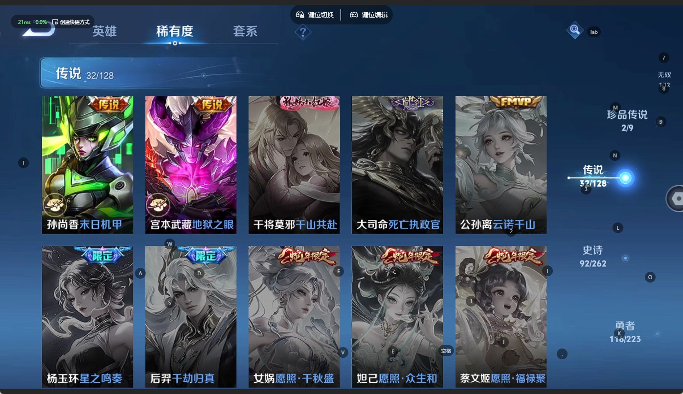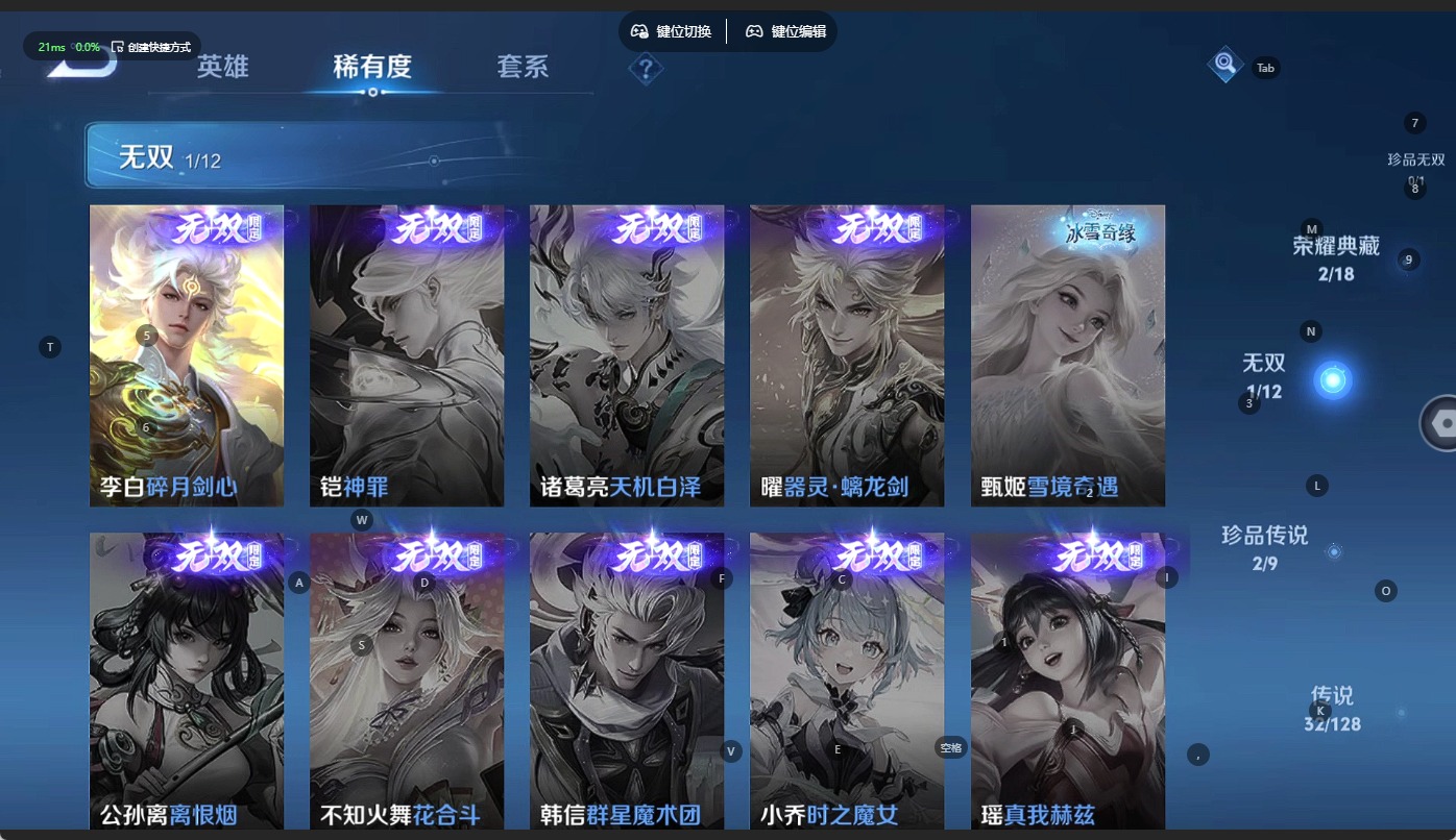 - PX_2104895-Q/无双王者/441皮肤/125英雄/2典藏/0珍品无双/4无双/7珍品传说/30传说/144史诗/9稀有英雄 【7 珍品传说】酷洛米之心 安琪拉,大耳狗之梦 瑶,怪盗基德 马可波罗,时之奇旅 孙策,器灵·落星盏 嫦娥,江户川柯南 鲁班七号,兔狲·蓬尾 张飞, 【2 典藏皮肤】鸣剑·曳影 李白,天鹅之梦 小乔, 【4 无双皮肤】时之魔女 小乔,真我赫兹 瑶,离恨烟 公孙离,花