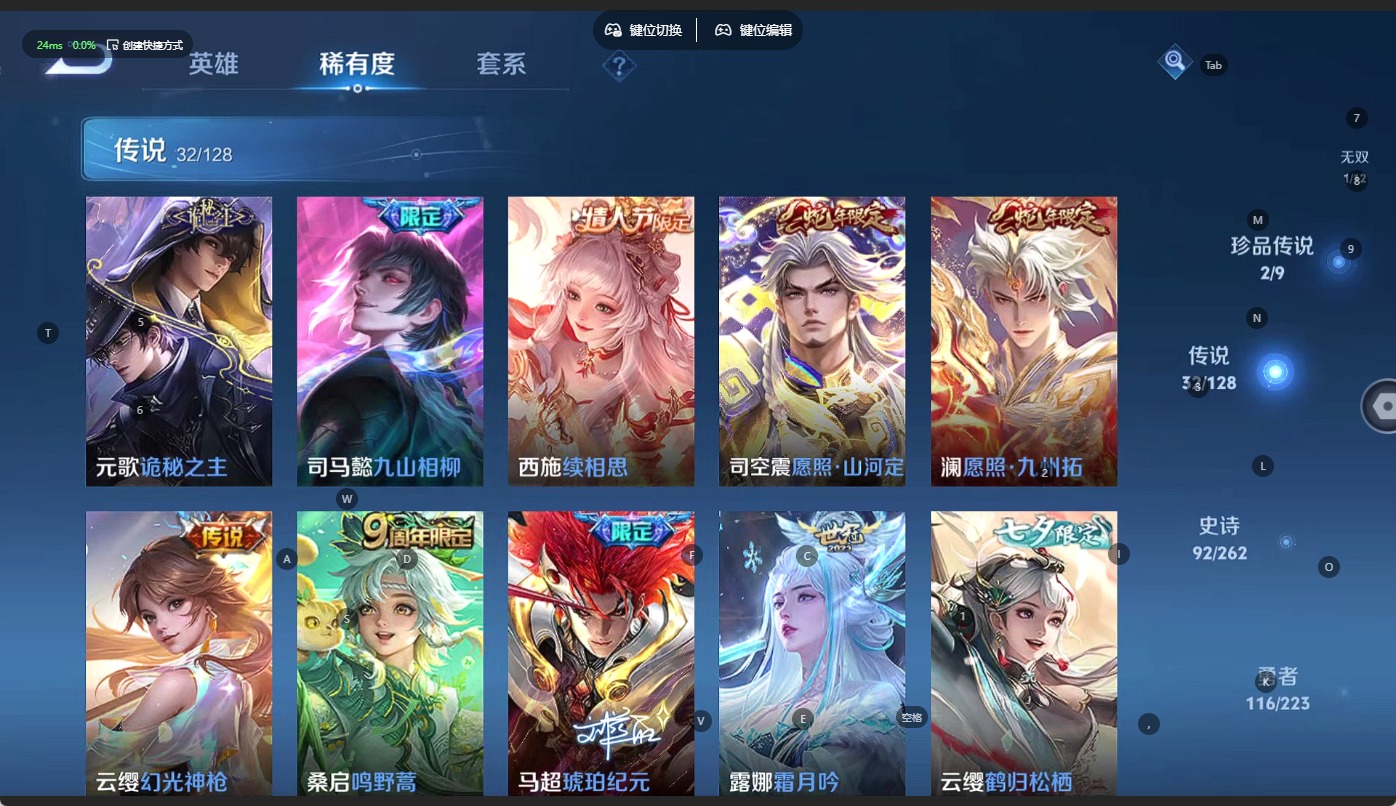 - [12089186]V6 1珍品传说 2传说 125英雄 246皮肤 可修改实名 优质装备:器灵·落星盏,炽阳神光 珍宝阁皮:妄想食味,玩趣恶龙 限定皮:愿照·山河定(司空震年限),高山流水,梁祝,李小龙,山海·玄木吟(马可年限) 史诗皮:苍鳞隐世,器灵·浮梦炉,绮世丹青,化蝶舞,龙之律动,百相守梦-周瑜,茶境仙,百相守梦-黄忠,紫霞仙子,江河有灵,百解令(蒙犽),蒙恬荣光圣徽,电玩·爆裂旋风,末日机甲-吕布,乱世虎臣,修罗,女仆咖啡,摇滚巨星,水果甜心,鬼剑武藏,舞动绿茵,地狱岩魂,纤云弄巧,缤纷独角兽,水晶猎龙者,曙光守护者,金属风暴,原初追逐者,圣诞恋歌,鹰眼统帅,魅力维加斯,黎明之约,无心,未来纪元-赵云
