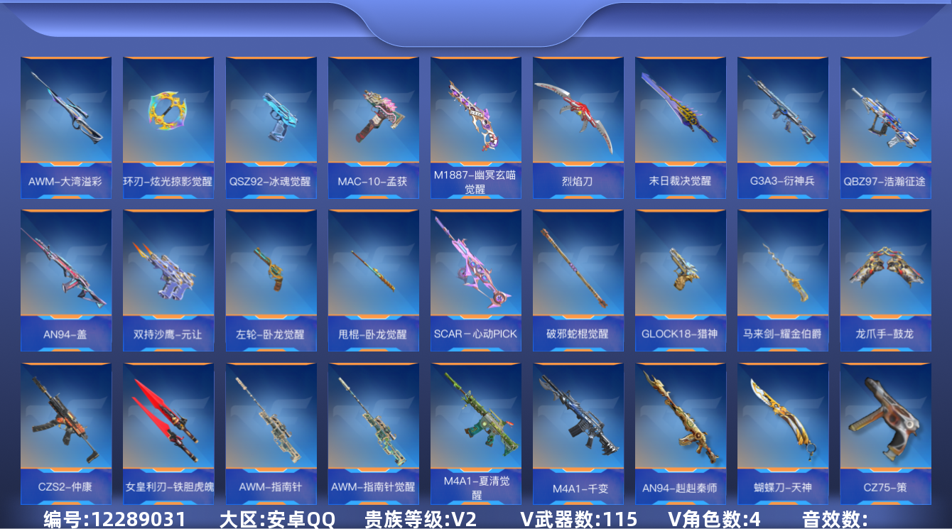[12289031]可二次 可修改实名 V2 2王者武器 115英雄武器 4英雄角色 179万化 枪皇SSS 武器:王者之影,M200-幻神,CZ75-策,81式-光明之神,TAC-慈,KSG-孟获,M4A1-雷神,AK47-无影,AK47-火麒麟,巴雷特-极光,巴雷特-毁灭,M4A1-堕天神,QBZ03-死神,QBZ03-金色蔷薇,QBZ19-天使,98K-黑骑士,QBB95-极光,双持斯泰尔-天使,AK47-血武士,M4A1-猎神,M4A1-夏清觉醒,M4A1-千变,M4A1-海骑士,AK12-天启,AWM-天龙,98K-星神,09式狙-天神,SCAR-幽暗骑士,CBJ-MS-毒蜂,汤姆逊-烈龙,CZS2-心动次元,CZS2-血月,加特林-堡垒,QBZ03-玉面羞花,M14EBR-拂影,AK47-破空冰刃,MK47-鼓龙,AA12-火药,地狱火,打击者-天神,HK416-极光,AN94-赳赳秦师,M4A1-太白诗仙,方天画戟,毛瑟-毒蜂,沙鹰-神兵修罗,气手枪-血月,M16-恶魔,QBB95-再战涿鹿,手斧-机械迷城,尼泊尔-冰锋觉醒,M4A1-铁胆虎魄,擎天,马来剑-毁灭,MK47-塔罗牌觉醒,丛林匕首-火力竞放觉醒,神罚战斧,丛林匕首-庆龙觉醒,屠龙,星芒,太白诗仙扇,电锯-毒蜂,蝴蝶刀-天神,女皇利刃-铁胆虎魄,烟雾弹-天使,高爆手雷-雷暴,闪光弹-雷暴,黑骑士手雷,黑骑士闪光弹,燃烧弹-游骑兵,烟雾弹-游骑兵,闪光弹-游骑兵,闪光弹-惊涛骇浪,死神闪光弹,高爆手雷-无限,高爆手雷-神工天巧,手雷-鼓龙,甩棍-卧龙觉醒,GLOCK18-猎神,龙爪手-鼓龙,双持沙鹰-元让,左轮-卧龙觉醒,AN94-盖,SCAR-心动PICK,AWM-指南针,QBZ97-浩瀚征途,AWM-指南针觉醒,王者之霆,CZS2-仲康,马来剑-耀金伯爵,破邪蛇棍觉醒,烟雾弹-星际宇航,G3A3-衍神兵,末日裁决觉醒,M1887-幽冥玄喵觉醒,MAC-10-孟获,QSZ92-冰魂觉醒,烈焰刀,手雷-游骑兵,AWM-大湾溢彩,环刃-炫光掠影觉醒