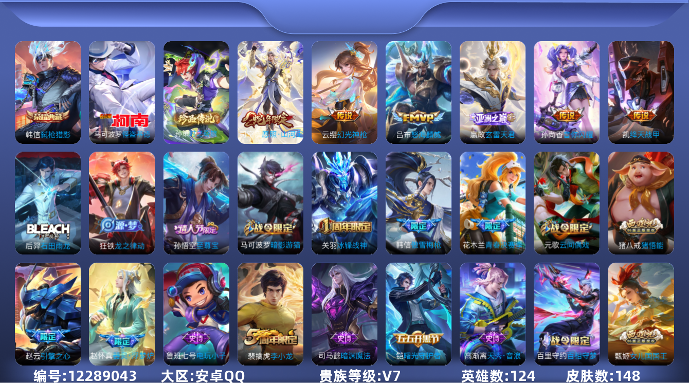 [12289043]V7 1典藏 2珍品传说 6传说 124英雄 148皮肤 可修改实名 优质装备:弑枪猎影(韩信典藏),怪盗基德,绛天战甲(鸡嘴战神),音你闪耀(rap皮),玄雷天君 珍品传说:时之奇旅-孙策 传说皮:幻光神枪 珍宝阁皮:玩趣恶龙 限定皮:愿照·山河定(司空震年限),逐霄战戟,至尊宝,傲雪梅枪,怒海麟威,冰锋战神,李小龙,猪悟能,引擎之心,青春决赛季,匿光追影者,女儿国国王 史诗皮:器灵·浮梦炉,龙之律动,石田雨龙,茶境仙,百相守梦-百里守约,苍穹之光,电玩小子(小书包),黄金分割率,偶像歌手,末日机甲-吕布,猫狗日记-孙策,乱世虎臣,节奏热浪,水果甜心,绅士熊喵,天才门将,星夜王子,心灵骇客,鬼剑武藏,暗渊魔法,心灵战警,乐园奇幻夜,天秀·启明,乘风破浪,逐浪之夏,曙光守护者,箭羽风息,金属风暴,鹰眼统帅,魅力维加斯,黎明之约,天秀·音浪