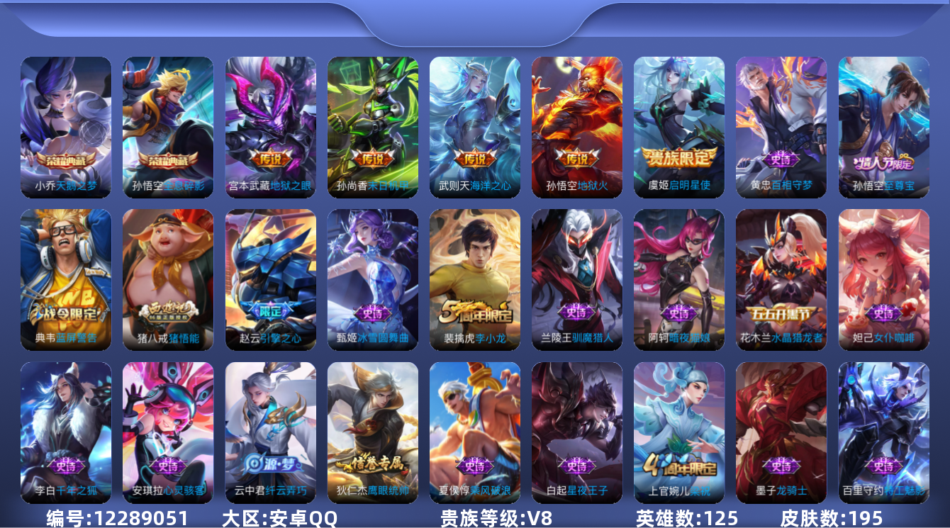[12289051]V8 2典藏 5传说 125英雄 195皮肤 典藏英雄武则天 可修改实名 优质装备:天鹅之梦(小乔典藏),全息碎影(猴子典藏),末日机甲-孙尚香(绿蚂蚱),地狱火,海洋之心,地狱之眼 珍宝阁皮:优雅恋人 限定皮:至尊宝,遇见飞天,高山流水,游园惊梦,梁祝,李小龙,猪悟能,引擎之心 史诗皮:百相守梦-黄忠,苍穹之光,白龙吟,特工魅影,千年之狐,偶像歌手,暗夜猫娘,龙骑士(小龙虾),女仆咖啡,水果甜心,星夜王子,心灵骇客,暗隐猎兽者,鬼剑武藏,心灵战警,舞动绿茵,纤云弄巧,繁星吟游(呼啦呼啦),乘风破浪,逐浪之夏,水晶猎龙者,金属风暴,圣诞狂欢,圣诞恋歌,鹰眼统帅,魅力维加斯