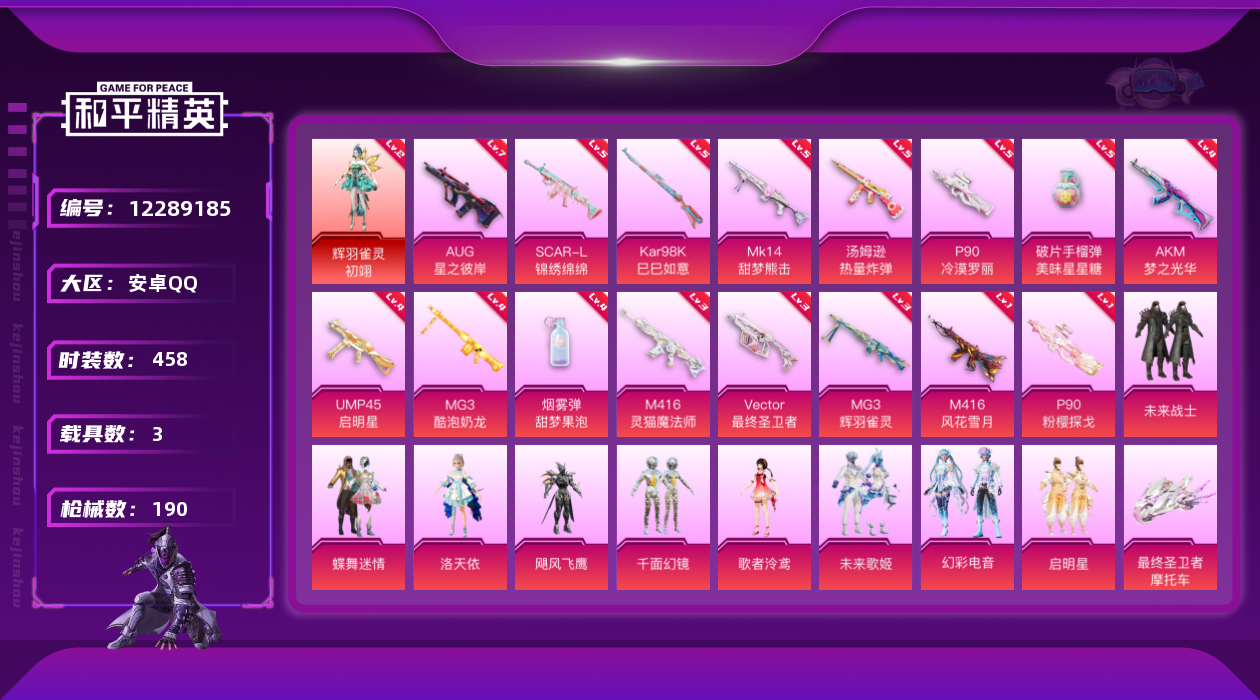 [12289185]1红装 9粉装 16特效枪 3载具 9印记 可二次 可修改实名 连体王者 身法装备:都市猎人,暗影哥特(红眼罩),萌熊伴侣背包(粉熊背包) 优质装备:辉羽雀灵-初翊,二级辉羽雀灵-初翊,辉羽雀灵自行车,虚妄之影(炫耀紫),最终圣卫者摩托车,都市猎人,萌熊伴侣背包(粉熊背包),蝶舞迷情,未来战士,AUG星之彼岸,AKM梦之光华,M416风花雪月,洛天依,UMP45启明星,P90粉樱探戈,MG3酷泡奶龙,SCAR-L-锦绣绵绵,七级AUG-星之彼岸,MK14-甜梦熊击,MG3-辉羽雀灵,烟雾弹-甜梦果泡,幻彩电音,Vector-最终圣卫者,P90-冷漠罗丽,汤姆逊-热量炸弹,破片手榴弹-美味星星糖,M416-灵猫魔法师,Kar98K-巳巳如意 热门装扮:飓风飞鹰,千面幻镜,启明星,歌者泠鸢,未来歌姬,暗夜行者,动感兔斯基,鹰眼刺客,梦魇先生,深海小丑鱼,东方飞龙,都市猎人 五级特效枪:五级Kar98K-巳巳如意,五级P90-冷漠罗丽,五级汤姆逊-热量炸弹,五级破片手榴弹-美味星星糖,五级MK14-甜梦熊击,五级SCAR-L-锦绣绵绵 四级特效枪:四级烟雾弹-甜梦果泡,四级UMP45-启明星,四级MG3-酷泡奶龙,四级AKM-梦之光华 三级特效枪:三级Vector-最终圣卫者,三级M416-灵猫魔法师,三级MG3-辉羽雀灵 一级特效枪:一级P90-粉樱探戈,一级M416-风花雪月 紫色装扮:田园牧歌,轻风白浪,和煦暖阳,SS22特训,白啸长虹,SS23特训,幻彩翩翩,妙红点点,白兰地假日,苍岚星,娇憨猪猪,萌趣咩咩,SS21特训,熠彩粉晶,紫芒星,SS31特训套装,虚空漩涡,冰川特警,冷焰舞者,云朵鹅,彩虹兔,雪绒豹,SS33特训套装,青涩时光,顶瓜瓜,诡诞巡游,混沌火种,SS20特训,暗夜傀儡,微雨春柳,猎梦纪元,粉团憨憨,豚鼠丹丹,软羊咩咩,甜心亚梦,虚音幻奏,瑞龙福将,团圆交子,SS17特训,都市漫游者,酷潮明星,长空猛禽,雪鹰学院,霓虹街区,青年教官,荷畔雨呱,缤纷果语,耀眼新星,蓝彩潮人,蓝色守护者,虎虎生威吉莉,蜜露汐语,飞行日记,魅力单车,鹤鸣,麻辣教官,龙的传人,龟仙人,海岛探路者,夏日倾情,完美偶像,帅气教官,幻世战舞者,探宝勇士,空岛之星,牛气冲天,牛气满满,猛禽,异域银装,玉兔迎春,竞技名士,暗影哥特(红眼罩),惊鸿侠骨,SS24特