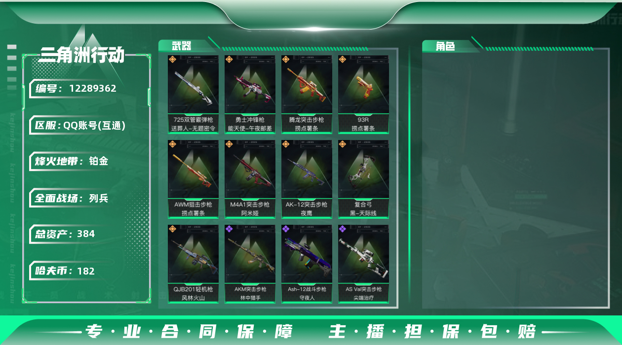 [12289362]总资产:384 9传说枪械 高级安全箱(9.17到期) 可二次 可修改实名 烽火地带段位:铂金 全面战场段位:列兵 哈夫币:182 传说武器皮肤:QJB201轻机枪-风林火山,AK-12突击步枪-夜鹰,M4A1突击步枪-阿米娅,复合弓-黑-天际线,AWM狙击步枪-捞点薯条,腾龙突击步枪-捞点薯条,93R-捞点薯条,勇士冲锋枪-能天使-午夜邮差,725双管霰弹枪-送葬人-无题密令 史诗武器皮肤:AUG突击步枪-蝮蛇,M700狙击步枪-蝮蛇,SR-25射手步枪-战场英杰,PKM通用机枪-荒野求生,AS Val突击步枪-尖端治疗,M700狙击步枪-守夜人,Ash-12战斗步枪-守夜人,MP5冲锋枪-深海恐惧,勇士冲锋枪-深海恐惧,SG552突击步枪-深海恐惧,AKM突击步枪-林中猎手,SVD狙击步枪-暗夜猎手,M16A4突击步枪-竞赛选手,SVD狙击步枪-荒野求生,M1014霰弹枪-林中猎手,SV-98狙击步枪-林中猎手,PTR-32突击步枪-英雄,PSG-1射手步枪-无垢,M250通用机枪-囚徒,腾龙突击步枪-无垢,MP7冲锋枪-无垢,QBZ95-1突击步枪-曙光,沙漠之鹰-曙光,SVD狙击步枪-阿萨拉工艺,S12K霰弹枪-曙光
