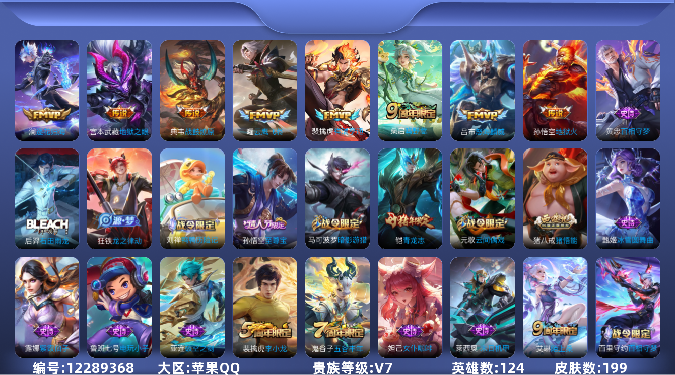[12289368]V7 8传说 124英雄 199皮肤 可修改实名 女号 优质装备:云鹰飞将(小将军),地狱火,地狱之眼,澜逐花归海 传说皮:典韦战鼓燎原,祥瑞亨通 珍宝阁皮:胡桃夹子,玩趣恶龙 限定皮:逐霄战戟,陌上桑,鸣野蒿,至尊宝,怒海麟威,五谷丰年,青龙志(铠年限),李小龙,猪悟能,美猴王 史诗皮:鸭鸭历险记-刘禅,星界战将,龙之律动,石田雨龙,茶境仙,破空之剑,百相守梦-百里守约,百相守梦-黄忠,紫霞仙子,电玩小子(小书包),特工魅影,千年之狐,末日机甲-莱西奥,百解令(蒙犽),冰冠公主,猫狗日记-孙策,节奏热浪,女仆咖啡,摇滚巨星,水果甜心,星夜王子,功夫厨神,德古拉伯爵,暗隐猎兽者,鬼剑武藏,舞动绿茵,纤云弄巧,乘风破浪,热力回旋,箭羽风息,金属风暴,圣诞狂欢,圣诞恋歌,鹰眼统帅,魅力维加斯,未来纪元-赵云