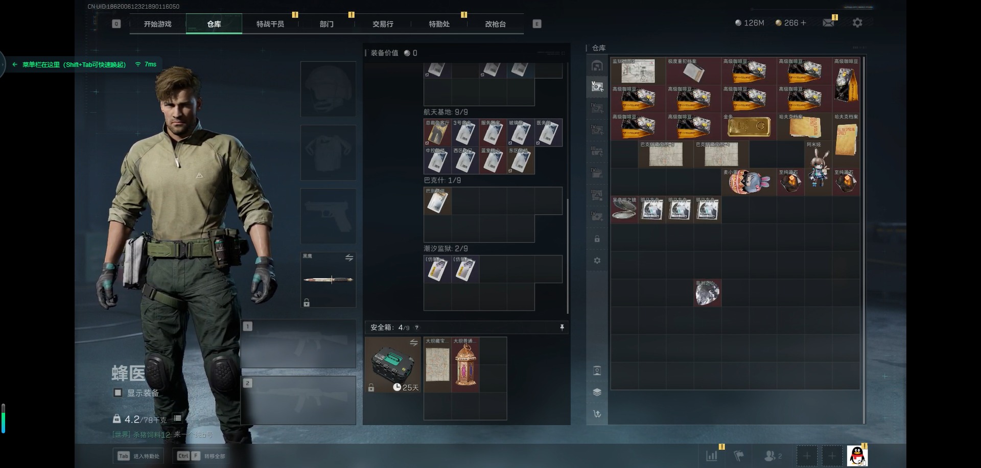 [12289382]总资产:205.7M 2干员外观 5传说枪械 哈夫币:126K 顶级安全箱(9.17到期) 可二次 可修改实名 优质装备:顶级安全箱(3x3),非洲之心 烽火地带段位:黑鹰 全面战场段位:上等兵 传说武器皮肤:AK-12突击步枪-夜鹰,SMG45冲锋枪-骑士,复合弓-黑-天际线,勇士冲锋枪-能天使-午夜邮差,CAR-15突击步枪-黑鹰坠落 史诗武器皮肤:PKM通用机枪-蝮蛇,G3战斗步枪-战场英杰,SR-25射手步枪-尖端治疗,AS Val突击步枪-尖端治疗,SG552突击步枪-尖端治疗,Ash-12战斗步枪-守夜人,MP5冲锋枪-深海恐惧,勇士冲锋枪-深海恐惧,AKM突击步枪-林中猎手,.357左轮-幸运时刻,SVD狙击步枪-暗夜猎手,M16A4突击步枪-竞赛选手,PKM通用机枪-守夜人,M1014霰弹枪-林中猎手,SV-98狙击步枪-林中猎手,M250通用机枪-囚徒,SV-98狙击步枪-囚徒,QBZ95-1突击步枪-曙光,Vector冲锋枪-阿萨拉文明,SVD狙击步枪-阿萨拉工艺,S12K霰弹枪-曙光,PKM通用机枪-英雄,M700狙击步枪-竞技风 干员外观:无名-夜鹰,露娜-黑·天际线