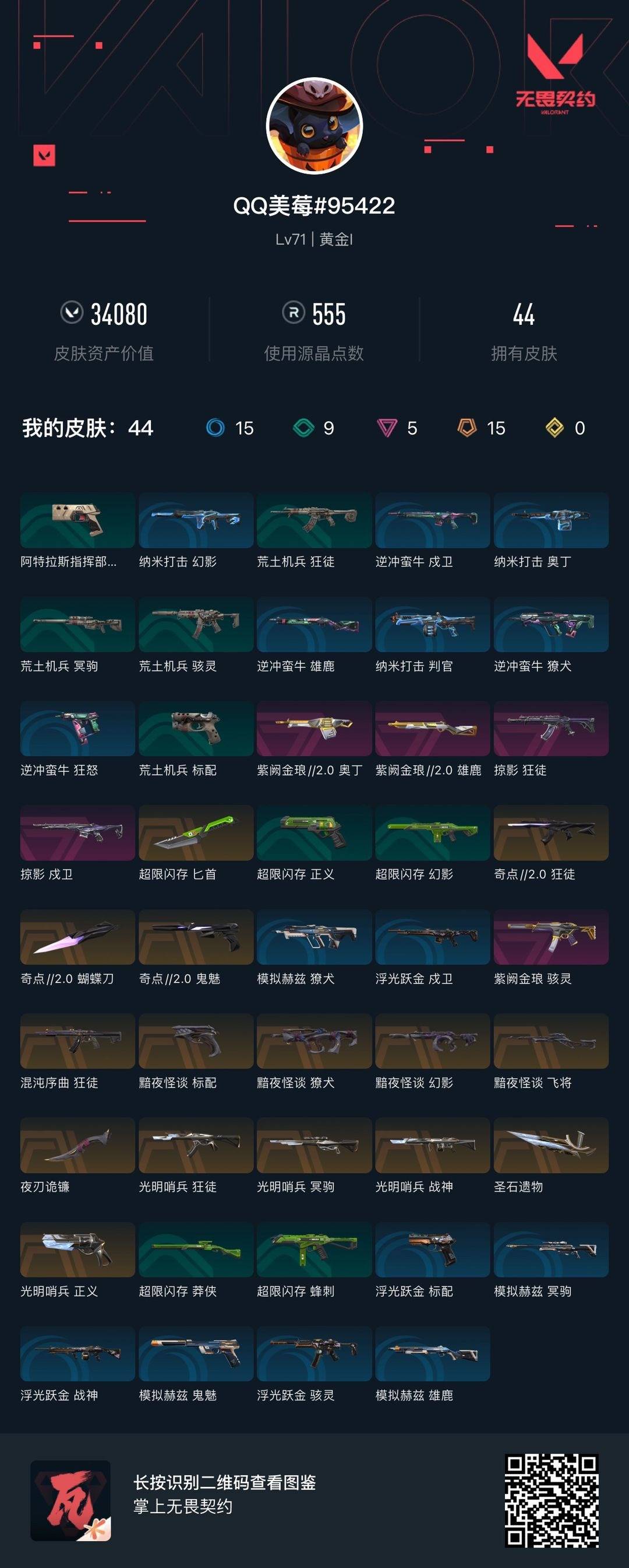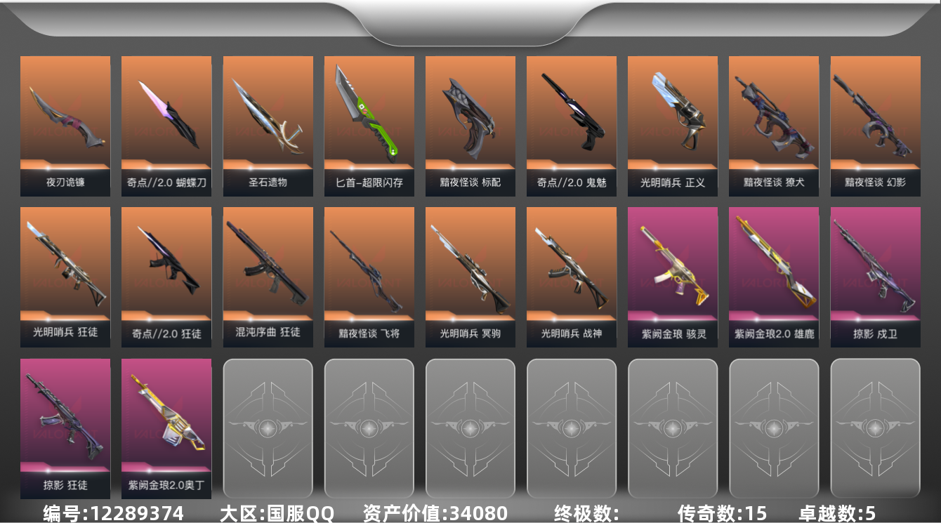 [12289374]15橙皮 5紫皮 44皮肤 23英雄 55卡面 555已用源晶 黄金 优质装备:光明哨兵1.0套装,黯夜怪谈套装,奇点//2.0套装,狂徒-混沌序曲,狂徒-光明哨兵,冥驹-光明哨兵,狂徒-掠影,幻影-黯夜怪谈,正义-光明哨兵,狂徒-奇点//2.0,戍卫-掠影,奥丁-紫阙金琅2.0,夜刃诡镰,匕首-超限闪存,圣石遗物,鬼魅-奇点//2.0,蝴蝶刀-奇点//2.0,骇灵-紫阙金琅,雄鹿-紫阙金琅2.0 佩枪皮肤:标配-黯夜怪谈 步枪皮肤:獠犬-黯夜怪谈 狙击枪皮肤:飞将-黯夜怪谈 机枪皮肤:战神-光明哨兵