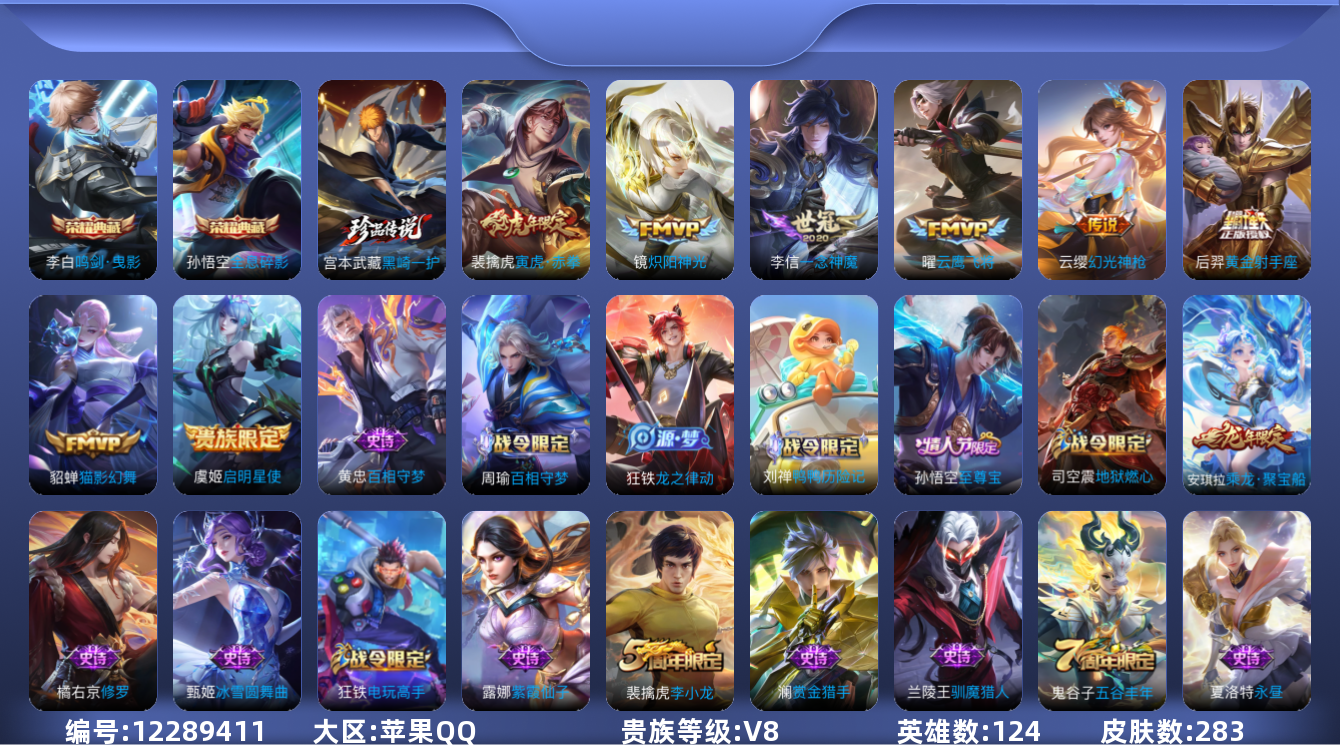 [12289411]V8 2典藏 1珍品传说 8传说 124英雄 283皮肤 可修改实名 优质装备:鸣剑·曳影,全息碎影(猴子典藏),黑崎一护,黄金射手座,云鹰飞将(小将军),猫影幻舞,炽阳神光,一念神魔 传说皮:幻光神枪 珍宝阁皮:蔷薇恋人 限定皮:逐霄战戟,至尊宝,遇见飞天,高山流水,五谷丰年,梁祝,李小龙,寅虎·赤拳(老虎年限) 史诗皮:鸭鸭历险记-刘禅,龙之律动,百相守梦-周瑜,茶境仙,乘龙·聚宝船(安琪拉年限),百相守梦-百里守约,百相守梦-黄忠,紫霞仙子,苍穹之光,黄金分割率,千年之狐,永昼,江河有灵,百解令(蒙犽),高渐离燃音魔法,无限星赏官,偶像歌手,电玩·爆裂旋风,末日机甲-吕布,猫狗日记-孙策,乱世虎臣,节奏热浪,修罗,女仆咖啡,摇滚巨星,水果甜心,绅士熊喵,天才门将,星夜王子,功夫厨神,德古拉伯爵,暗隐猎兽者,幽灵船长,鬼剑武藏,心灵战警,乐园奇幻夜,地狱岩魂,纤云弄巧,拒霜思,缤纷独角兽,乘风破浪,逐浪之夏,水晶猎龙者,金属风暴,圣诞狂欢,圣诞恋歌,鹰眼统帅,暗夜贵公子,魅力维加斯,赏金猎手,未来纪元-赵云
