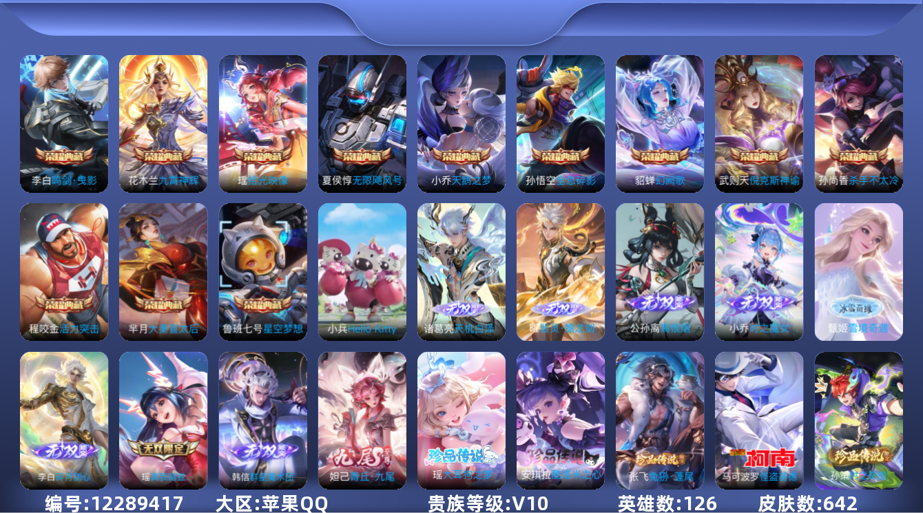 [12289417]V10 12典藏 9无双 7珍品传说 113传说 126英雄 642皮肤 典藏英雄武则天 女号 可修改实名 优质装备:天鹅之梦(小乔典藏),星空梦想(太空人),倪克斯神谕(宇宙婆娘),无限飓风号(高达),活力突击,杀手不太冷,大秦宣太后,鸣剑·曳影,全息碎影(猴子典藏),九霄神辉(木兰典藏),幻阙歌(貂蝉典藏),真我赫兹(瑶)(瑶无双),青丘·九尾(妲己无双),碎月剑心(李白无双),小乔时之魔女(小乔无双),Hello Kitty,韩信群星魔术团(韩信无双),离恨烟(公孙离无双),拾光映像(瑶典藏),雪境奇遇-甄姬,器灵·螭龙剑,天机白泽,江户川柯南,怪盗基德,器灵·落星盏,酷洛米之心,大耳狗之梦,黄金狮子座,黄金射手座,冠军飞将,云鹰飞将(小将军),绛天战甲(鸡嘴战神),黄金白羊座,猫影幻舞,久胜战神,炽阳神光,一念神魔,云霓雀翎,末日机甲-孙尚香(绿蚂蚱),地狱火,仲夏夜之梦(大飞蛾),音你心动-小乔,零号·赤焰,海洋之心,地狱之眼,飞鸢探春,音你心动-周瑜,胖达荣荣,李逍遥,乞巧织情,时之恋人-刘备(电焊工),游龙清影(小青龙),淬星耀世,超时空战士-狄仁杰,遇见胡旋,末日机甲-孙策,花朝如约(花篮子),挚爱之约,挚爱花嫁,无双飞将,音你闪耀(rap皮),碎云,天秀幻梦,山海·炽霜斩(李信年限),山海·琳琅生(小乔年限),燃星之曲,画中仙,浮生妄,记忆之芯(机甲兔),青丘·九尾,百相守梦(张飞),电玩·雷克斯,灼幽烈阳,妄想实况,鹤归松栖(云缨),惊梅引,遇见神鼓,鲁班七号-时之奇旅,大乔-时之奇旅,永恒水手月亮,夜礼服假面,小动物乐团,霜月吟,澜逐花归海,艾琳觅芳踪,琥珀纪元马超,金乌负日,云中君群星魔术团,朵莉亚心动手记,牧神诗旅,玄雷天君,诡秘之主,千山共赴,涂山容容 珍品传说:时之奇旅-孙策,兔狲·蓬尾 传说皮:乘龙·问璇玑(孙尚香年限),乘龙·铭钟鼎(赵云年限),乘龙·淬吴钩(孙策年限),貂蝉曦玄引,吕布曦玄引,典韦战鼓燎原,落雪白狼,死亡执政官,九山相柳,云诺千山,续相思,星之鸣奏,祥瑞亨通,幻光神枪 珍宝阁皮:妄想食味,蔷薇恋人,女武神,玩趣恶龙 限定皮:愿照·九州拓(澜年限),愿照·福禄聚(蔡文姬年限),愿照·岁时盈(虞姬年限),愿照·山河定(司空震年限),愿照·众生和(妲己年限),愿照·千秋盛(女娲年限),逐霄战戟,映山客,陌上桑,