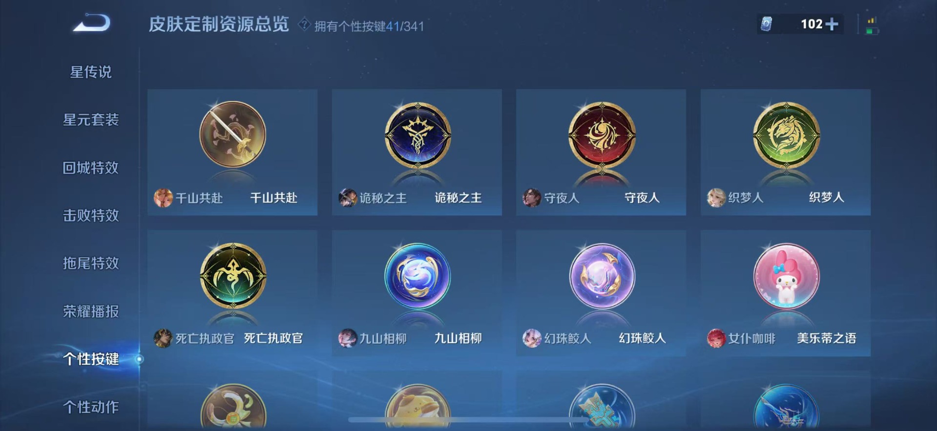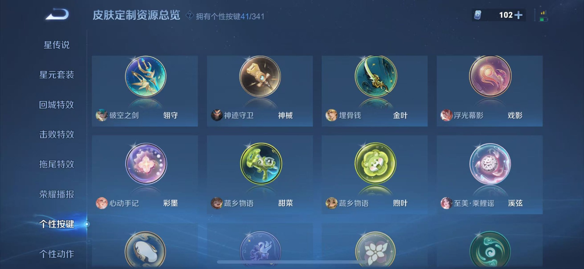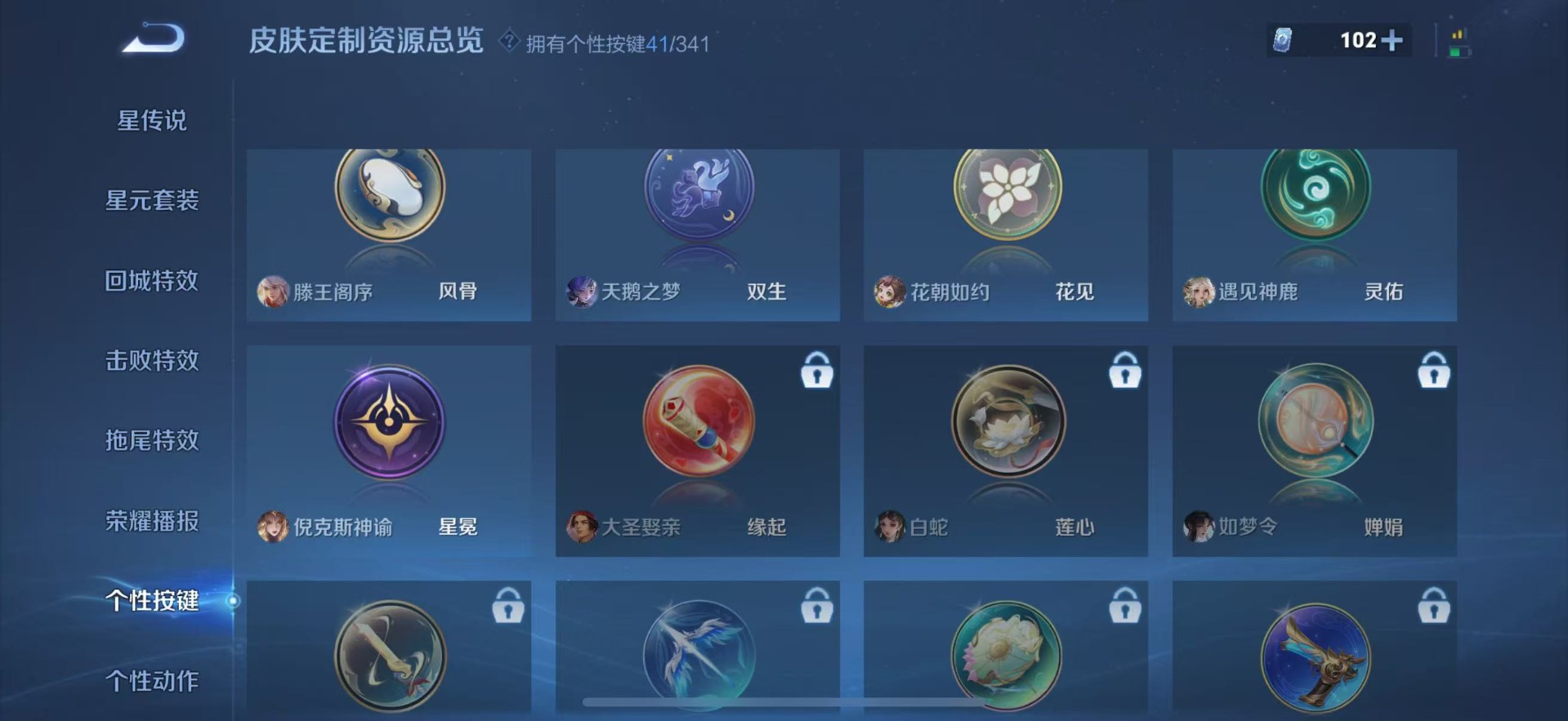 刘备时之恋人,小乔音你心动,李信一念神魔,孙尚香音你闪耀,孙尚香乘龙·问璇玑,露娜霜月吟,庄周牧神诗旅,镜炽阳神光,朵莉亚心动手记,周瑜音你心动,杨玉环星之鸣奏,宫本武藏惊梅引,貂蝉遇见胡旋,裴擒虎祥瑞亨通,貂蝉猫影幻舞,嬴政玄雷天君,张良黄金白羊座,孙悟空零号·赤焰,曜云鹰飞将,曜李逍遥,云中君群星魔术团,百里守约碎云,澜逐花归海,虞姬云霓雀翎,貂蝉曦玄引,王昭君永恒水手月亮,大乔挚爱花嫁,大乔时之奇旅,铠绛天战甲,赵云乘龙·铭钟鼎,孙膑小动物乐团,张飞百相守梦,赵云淬星耀世,干将莫邪久胜战神,典韦战鼓燎原,干将莫邪画中仙,孙策末日机甲,孙策挚爱之约,孙策乘龙·淬吴钩,达摩黄金狮子座,海月金乌负日,王昭君乞巧织情,鲁班七号时之奇旅,吕布曦玄引,吕布遇见神鼓,公孙离记忆之芯,亚连落雪白狼,夏洛特浮生妄,艾琳觅芳踪,西施游龙清影,西施续相思,狄仁杰夜礼服假面,马超琥珀纪元,马超无双飞将,李元芳飞鸢探春,蔡文姬花朝如约,云缨幻光神枪