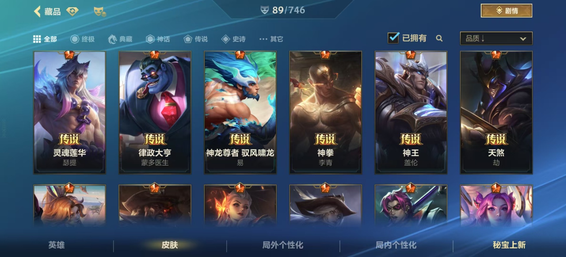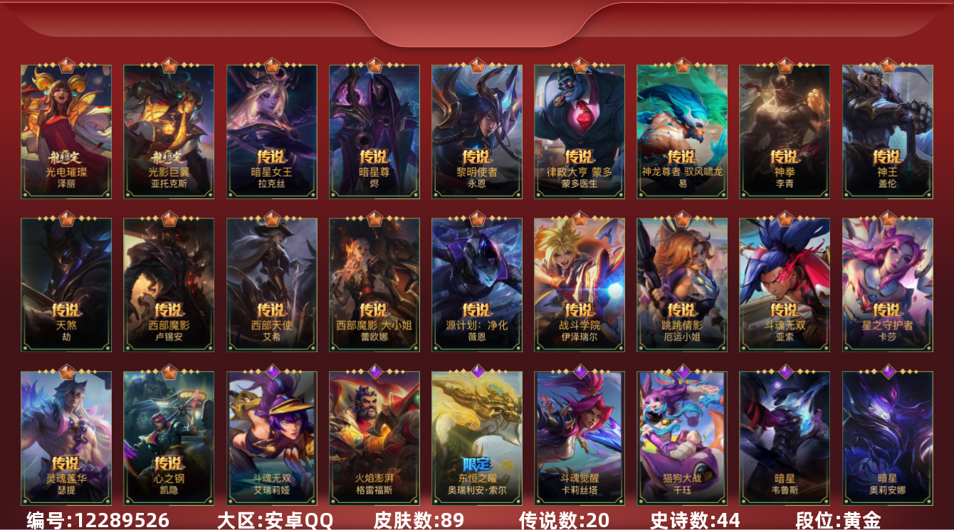 [12289526]20传说 44史诗 89皮肤 可二次 可修改实名 优质装备:暗星尊,律政大亨,神龙尊者 驭风啸龙,神拳盲僧,神王盖伦,天煞劫,西部魔影卢锡安,西部天使寒冰,源计划:净化,战斗学院ez,暗星女王拉克丝,跳跳倩影女枪,星之守护者卡莎,灵魂莲华腕豪,心之钢凯隐 段位:黄金 传说皮:光影巨翼亚托克斯,西部魔影大小姐蕾欧娜,光电璀璨泽丽,斗魂无双亚索,黎明使者永恩 亮点:暗星尊,律政大亨,神龙尊者 驭风啸龙,神拳盲僧,神王盖伦,天煞劫,西部魔影卢锡安,西部天使寒冰,源计划:净化,战斗学院ez,暗星女王拉克丝,跳跳倩影女枪,星之守护者卡莎,灵魂莲华腕豪,心之钢凯隐