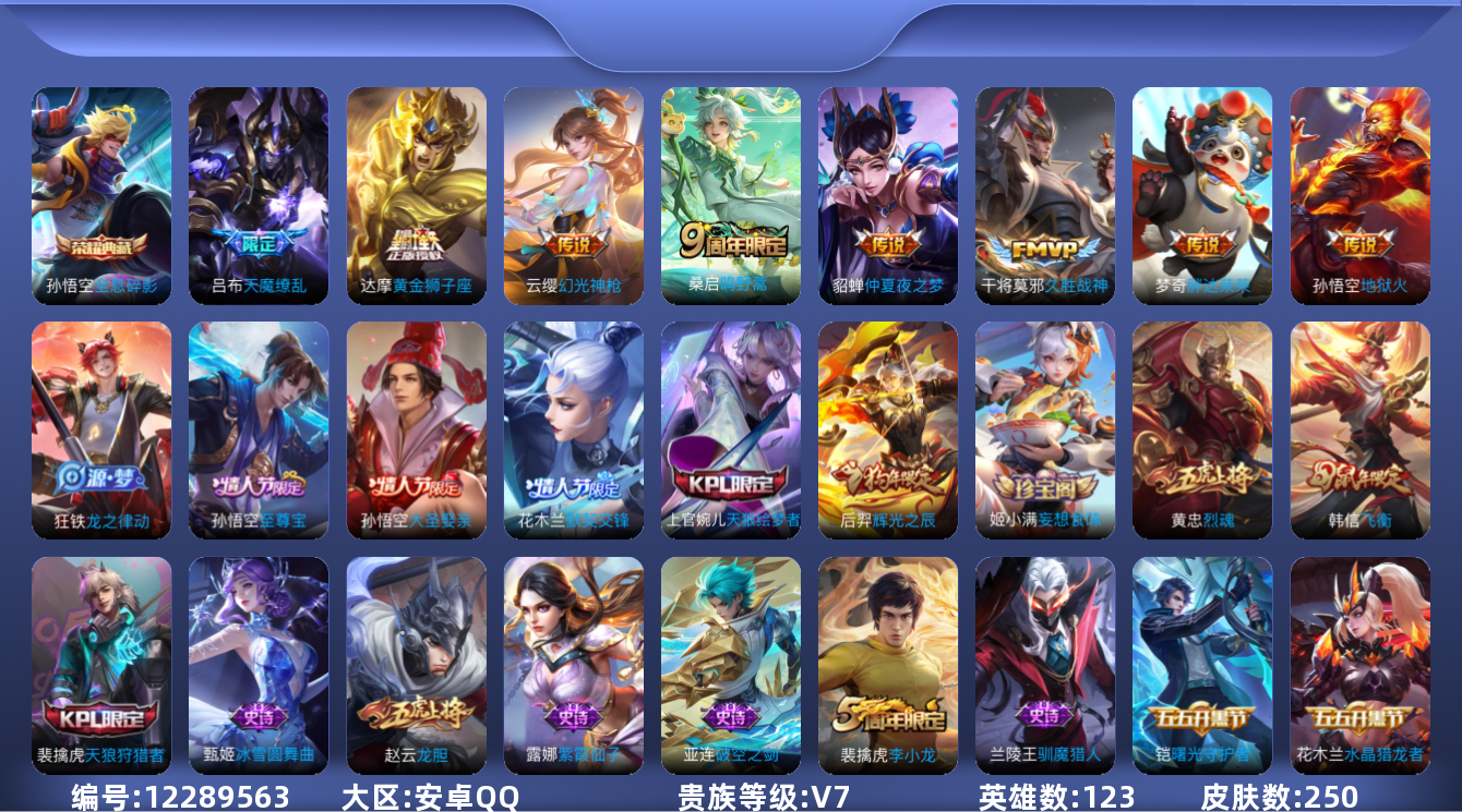 - PX_2068347-贵族等级: V7 英雄数: 123 皮肤数: 191 传说皮: 云鹰飞将,一念神魔,地狱火,山海·炽霜斩 限定皮: 李小龙,梁祝,神威,天狼绘梦者,大圣娶亲,傲雪梅枪,时之祈愿-瑶,山海·玄木吟