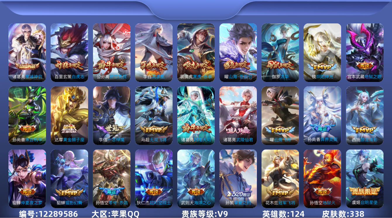 [12289586]V9 1典藏 27传说 124英雄 338皮肤 典藏英雄武则天 可修改实名 优质装备:星域神启(倪克斯贼亮),黄金狮子座,冠军飞将,云鹰飞将(小将军),黄金白羊座,猫影幻舞,炽阳神光,一念神魔,末日机甲-孙尚香(绿蚂蚱),地狱火,仲夏夜之梦(大飞蛾),零号·赤焰,海洋之心,地狱之眼,游龙清影(小青龙),超时空战士-狄仁杰,挚爱之约,无双飞将,山海·苍雷引(电光曜子) 珍宝阁皮:优雅恋人,玩趣恶龙 限定皮:至尊宝,白虎志(电光耗子),凤求凰(白切鸡),太华(伽罗年限),武陵仙君(小桃花),异界灵契(白毛香),傲雪梅枪,时之彼端,魔法小厨娘,时雨天司(水龙头),神威(电光马子),飞衡(韩信年限),遇见飞天,高山流水,五谷丰年,青龙志(铠年限),冰锋战神,天狼运算者,梁祝,御风骁将(吕布年限),祈雪灵祝(雪兔子),天狼绘梦者,李小龙,逐梦之影,辉光之辰,如梦令-嫦娥,默契交锋-花木兰,真爱至上,孙行者,一生所爱,大圣娶亲,青春决赛季,冰霜恋舞曲,蜜橘之夏,神奇女侠,匿光追影者,寅虎·赤拳(老虎年限),百木心枪,玉兔公主 史诗皮:龙之律动,紫霞仙子,苍穹之光,电玩小子(小书包),白龙吟,黄金分割率,千年之狐,永昼,匿光侦查者,魅语,蒙恬荣光圣徽,无限星赏官,冰冠公主,青蛇,偶像歌手,晚萤,暗夜猫娘,末日机甲-吕布,猫狗日记-孙策,猫狗日记-大乔,乱世虎臣,节奏热浪,修罗,女仆咖啡,摇滚巨星,水果甜心,绅士熊喵,天才门将,星夜王子,心灵骇客,时之奇旅-安琪拉,功夫厨神,德古拉伯爵,暗隐猎兽者,幽灵船长,鬼剑武藏,暗渊魔法,心灵战警,舞动绿茵,地狱岩魂,纤云弄巧,繁星吟游(呼啦呼啦),拒霜思,缤纷独角兽,乘风破浪,逐浪之夏,水晶猎龙者,热力回旋,箭羽风息,金属风暴,原初追逐者,圣诞狂欢,圣诞恋歌,鹰眼统帅,魅力维加斯,黎明之约,雪上飞焰,赏金猎手,奇遇舞章,天秀·音浪,千筹问战,无心,未来纪元-赵云