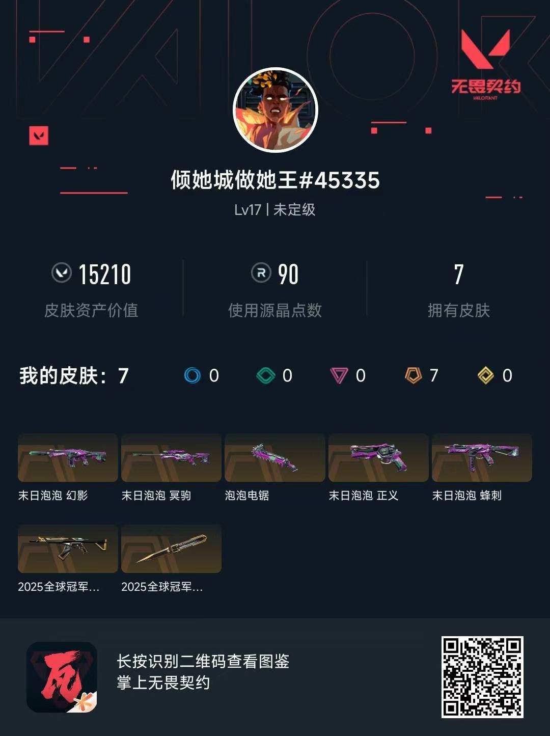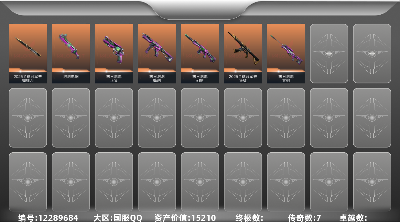 [12289684]7橙皮 7皮肤 11英雄 13卡面 90已用源晶 未定级 优质装备:2025全球冠军赛 蝴蝶刀,泡泡电锯,幻影-末日泡泡,冥驹-末日泡泡,正义-末日泡泡,蜂刺-末日泡泡,2025全球冠军赛 狂徒